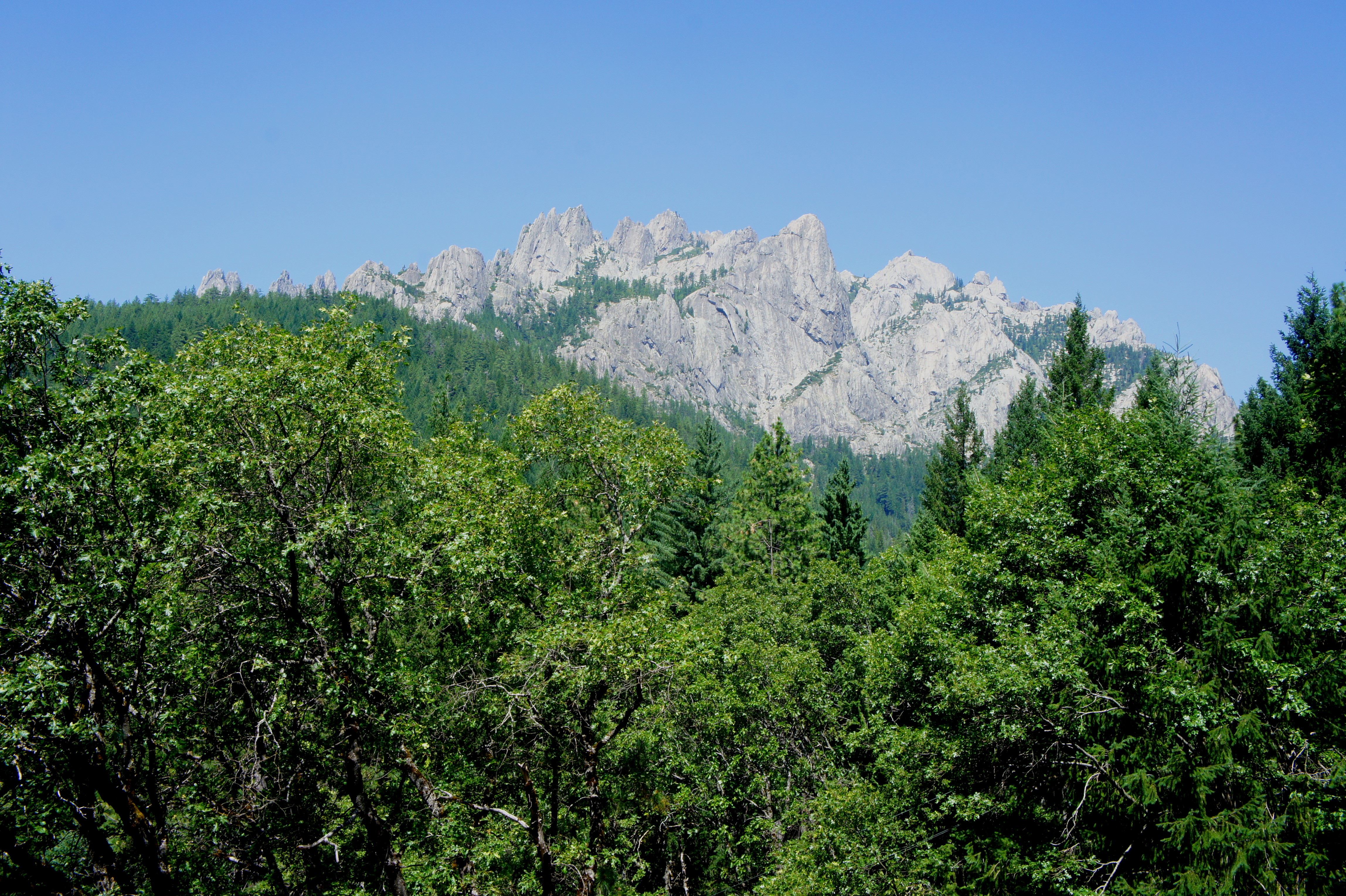 Situated just off Interstate 5 in northern California, Castle Crags State Park covers a scenic pocket of the Trinity Divide—a small but alluring mountain range that separates the Sacramento River and Trinity River watersheds. The star feature is a large outcrop of granite formations, technically situated outside the park, but visible from many of the park’s 12 hiking trails. The most easily accessible viewpoint is Vista Point, situated at the end of a short, wheelchair-accessible trail. The overlook offers views of three distinct landmarks: the pasty Castle Crags, the distant Gray Rocks, and the snowy behemoth of Mount Shasta.