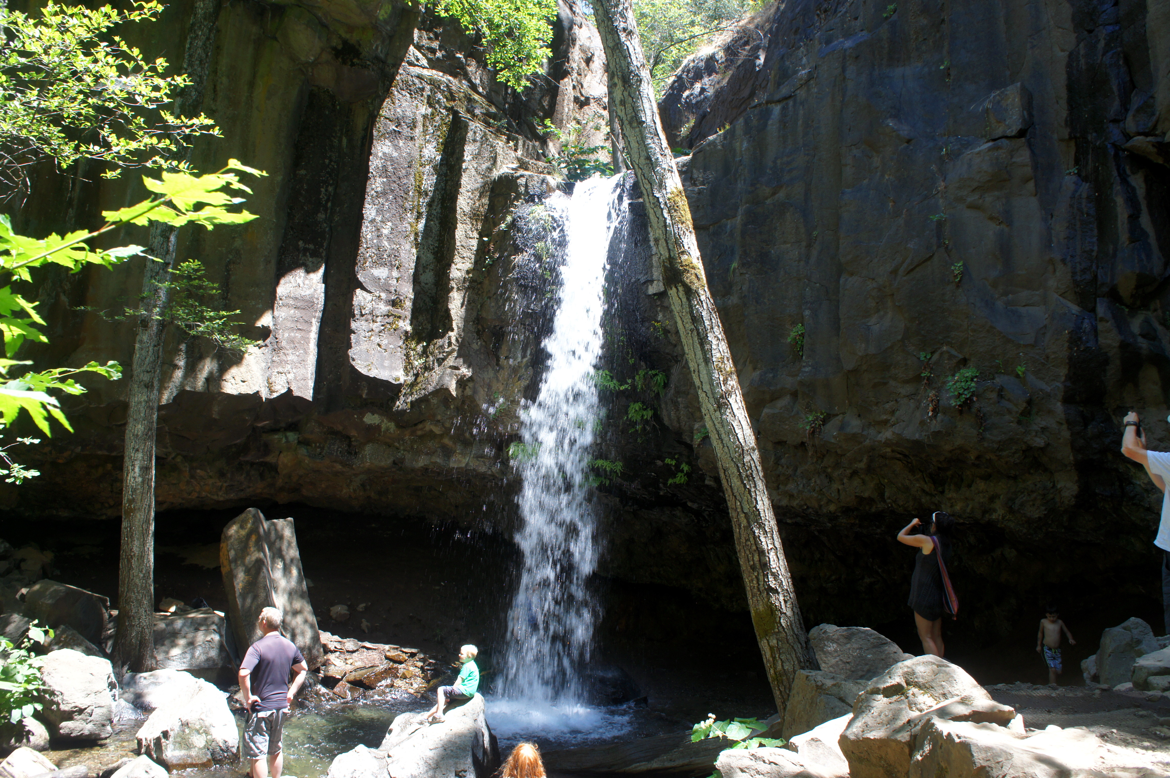 Within minutes, the sounds of rushing water can heard, and one can sneak a peek at the waterfall at the end of a first switchback. The trail briefly doubles back to the west, then rounds a second bend and continues on its eastward course. After just 250 yards of hiking, the path approaches Hedge Creek Falls.