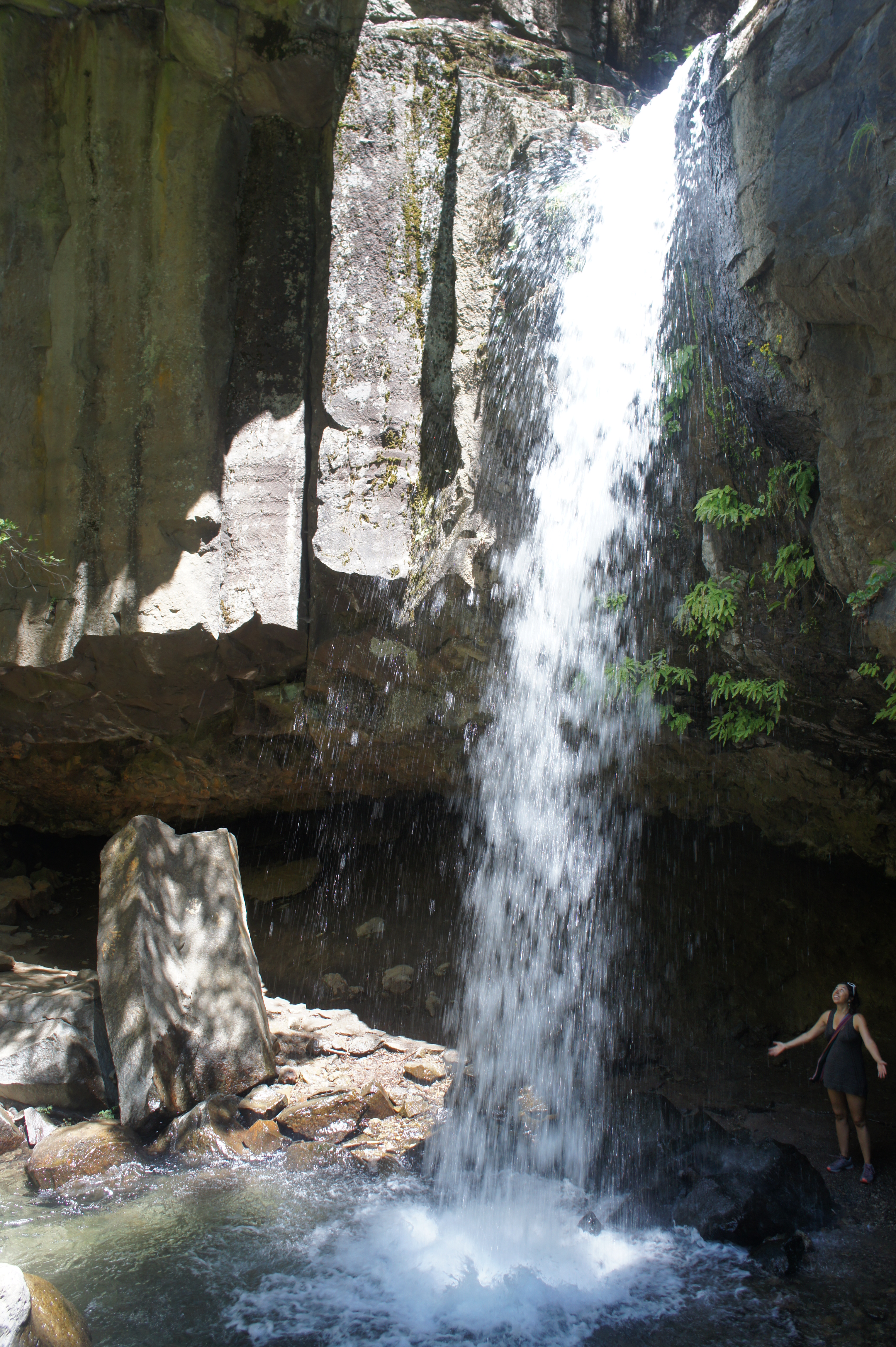 The waterfall is a single chute that drops 35 feet into a cavernous pool. The trail leads right up to the falls and circles it from behind, offering a cool place to take in the beautiful sight. The cliff from which the falls drops is composed of columnar basalt, a legacy of the area’s volcanic past.