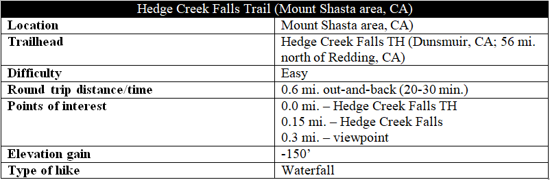 While Hedge Creek Falls is the main attraction, the trail is only halfway done. After wrapping around the falls, the footpath hugs Hedge Creek as it bears downstream over a series of minor cascades. Culminating at 3/10 mile, the path ends abruptly at a viewing platform overlooking the confluence of Hedge Creek and the Sacramento River. On clear days, Mount Shasta (14,180’) looms in the distance, though it is obscured by trees, while an active railroad lines the opposite bank. (Note: To get an untarnished vista of Mount Shasta, climb the rocky jumble to the right of the observation deck. The extra height gets you above the trees and offers a clear view of the snowy behemoth.)