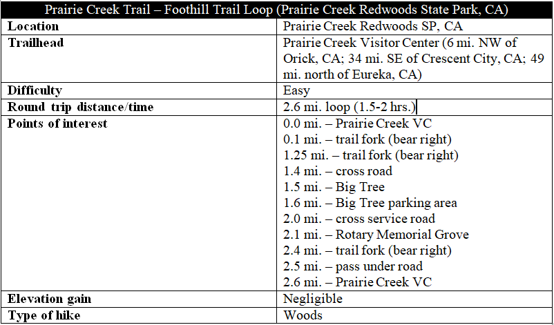 Allot at least 1.5-2 hours for this magical hike, a terrific introduction to the coast redwoods of the Prairie Creek area.