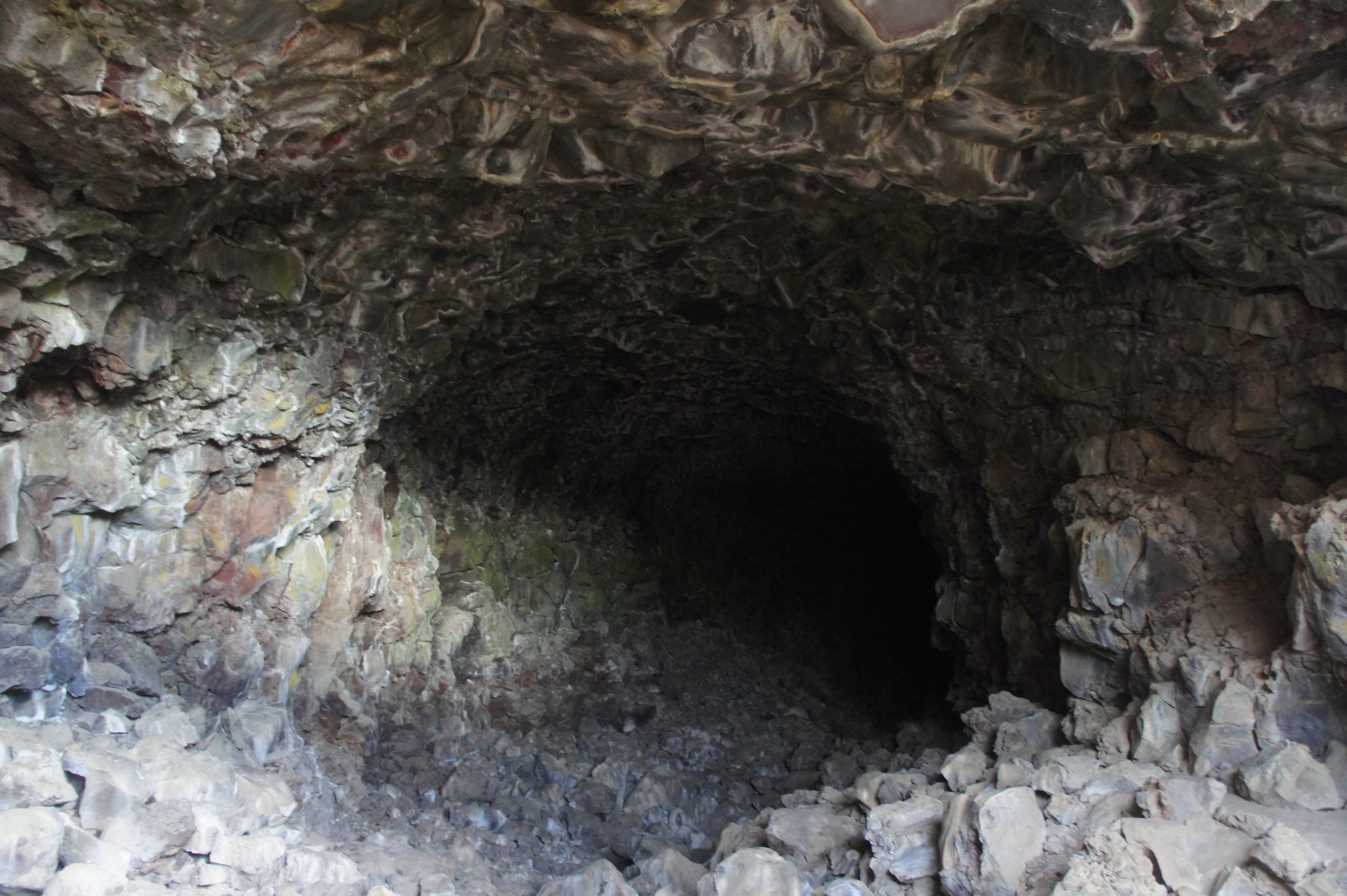 About 50 yards from the start, the Skull Cave Trail zig-zags through the entrance, then hugs the right side of the lave tube as the grade levels out. Once inside, the temperature drops considerably. About 1/10 mile from the trailhead, now in full darkness, you will reach a flight of stairs that brings hikers down to the lower level of the cave, passing directly under a natural bridge.
