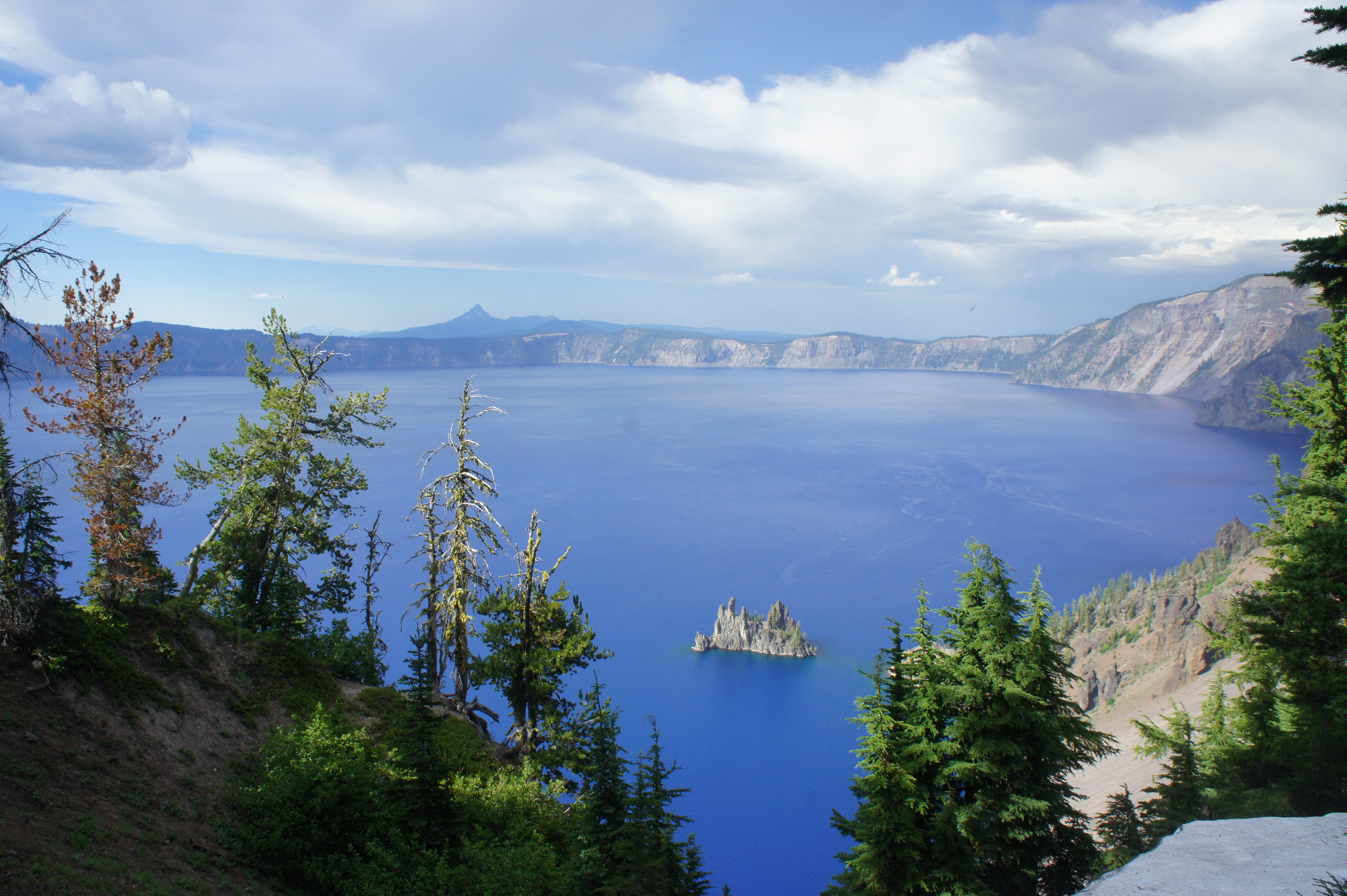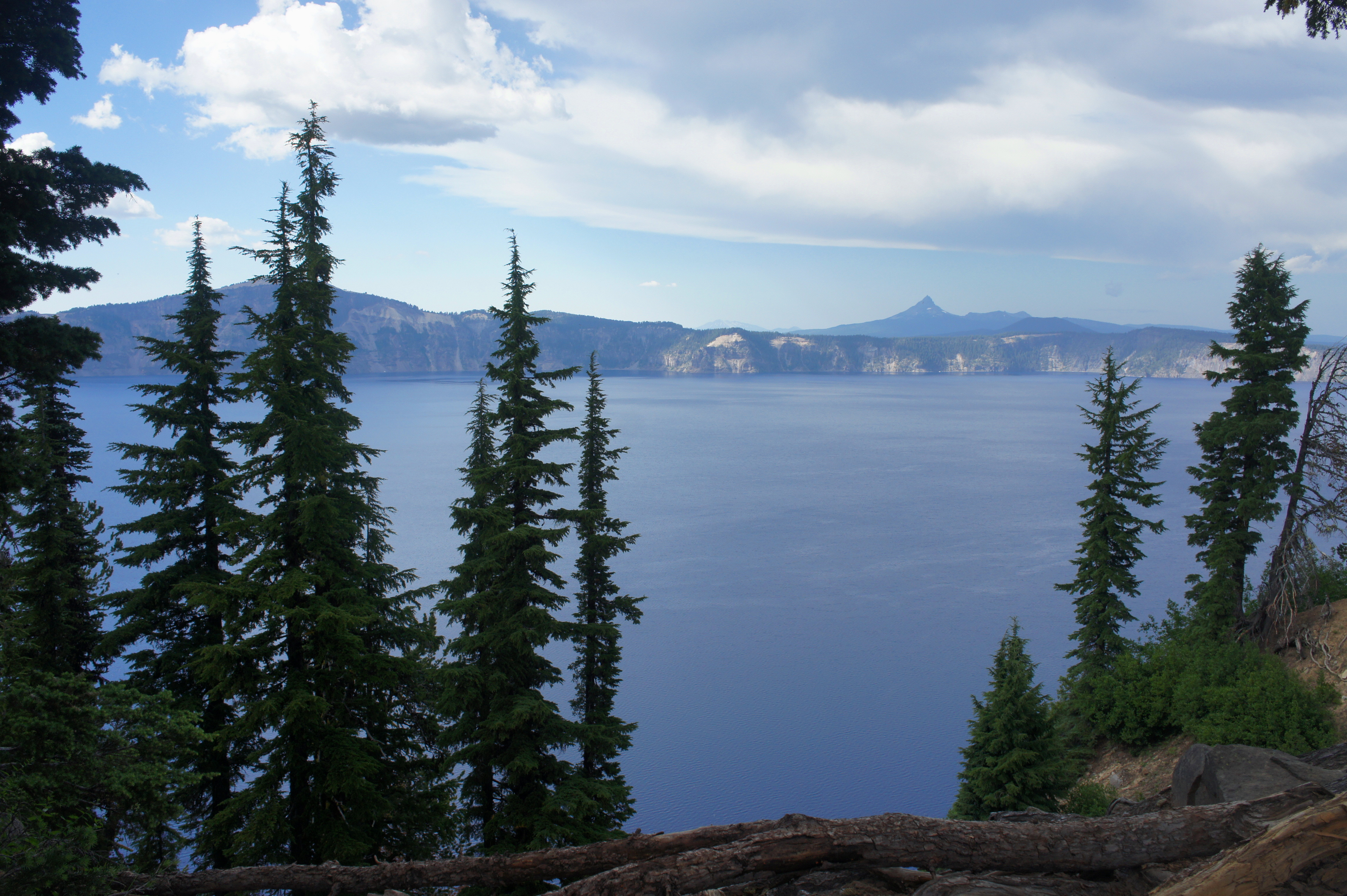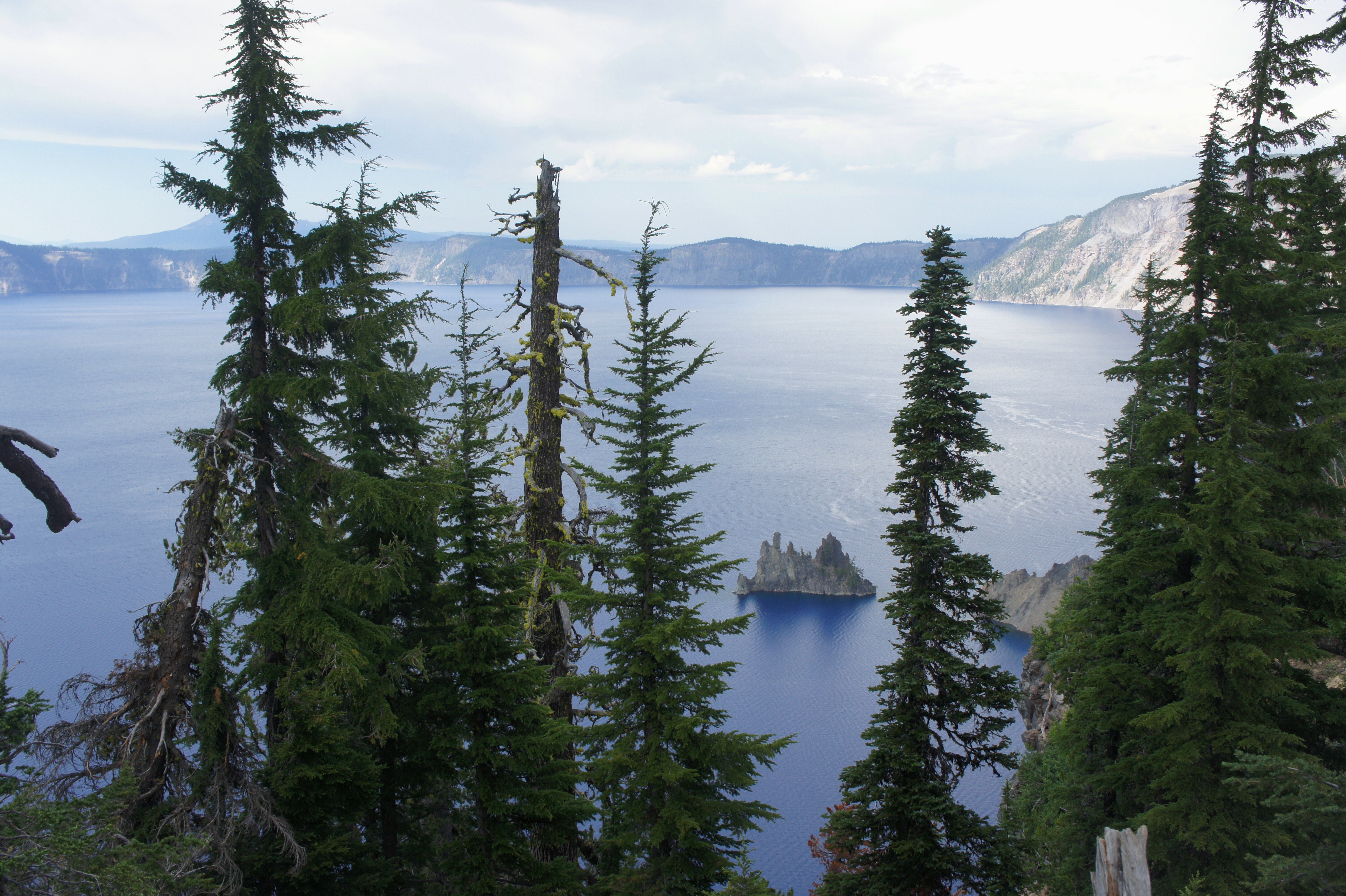 The second viewpoint, situated a minute up the trail, provides a clear view across Crater Lake to sharp-sided Mount Thielsen (9,182’), the highest peak in the area. A third vista, just steps farther, peeks through an aperture to the northwest, where Wizard Island (6,940’) and Hillman Peak (8,151’) come into view.