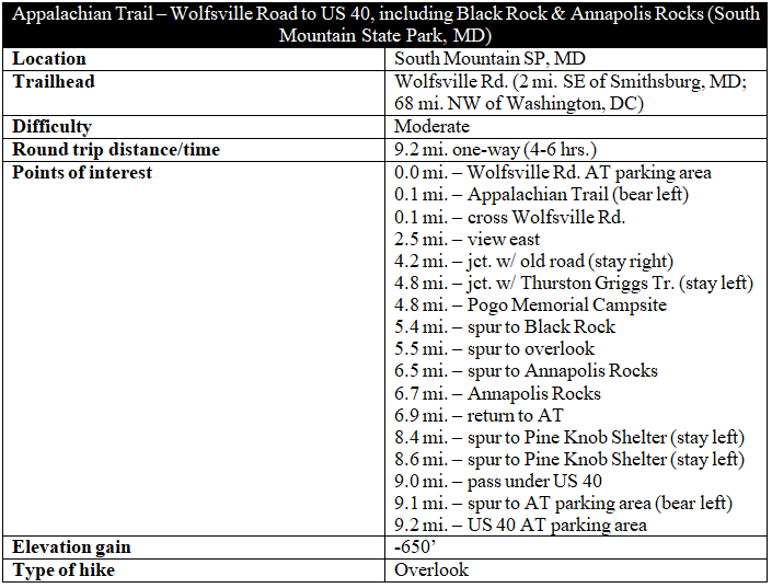 One hundred yards down the road, you will reach the AT parking area along US Highway 40, sure to packed on a nice summer afternoon. Hopefully you will have left a second car here to shuttle back to the start; if not, turn around and retrace your steps—for 9.2 miles—back to Wolfsville Road. Allot between 4-6 hours for the one-way journey.