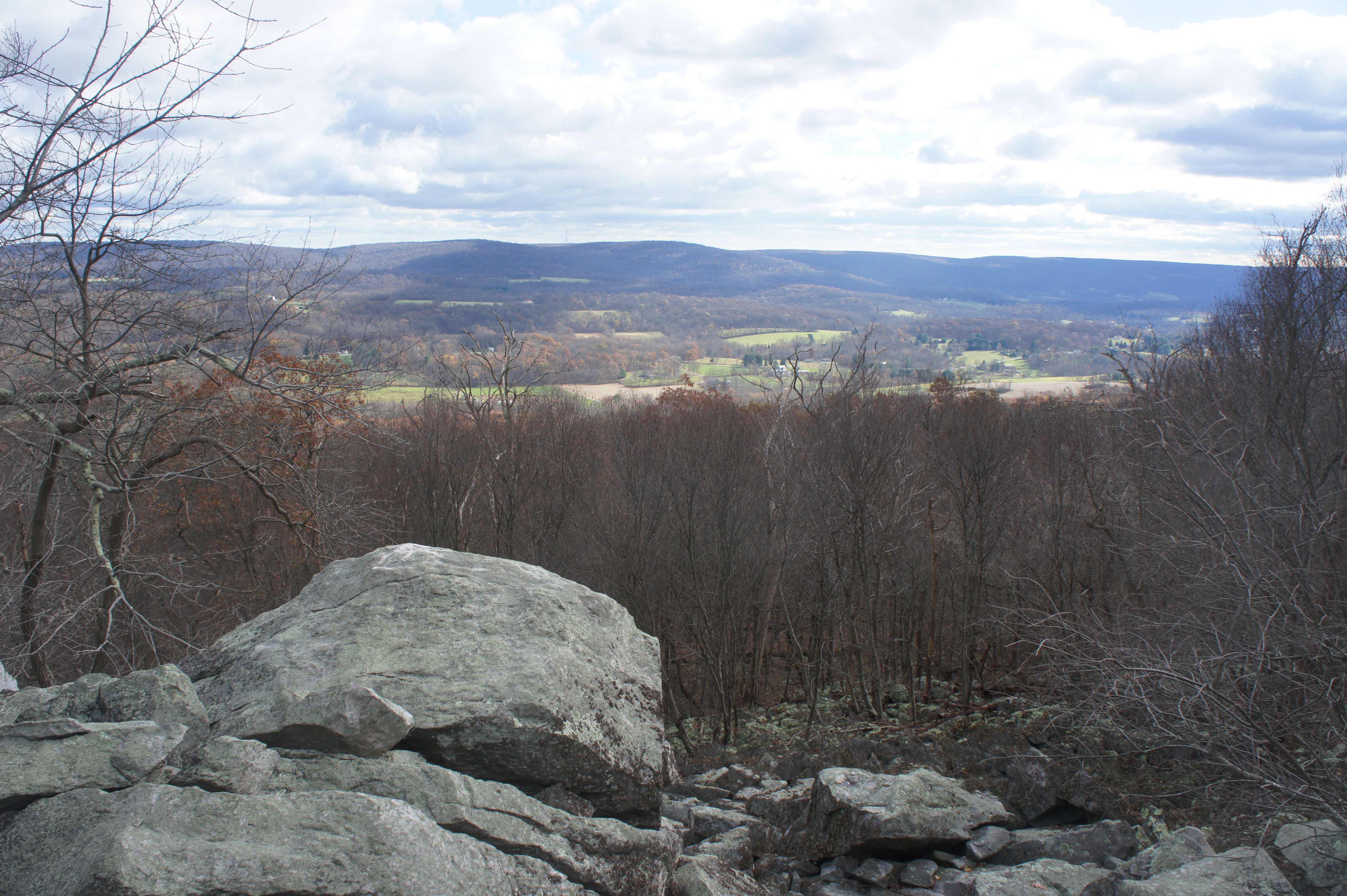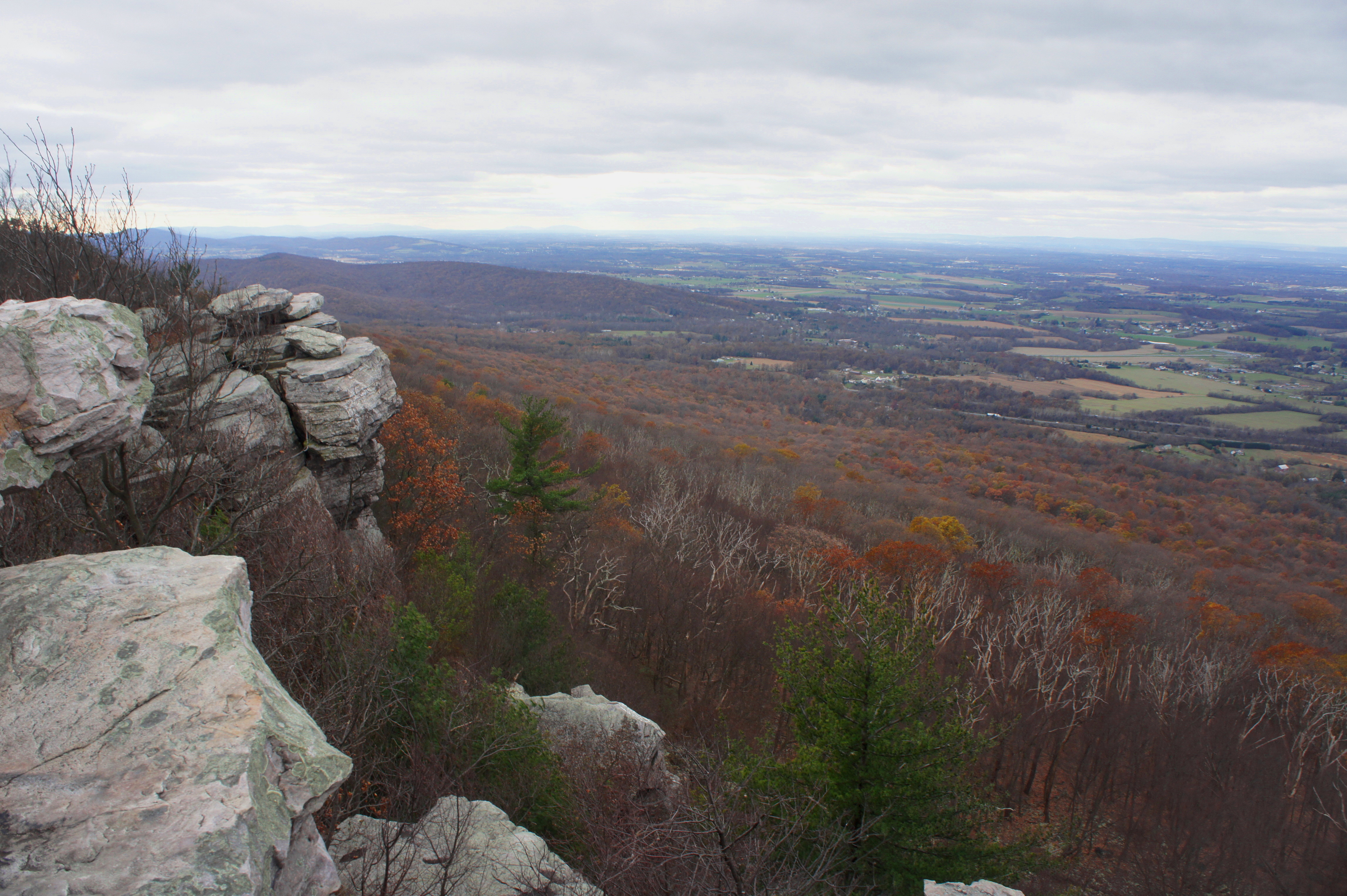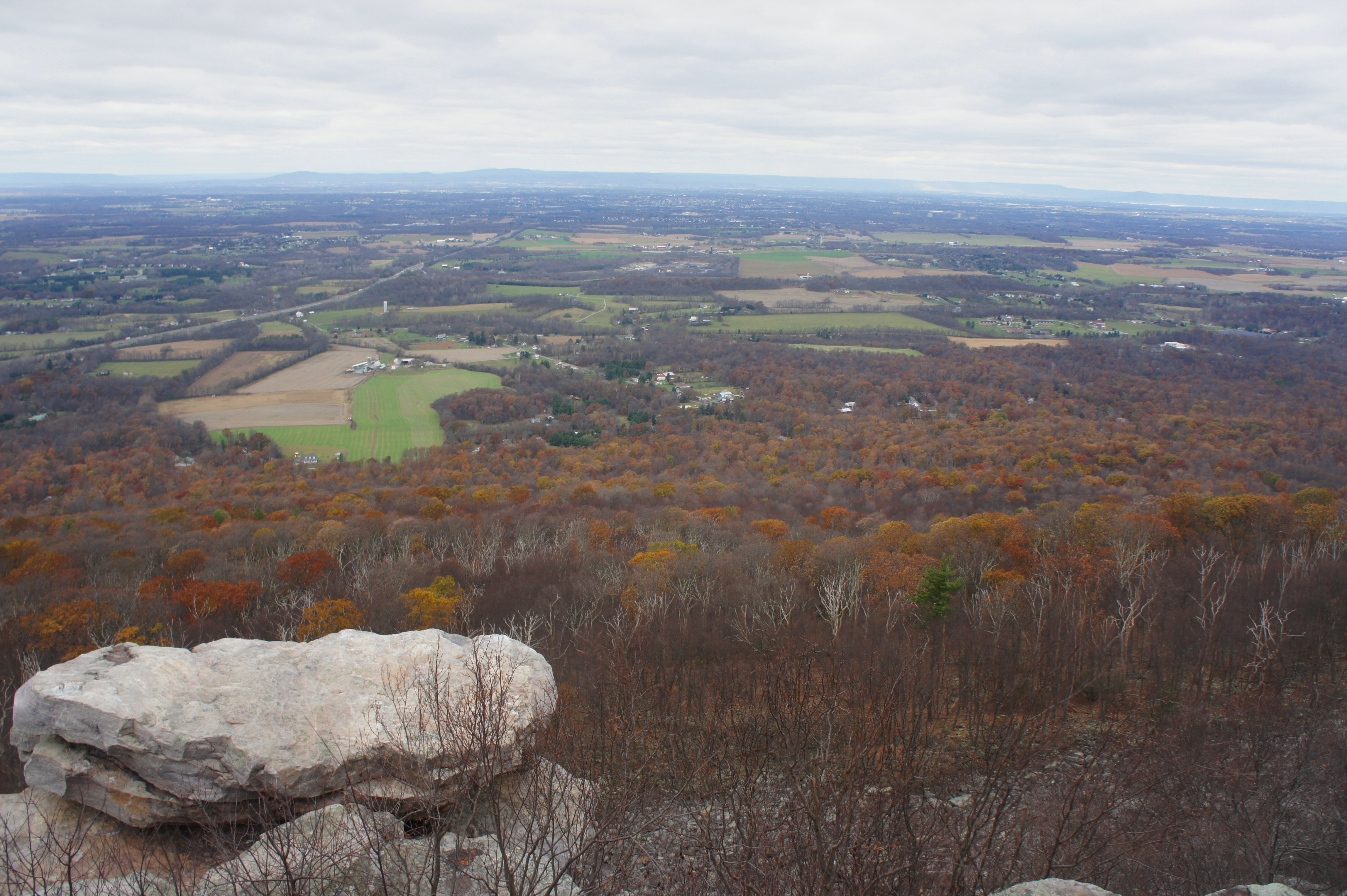 From Black Rock, Cumberland Valley appears stitched together by a patchwork of forest and farms, with the distant North Mountain and Bear Creek Mountains forming its western flank. Interstate 70 stretches out across the valley toward Hagerstown, Maryland, the largest town in the area. (Note: Cumberland Valley is alternatively known as Hagerstown Valley.) To the southwest, one can see as far as the West Virginia panhandle and northern Virginia beyond.