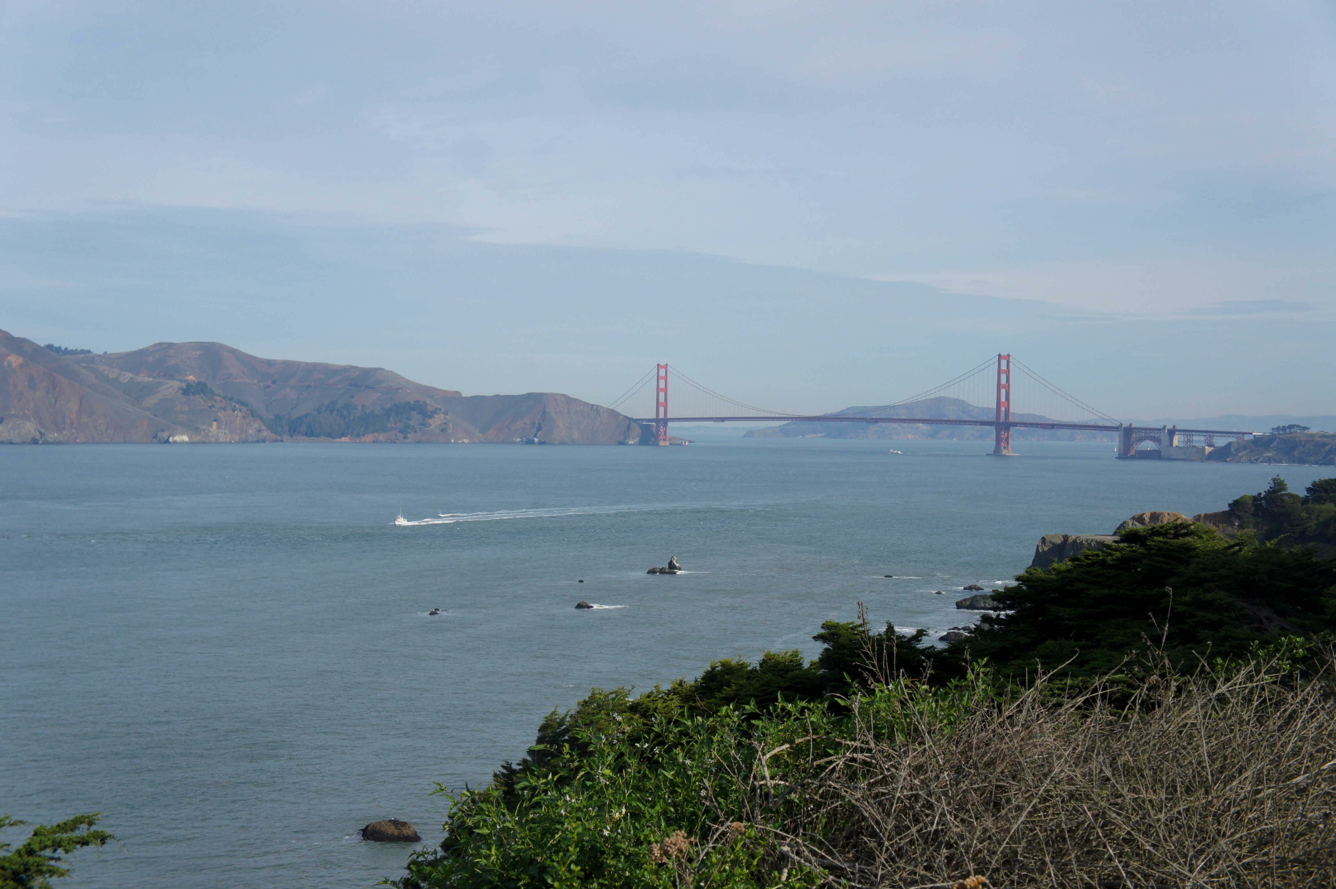 Passing under a cypress canopy, the Coastal Trail winds eastward to the Coastal Trail Overlook, first of several viewpoints of the Golden Gate Bridge. The iconic structure, constructed in 1937, connects San Francisco to the hilly Marin Peninsula and serves as the divider between San Francisco Bay to the east and the Pacific Ocean to the west. On a clear day, one can see as far west as Point Reyes and the Farallon Islands. (Note: The staircase that comes in from the right offers access to the USS San Francisco Memorial, which commemorates the 106 Americans killed in the WWII Battle of Guadalcanal.)