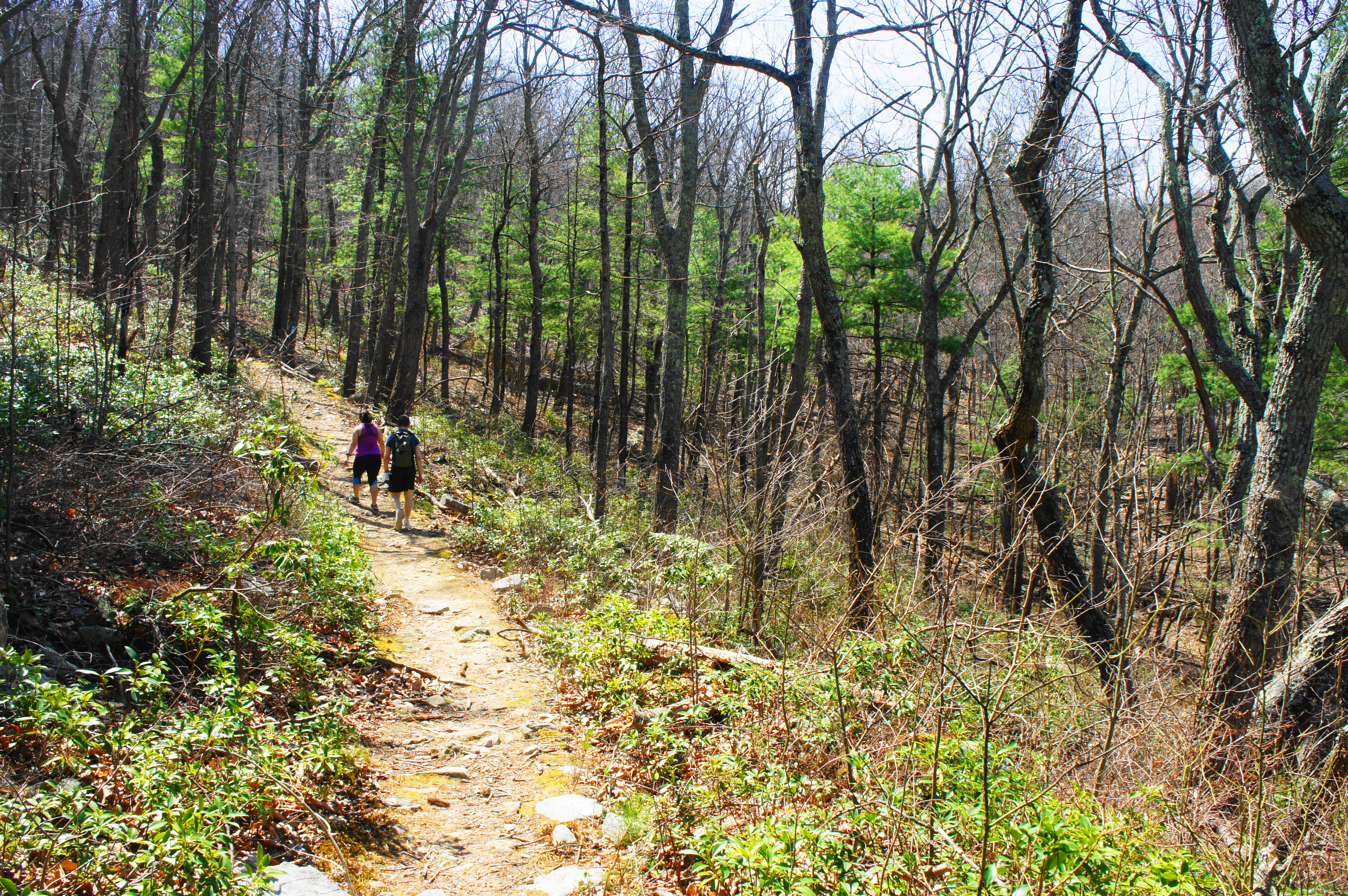 Keeping its distance from the creek, the orange-blazed path bears southwest in and out of occasional patches of mountain laurel, flattening out a bit at around 3.2 miles before resuming a steady climb. Much of the tree growth in this area is relatively new, and one can spot patches of old growth that were lost to a relatively recent forest fire. As a result, much of this climb is in nearly full sun, making for a tough slog on a hot day.