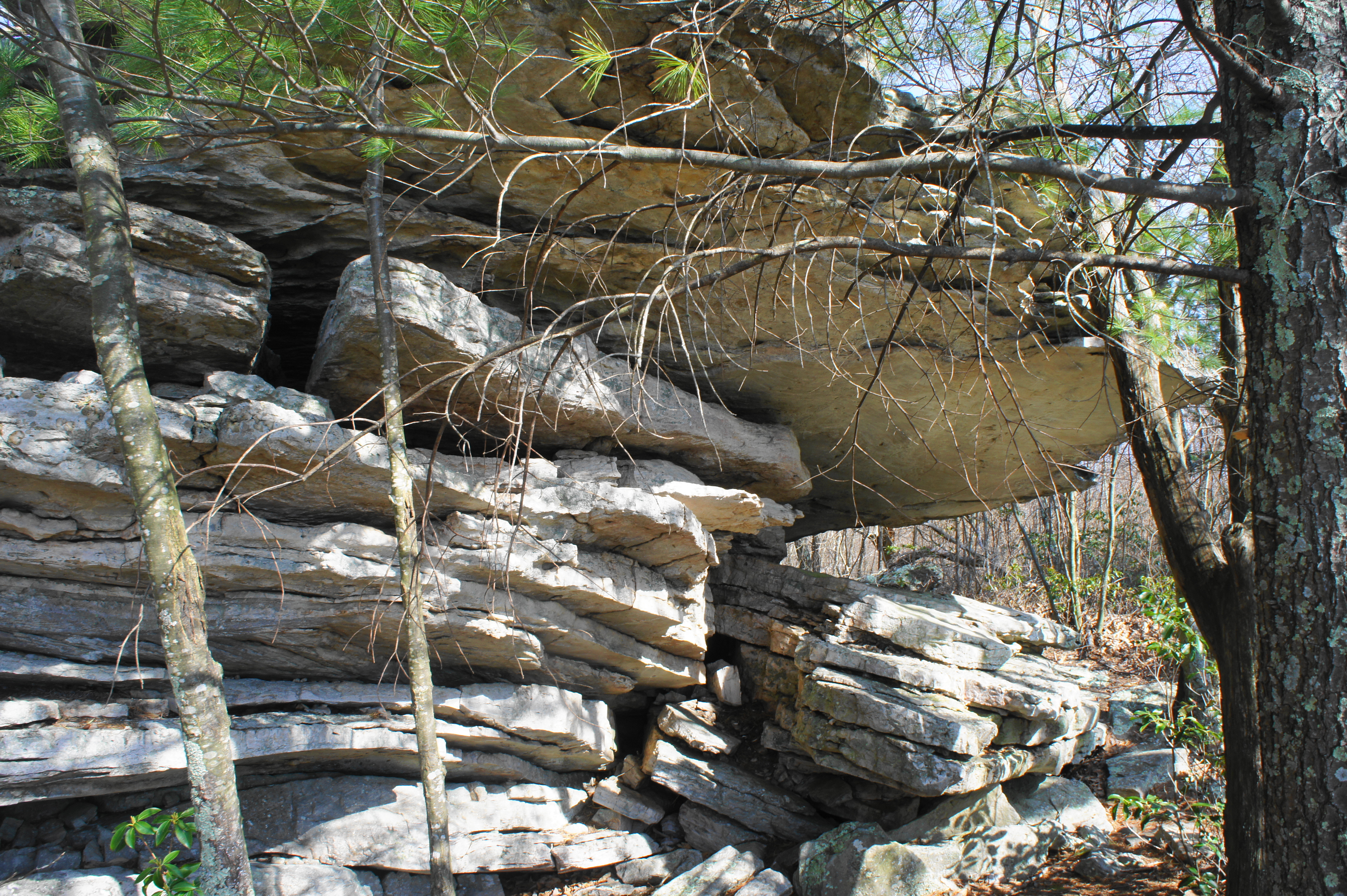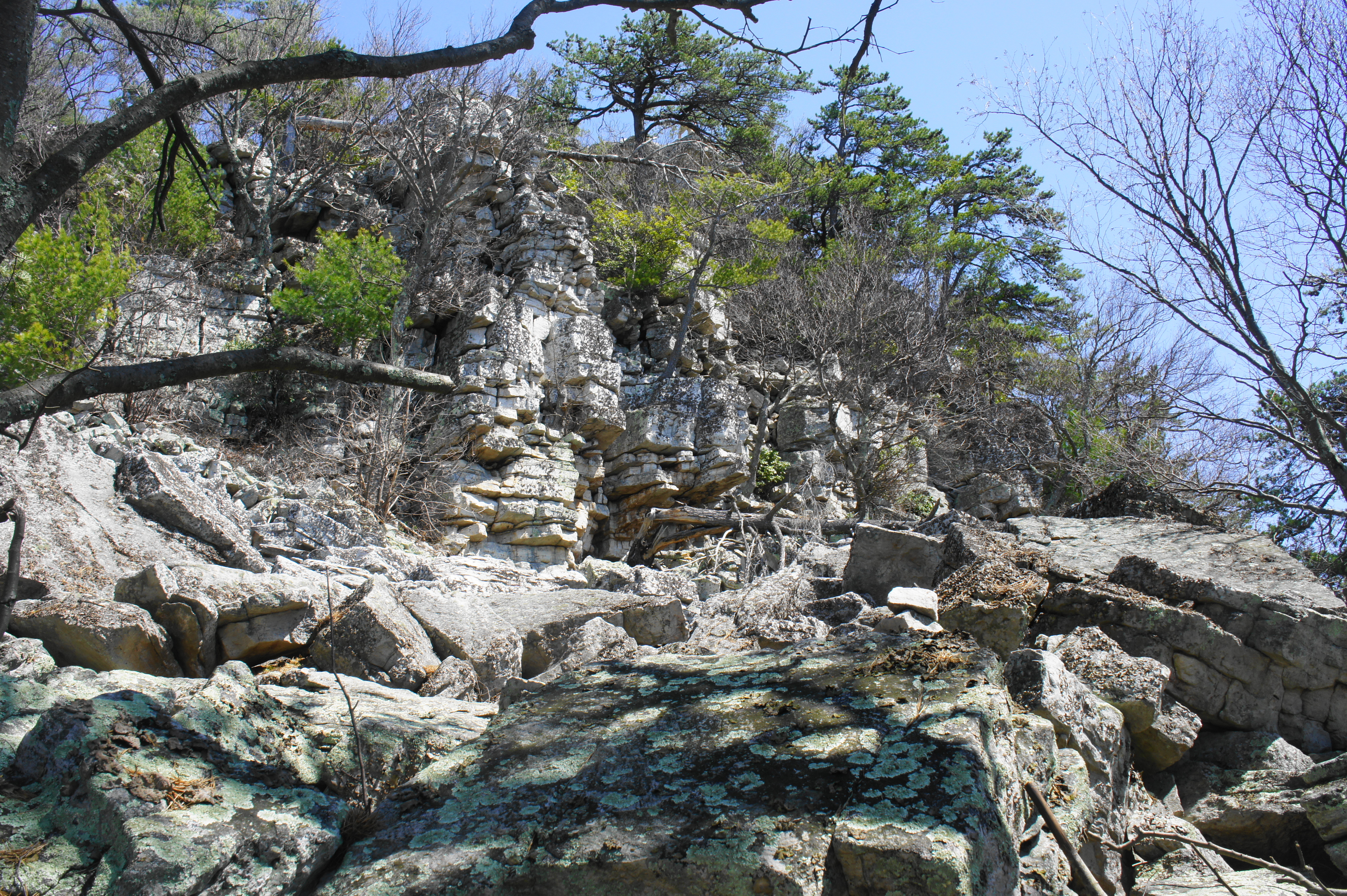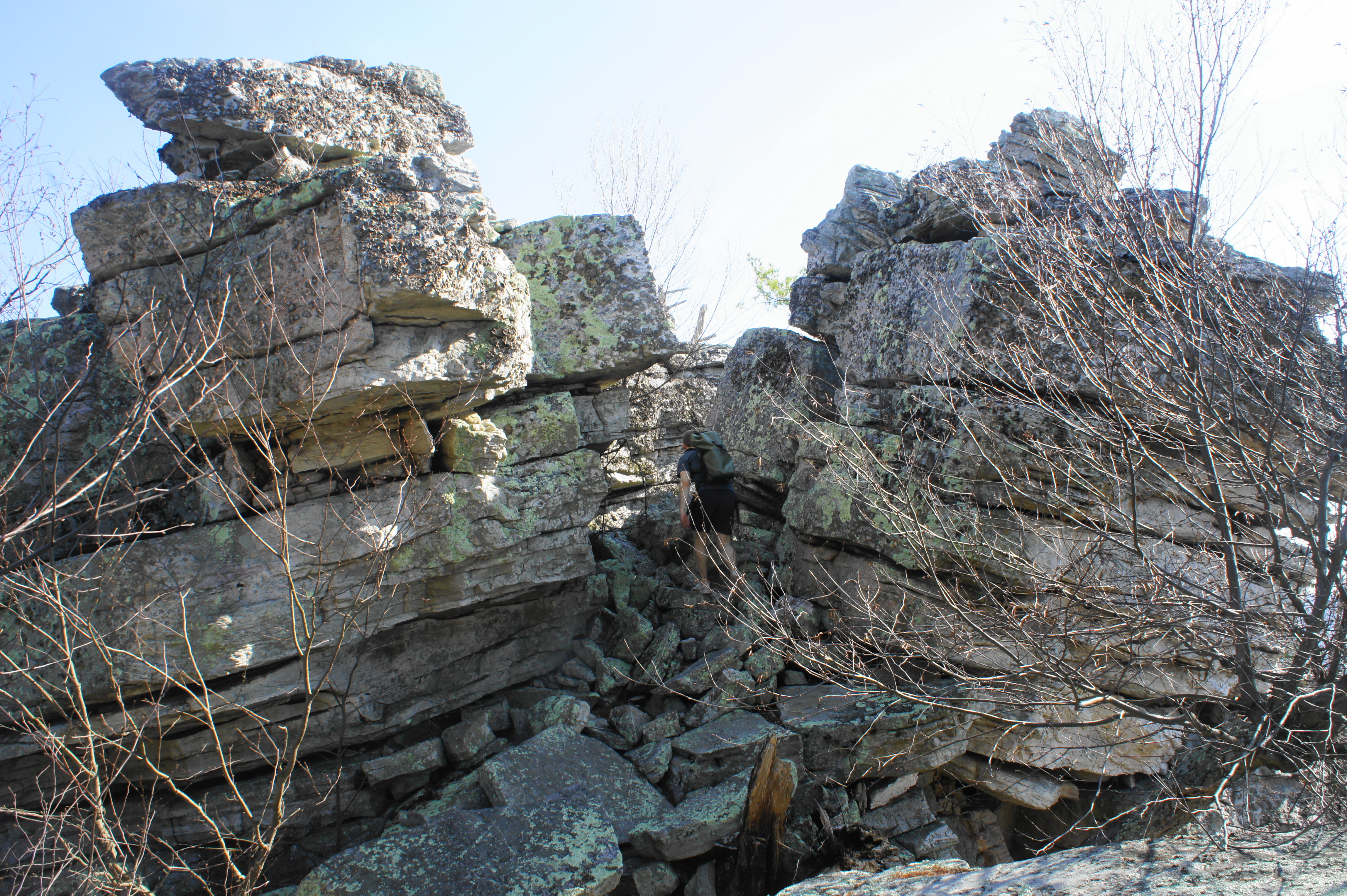 Here the path splits. To visit Duncan Knob first, bear left on the white-blazed spur. From here it is a short but steep ¼ mile to the summit; this section covers includes around 300 feet in elevation gain. At first the ascent is gradual, passing a nice campsite on the right. At about 1.65, however, the woods suddenly give away to a rocky jumble and massive sandstone talus slope. The summit is now visible atop a jagged rock wall.