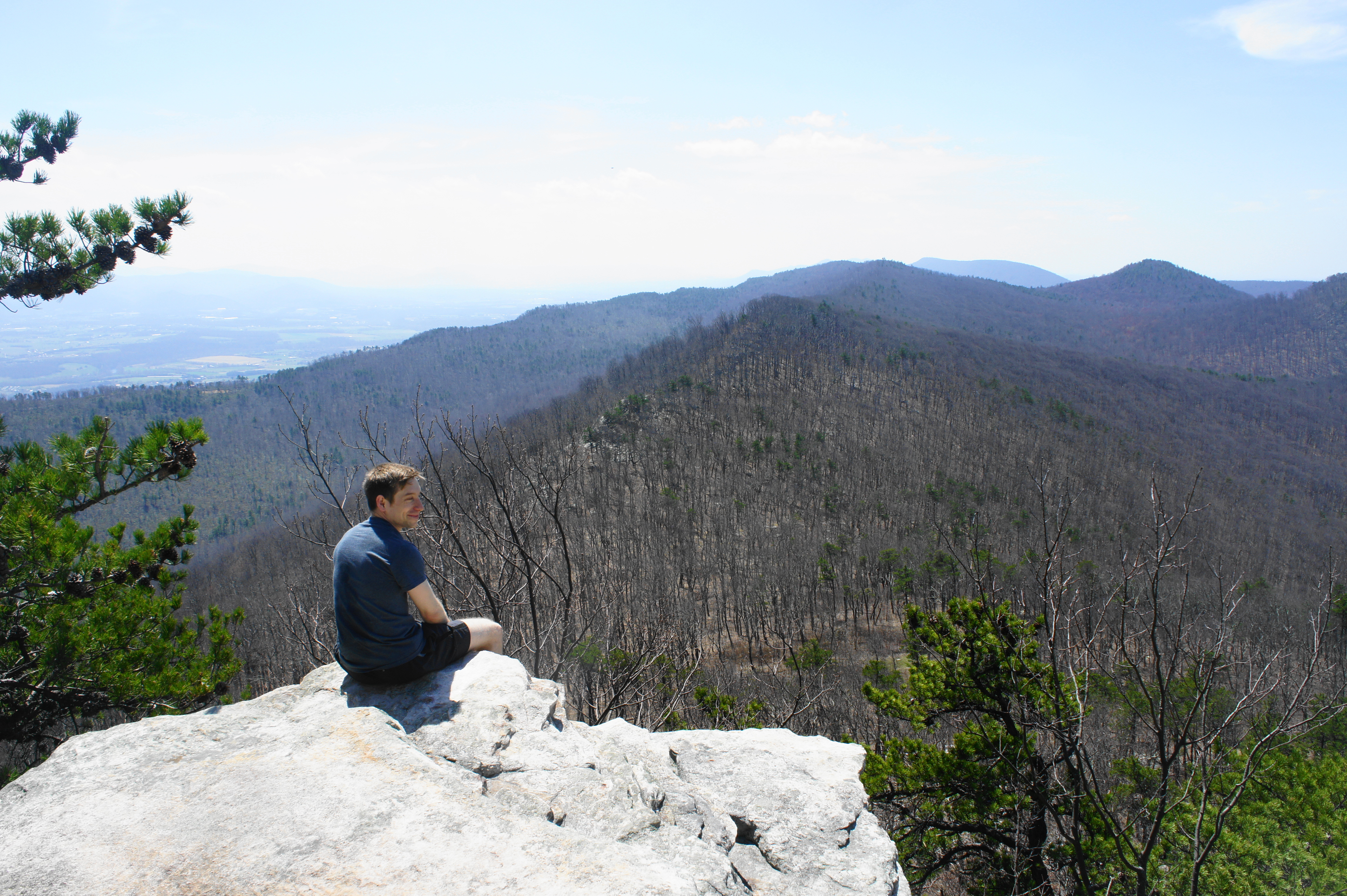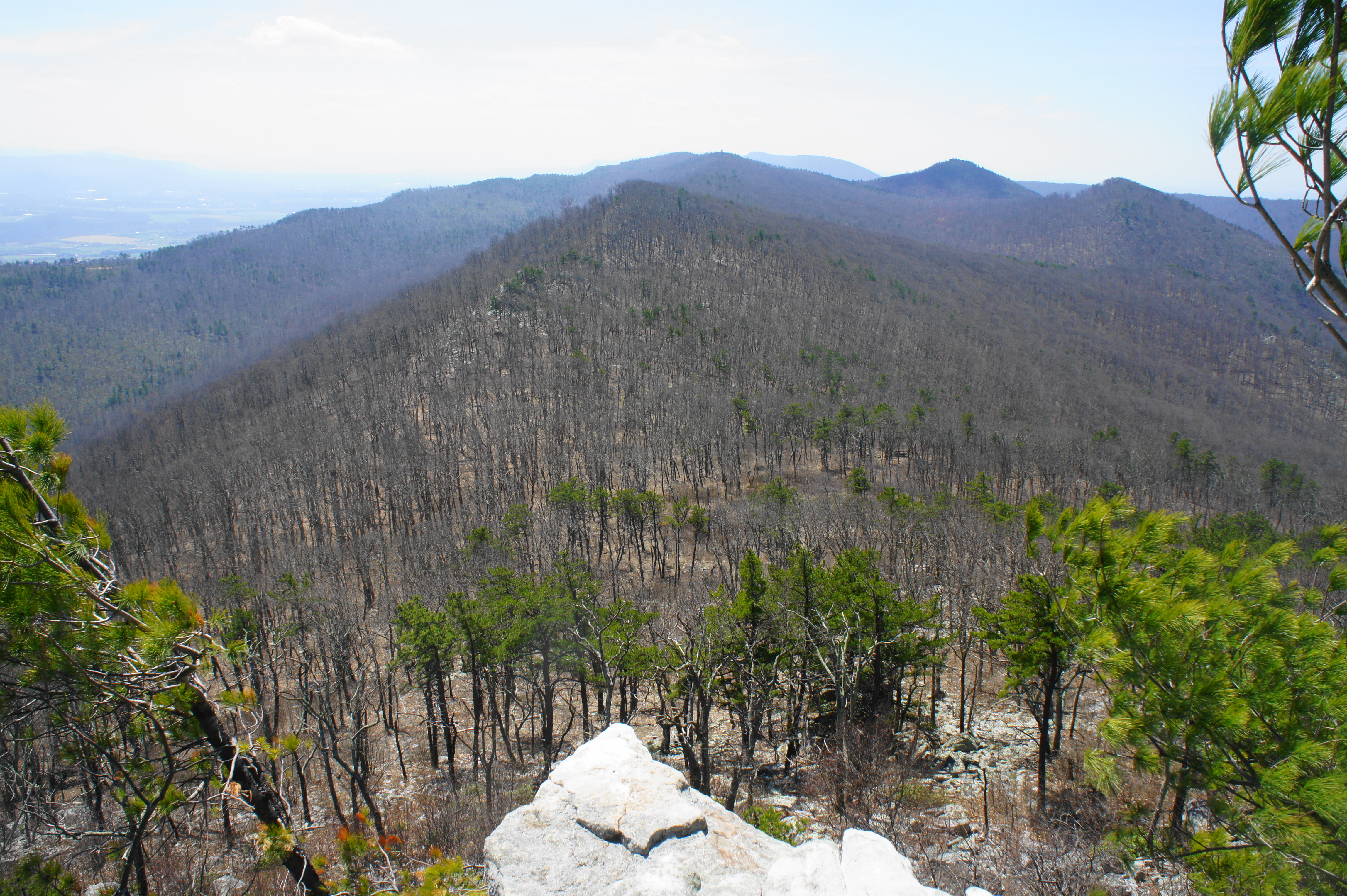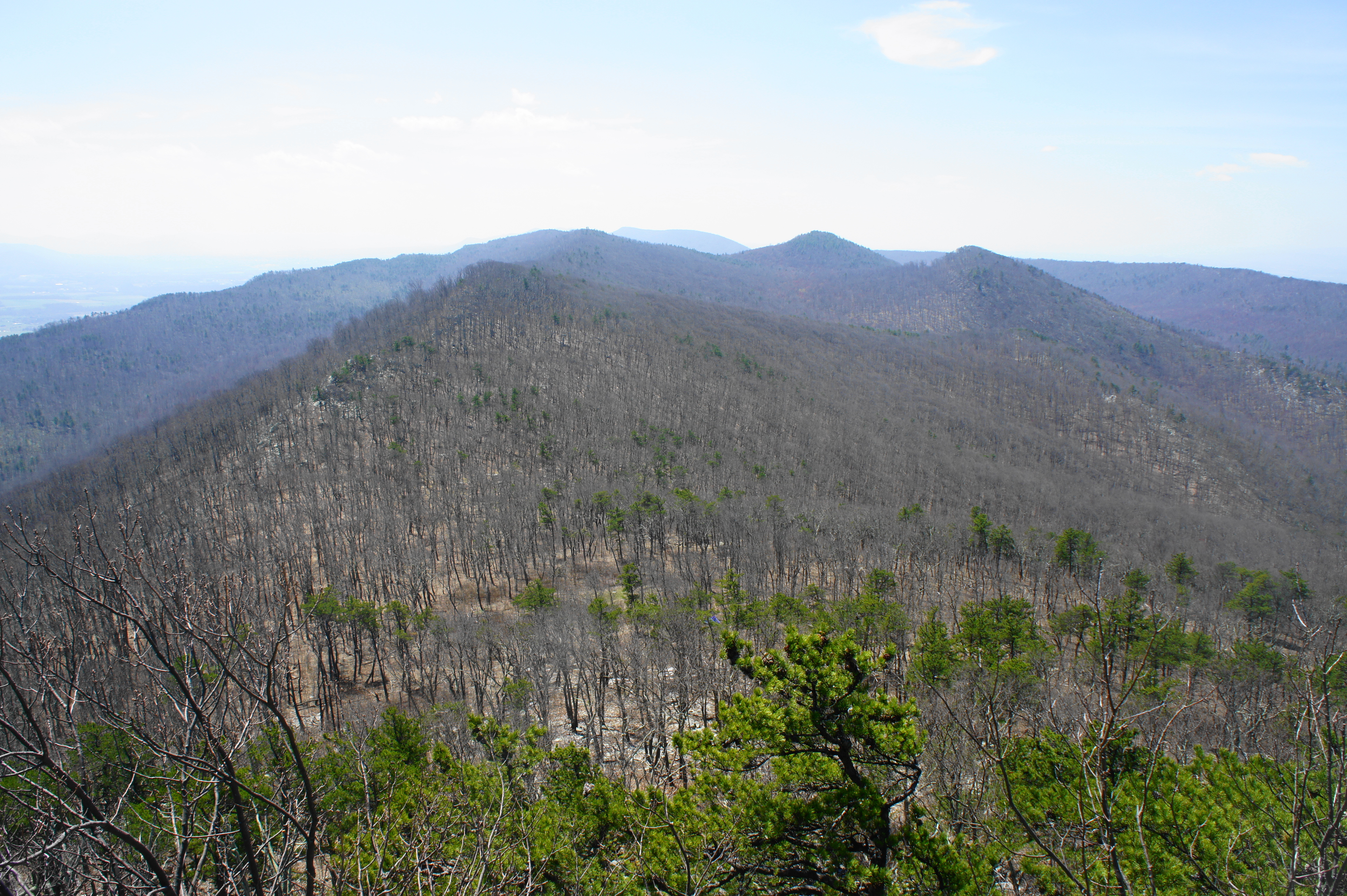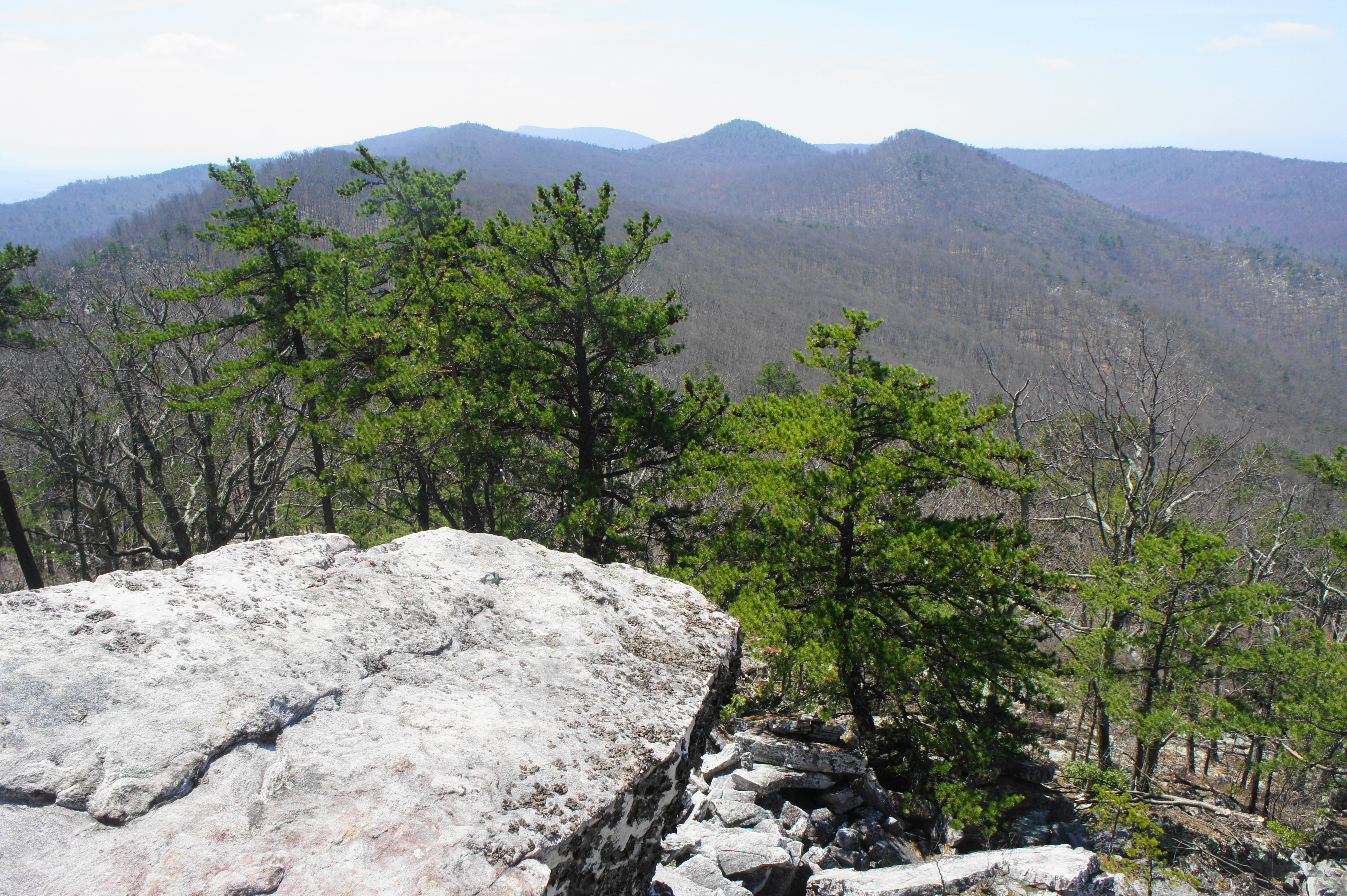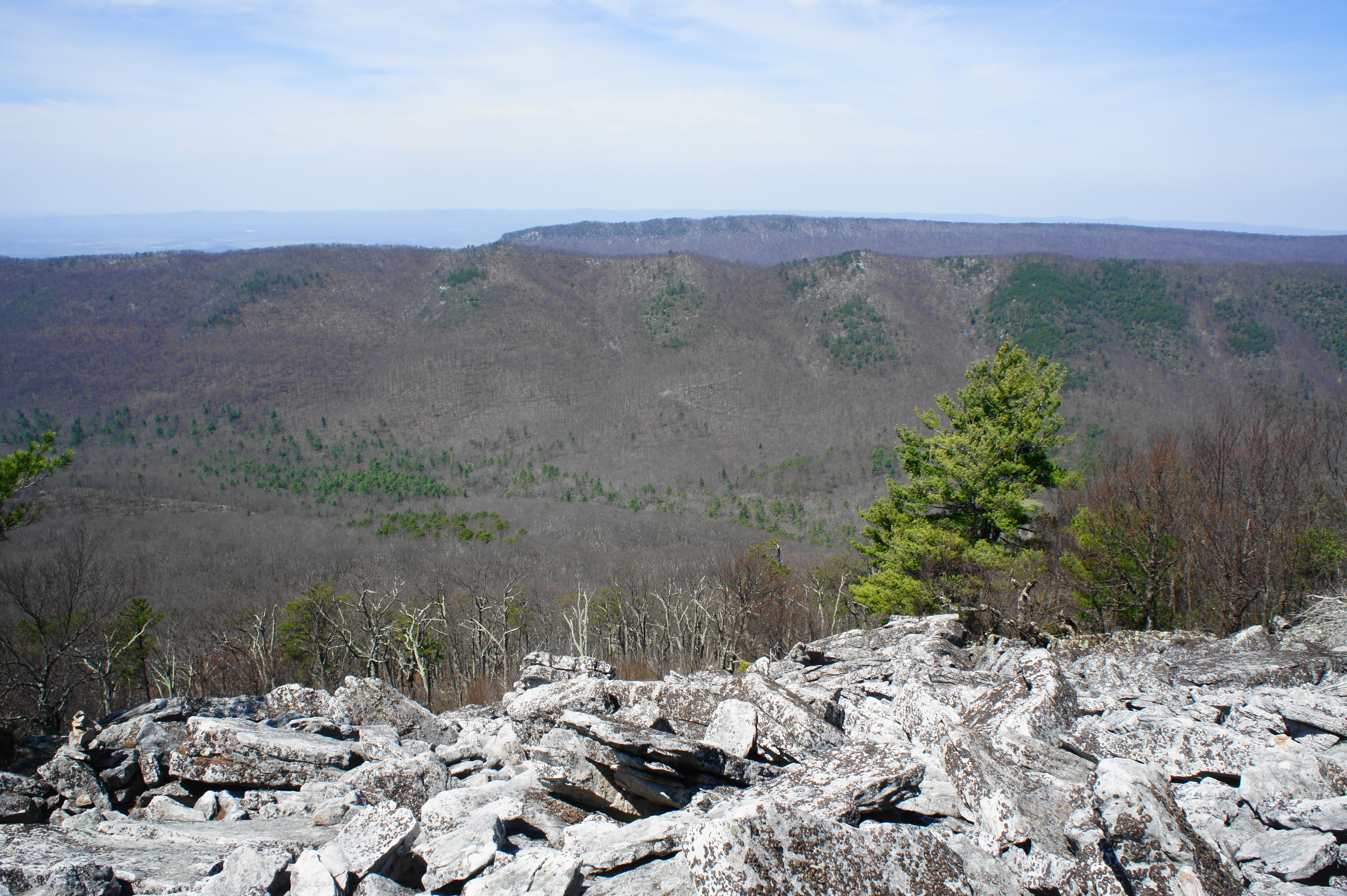 The spur involves little elevation gain or loss but a whole lot of rocky traverses as the trail follows a sandstone ridgeline out to the knob. The winding path passes a series of false summits and rock outcrops, finally reaching the first views at about 5.5 miles. Here a rock outcrop overlooks a tree-lined valley, with neatly parallel Waterfall Mountain beyond. The mountains of West Virginia dot the horizon to the west, while Big Mountain dominates the landscape to the south.