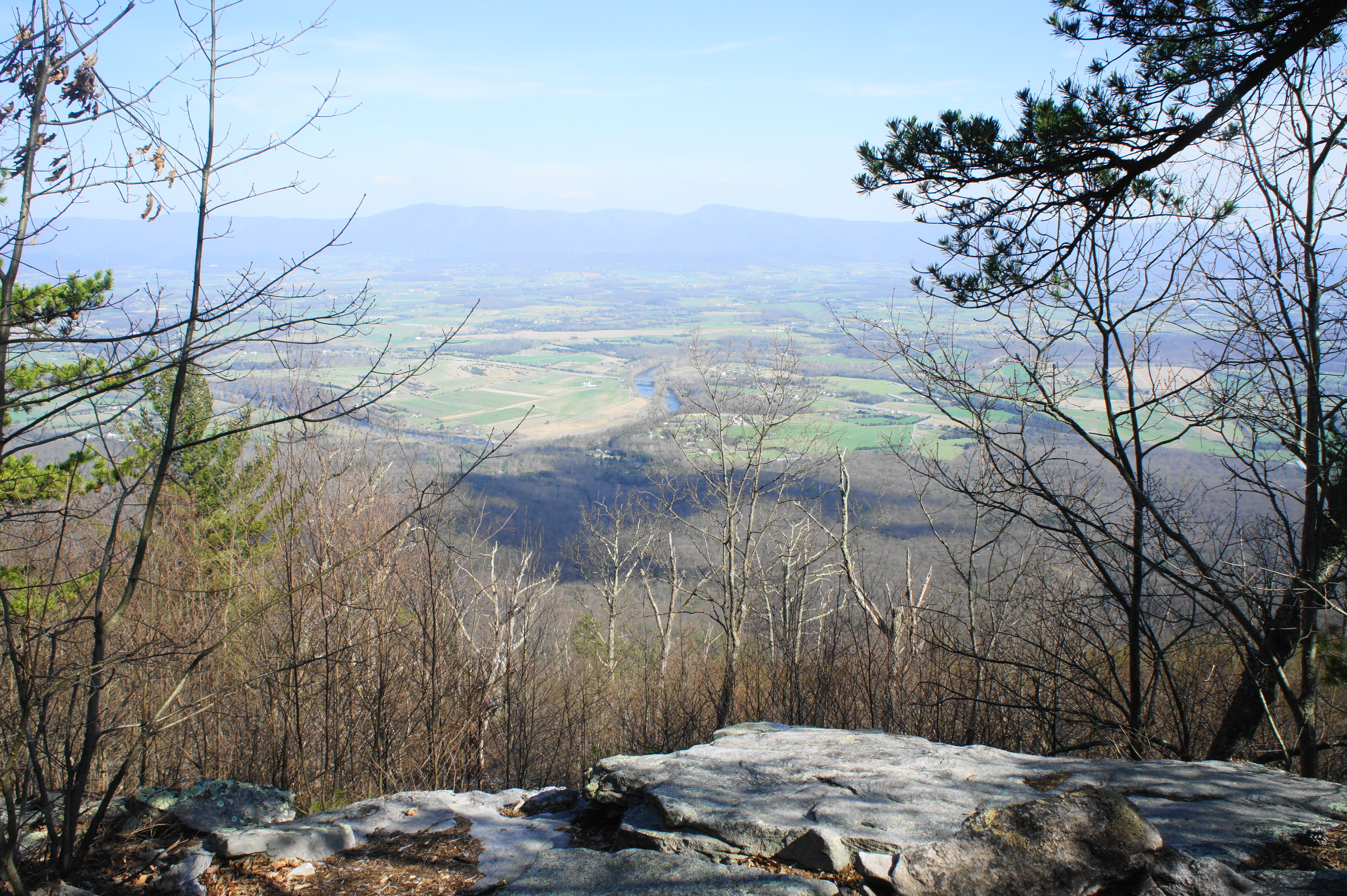This lovely view is only a preview of what’s to come, however, and the trail continues across the ridgeline to the east-facing side at about 5.6 miles. Here a fine campsite, complete with a fire pit, overlooks the Shenandoah Valley, with the Shenandoah River neatly framed by the gap in the trees. This is another outstanding vista, but it’s again only a small flavor of the finale.