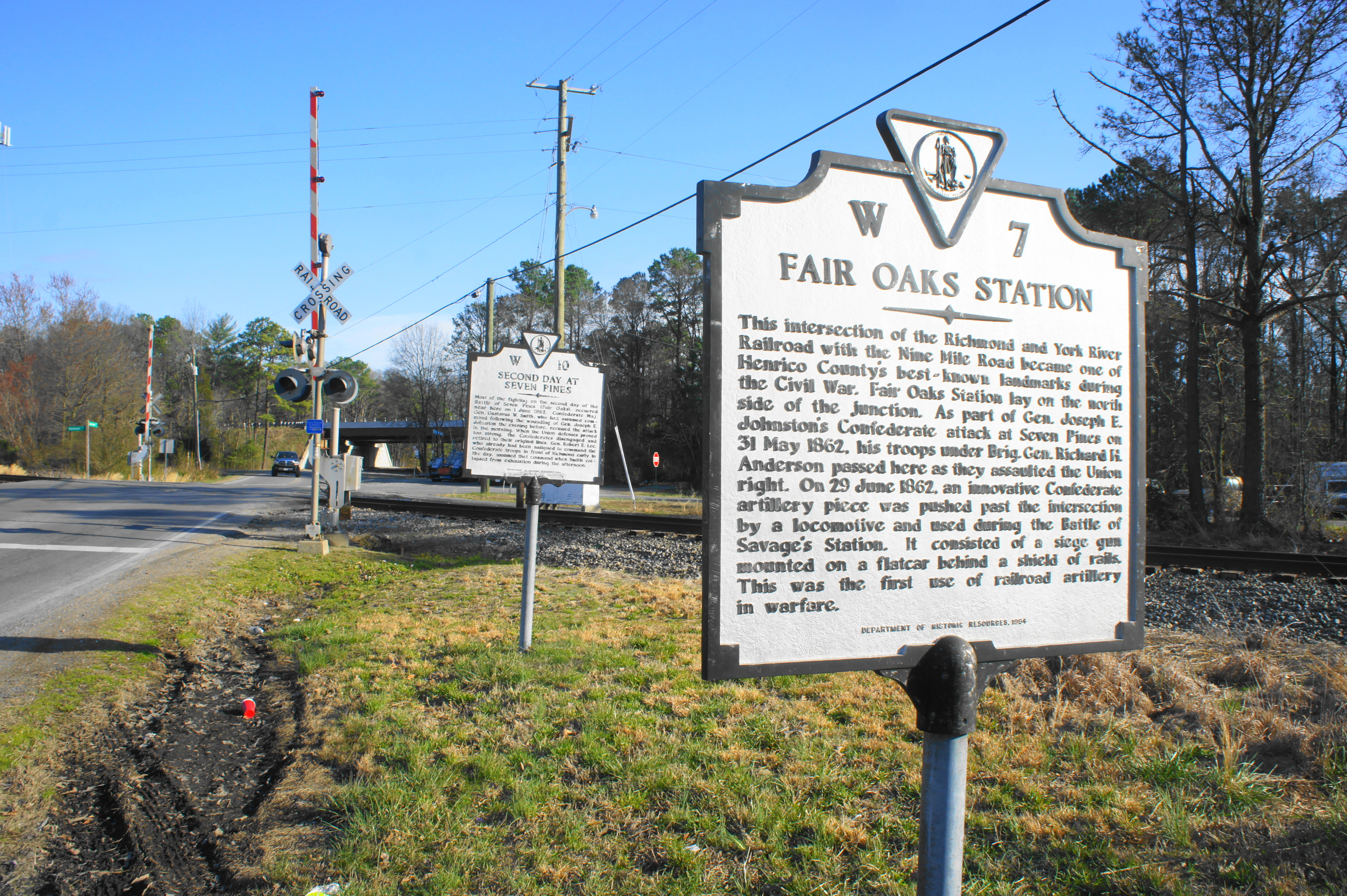 The Battle of Seven Pines effectively ended on June 1 in a draw, with both sides claiming victory. The final Seven Pines site is marked by two white signs, situated at the former site of Fair Oaks Station. This area saw heavy fighting on both days of the battle and, later in June, witnessed the passage of a Confederate locomotive mounted with a siege gun—the first piece of railroad artillery used in warfare.