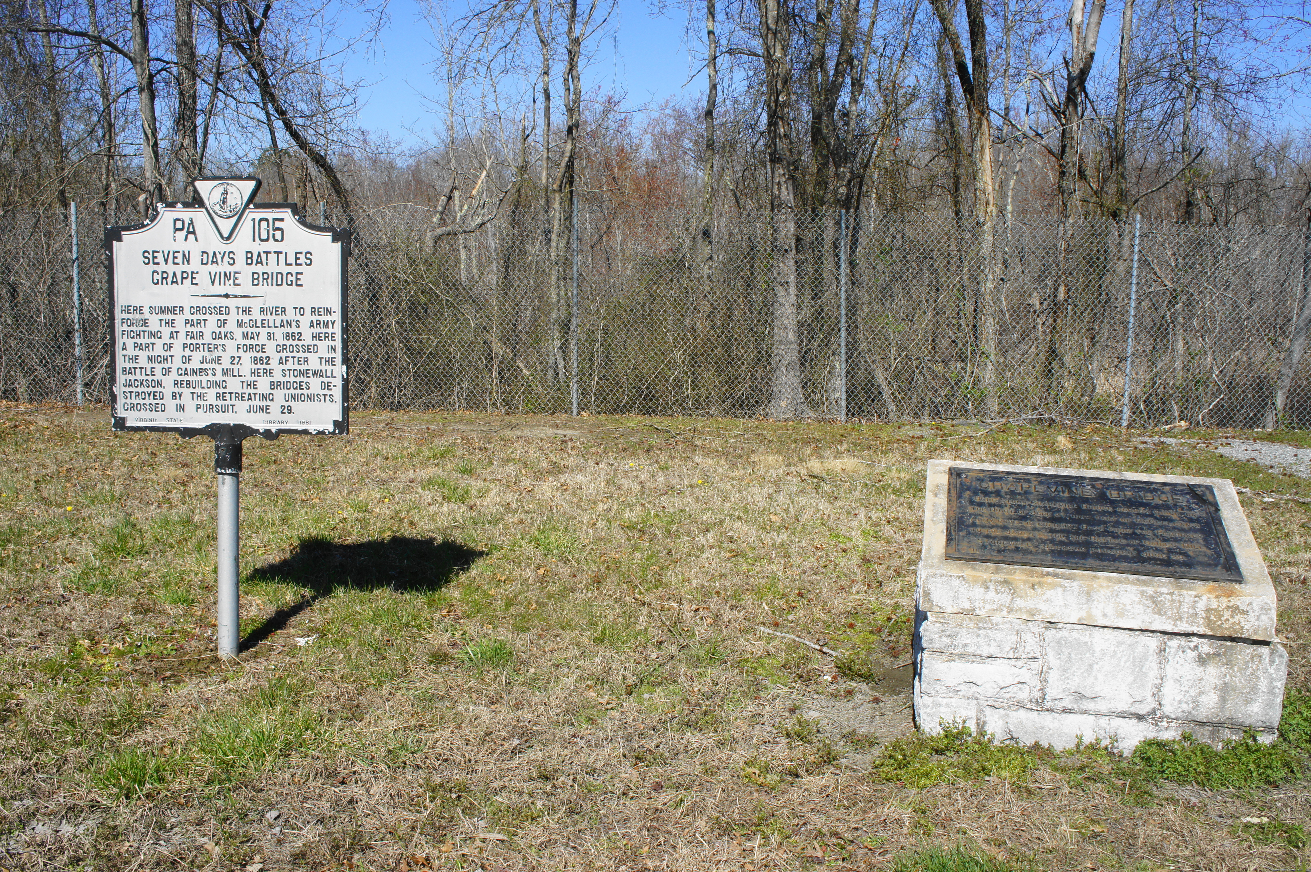 Today, Virginia Route 156, a.k.a. Cold Harbor Road, traverses the Chickahominy at roughly the spot of the old Grapevine Bridge. A large parking area just south of the crossing offers serves as the start of a short trail to the river banks. (Note: This is also an entry point for the Chickahominy Water Trail.) There is also a pair of markers on the opposite side of the parking area that offer a short description of the strategic importance of Grapevine Bridge.