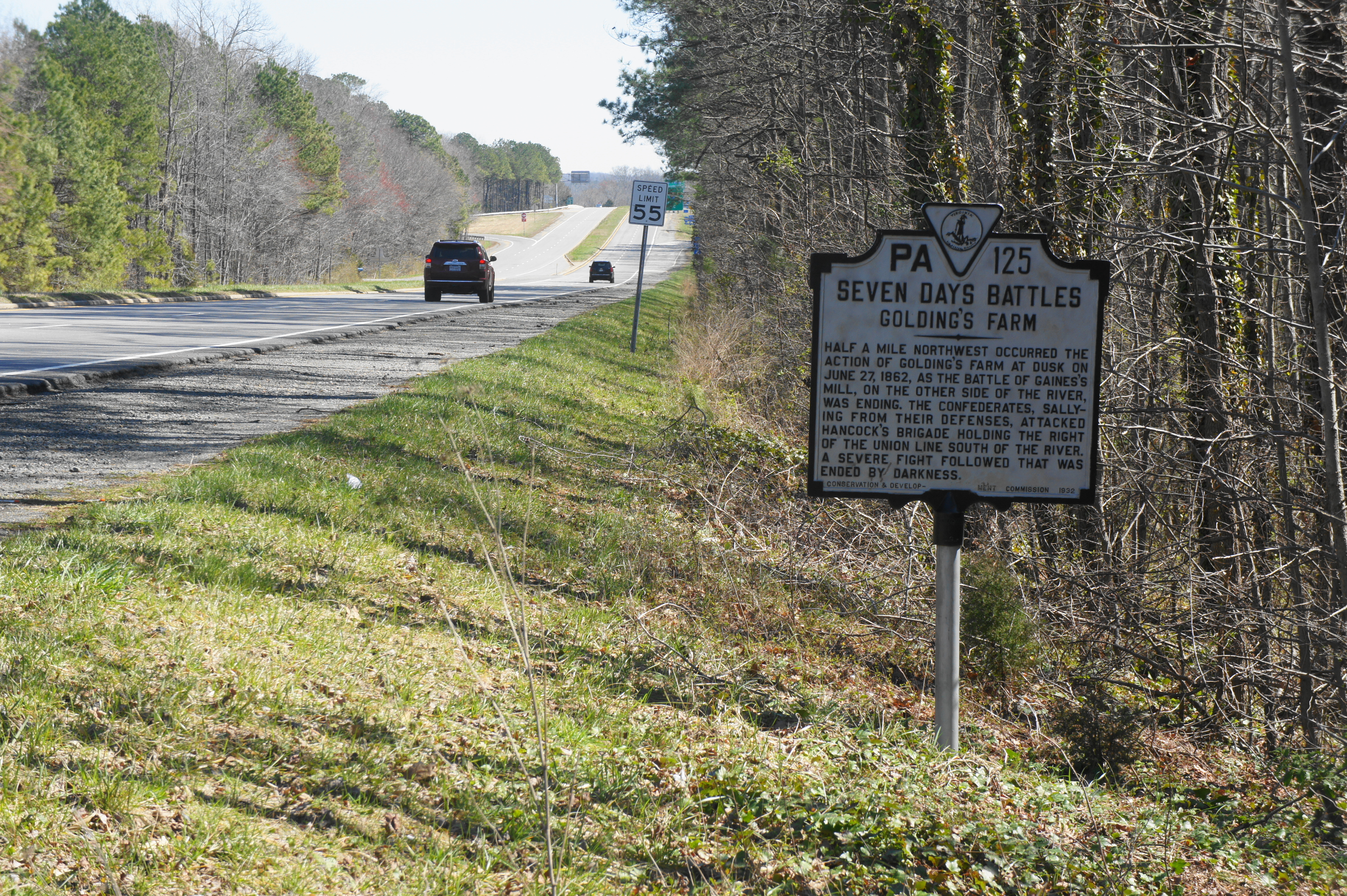 There are several roadside signs and a Civil War Trails wayside dedicated to the Battle of Savage’s Station at a pull-off near the junction of Grapevine Road and Meadow Road. Most of the fighting occurred in the fields to the south, with much of the battleground now covered by the highway interchange of I-295 and I-64.