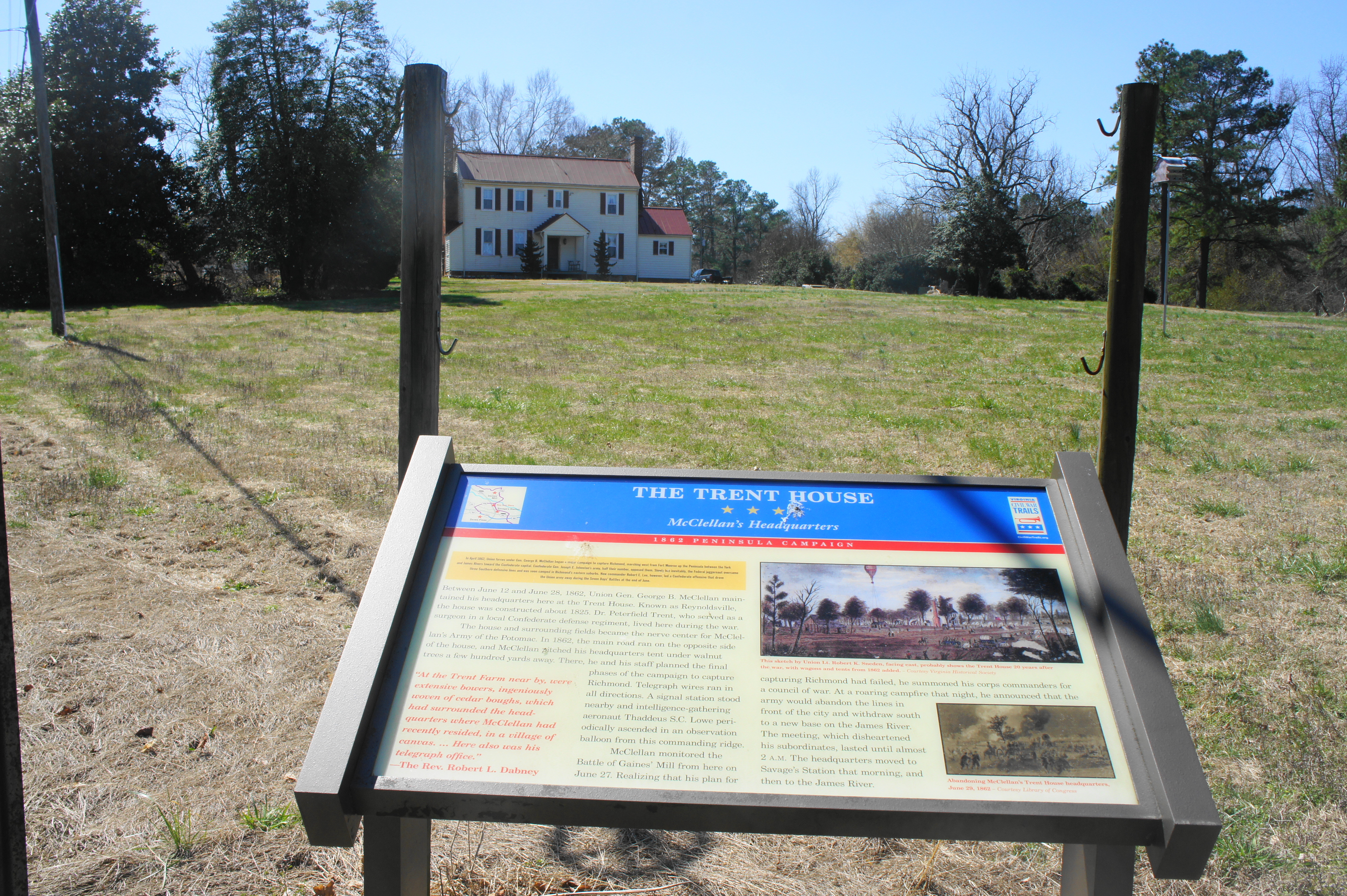 Heading back toward Grapevine Road, hang a right on Old Hanover Road, then follow Grapevine Road south, roughly following the retreat route of McClellan’s forces as they made their way to the James. On your right you will encounter a Civil War Trails sign on the Trent House, which served as McClellan’s field headquarters from June 12-June 28, 1862. McClellan monitored developments at Gaines’ Mill and Garnett’s Farm from here on June 27; that night, the timid general told his commanders around a campfire that his offensive to capture Richmond had failed and announced his intention—already set in motion after Beaver Dam Creek—to complete a withdrawal to the James, where his forces would enjoy the protection of Union gunboats. After the meeting, McClellan sent a telegram to Secretary of War Edwin Stanton, reprimanding him for not sending reinforcements: “I have lost this battle because my force was too small…If I save this Army now I tell you plainly that I owe no thanks to you or any other persons in Washington – you have done your best to sacrifice this Army.”[iv]