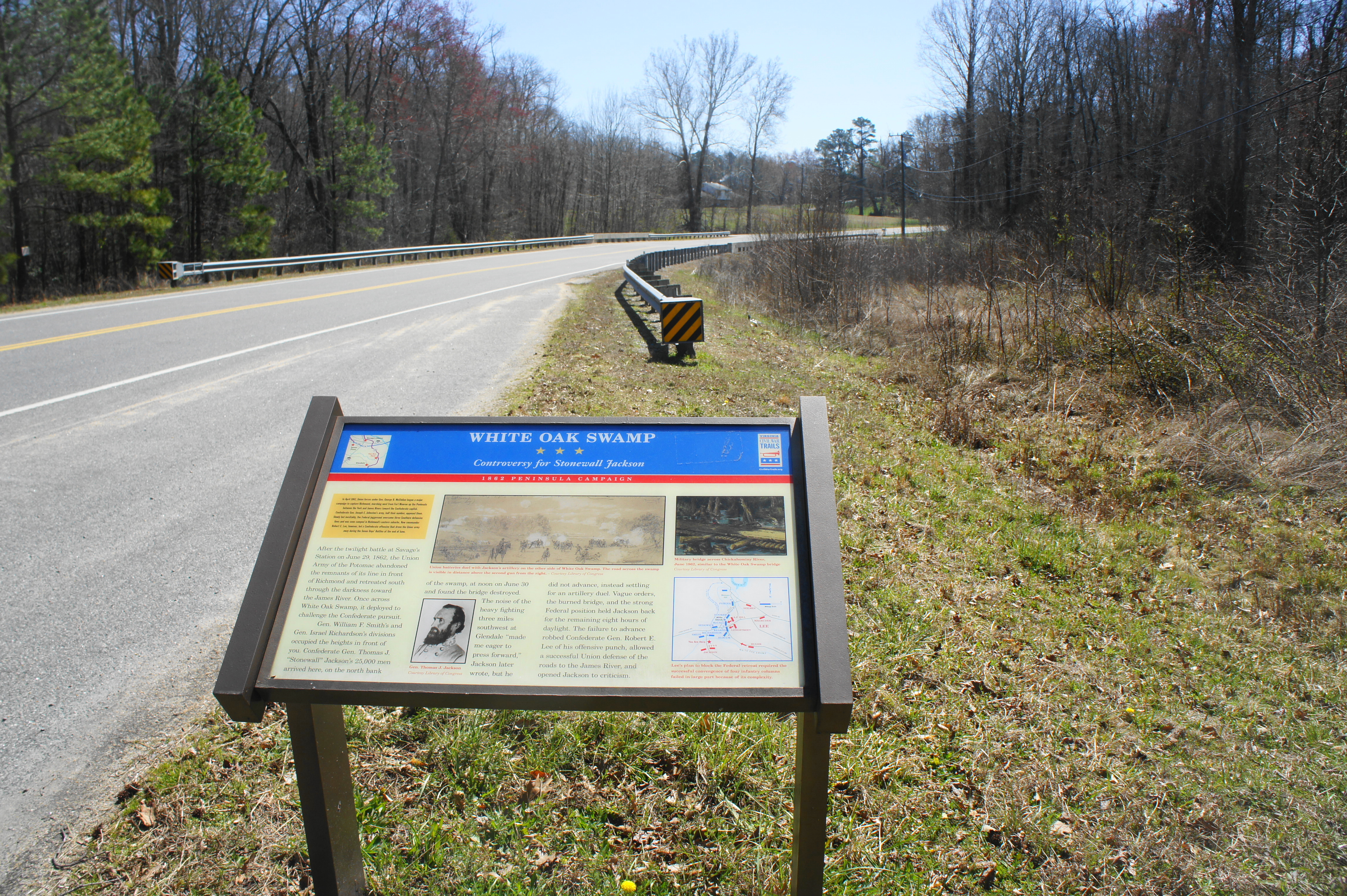 There a couple of historical markers, including a Civil War Trails wayside, at the point where Route 156 crosses White Oak Swamp. While most of the area is privately owned, one can peek over the bridge to see the swampy terrain that helped halt the Confederate advance; on the south side, you can see the high ground where Franklin’s artillery were placed during the engagement.