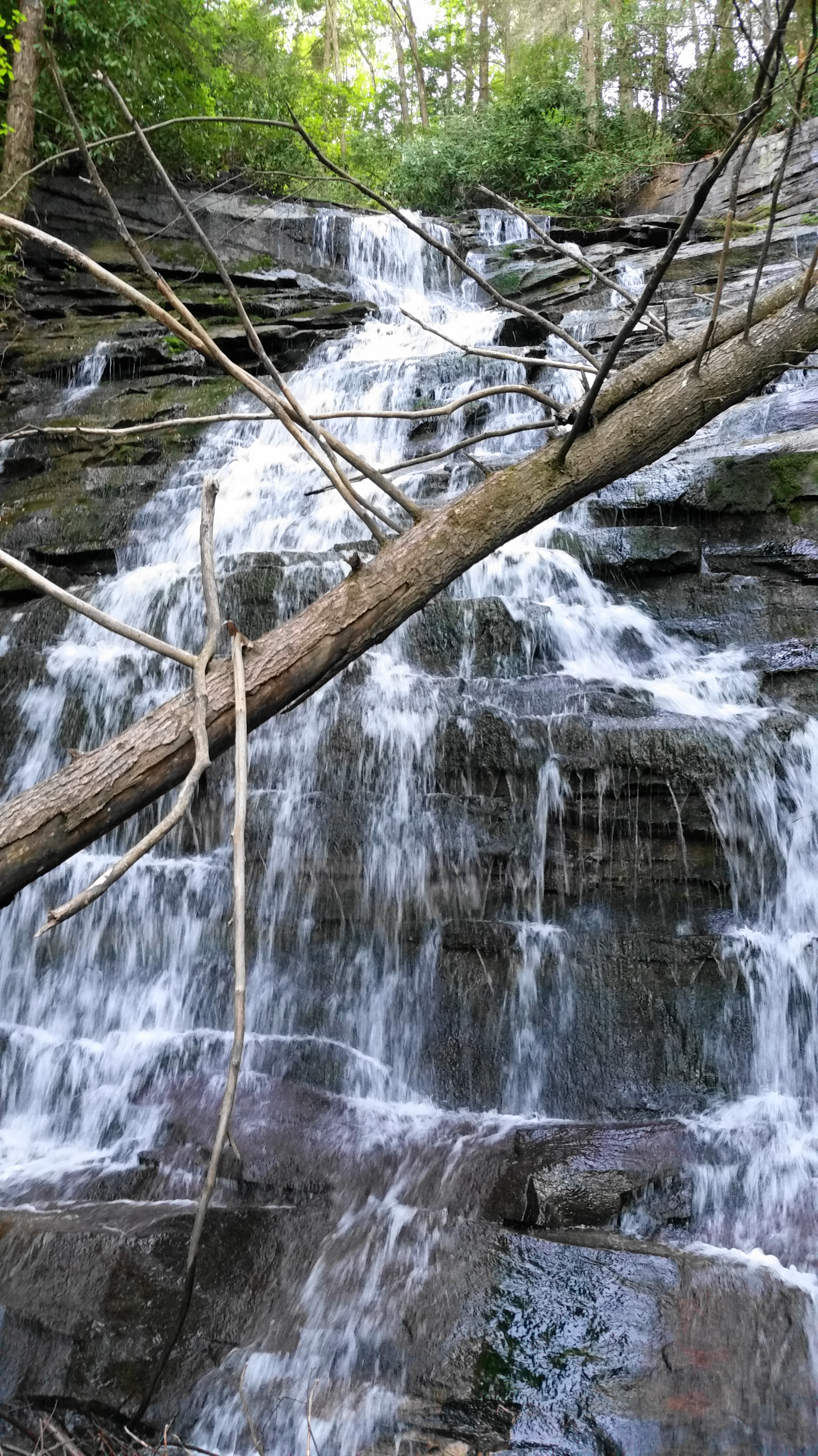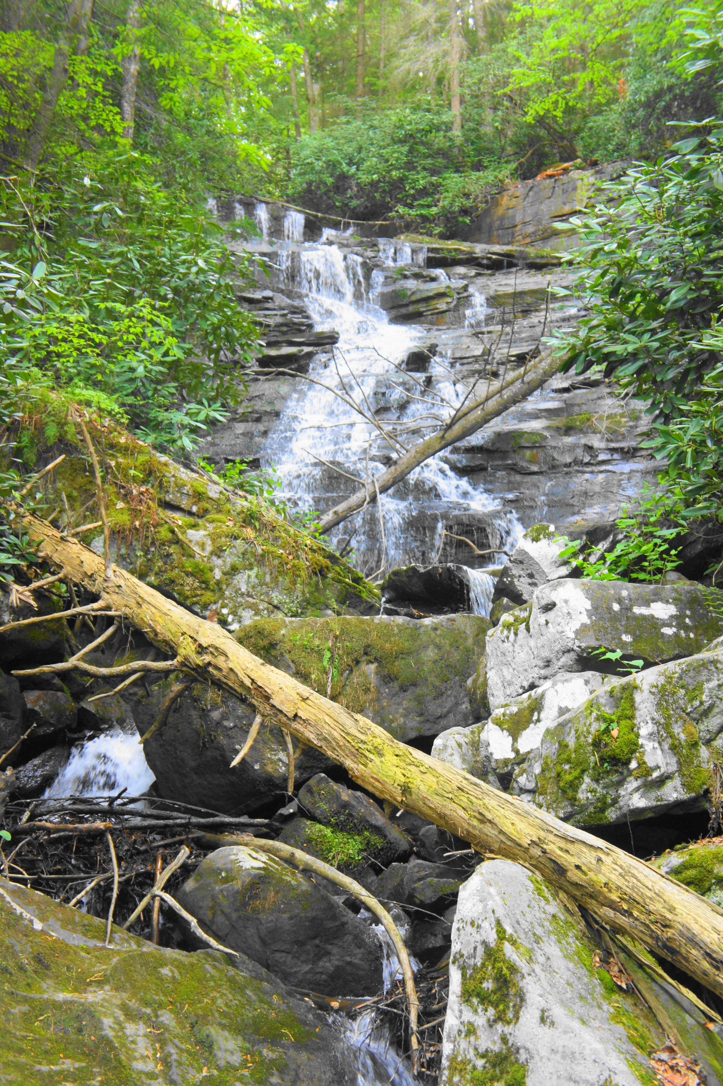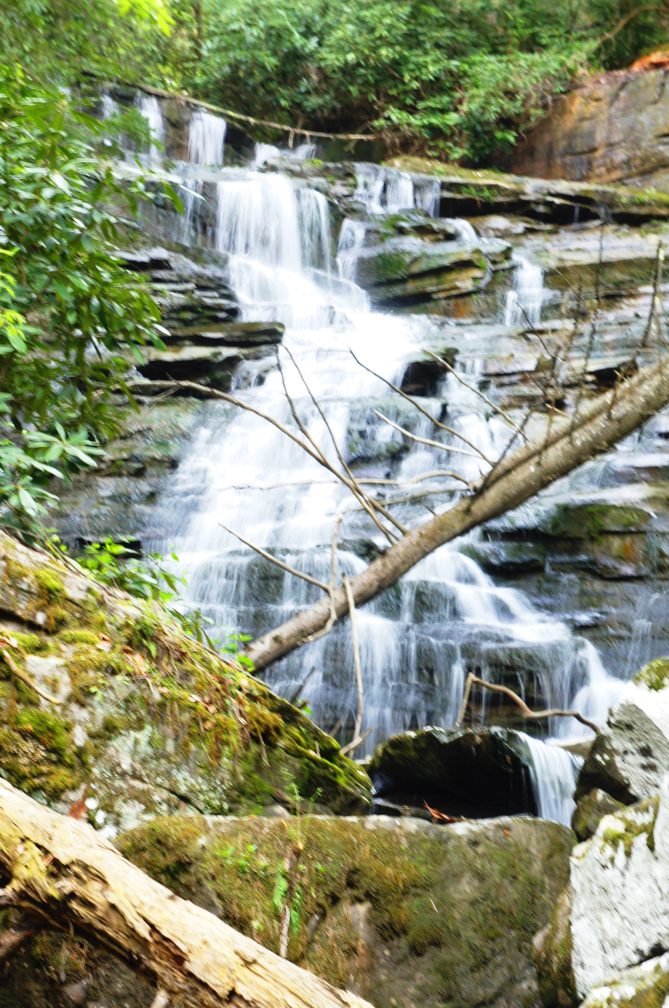The spur trail immediately descends a steep set of switchbacks and then hugs the base of a blocky wall of sandstone as it approaches Butcher Branch. It is a short walk from here to the creek. Where the path crosses Butcher Branch, stop and look up to the left: here is Butcher Branch Falls, a multi-tiered tumble surrounded by dense vegetation. One can reach the base of the falls with some minor scrambling, but be careful traversing the wet and slippery rocks and log jams.