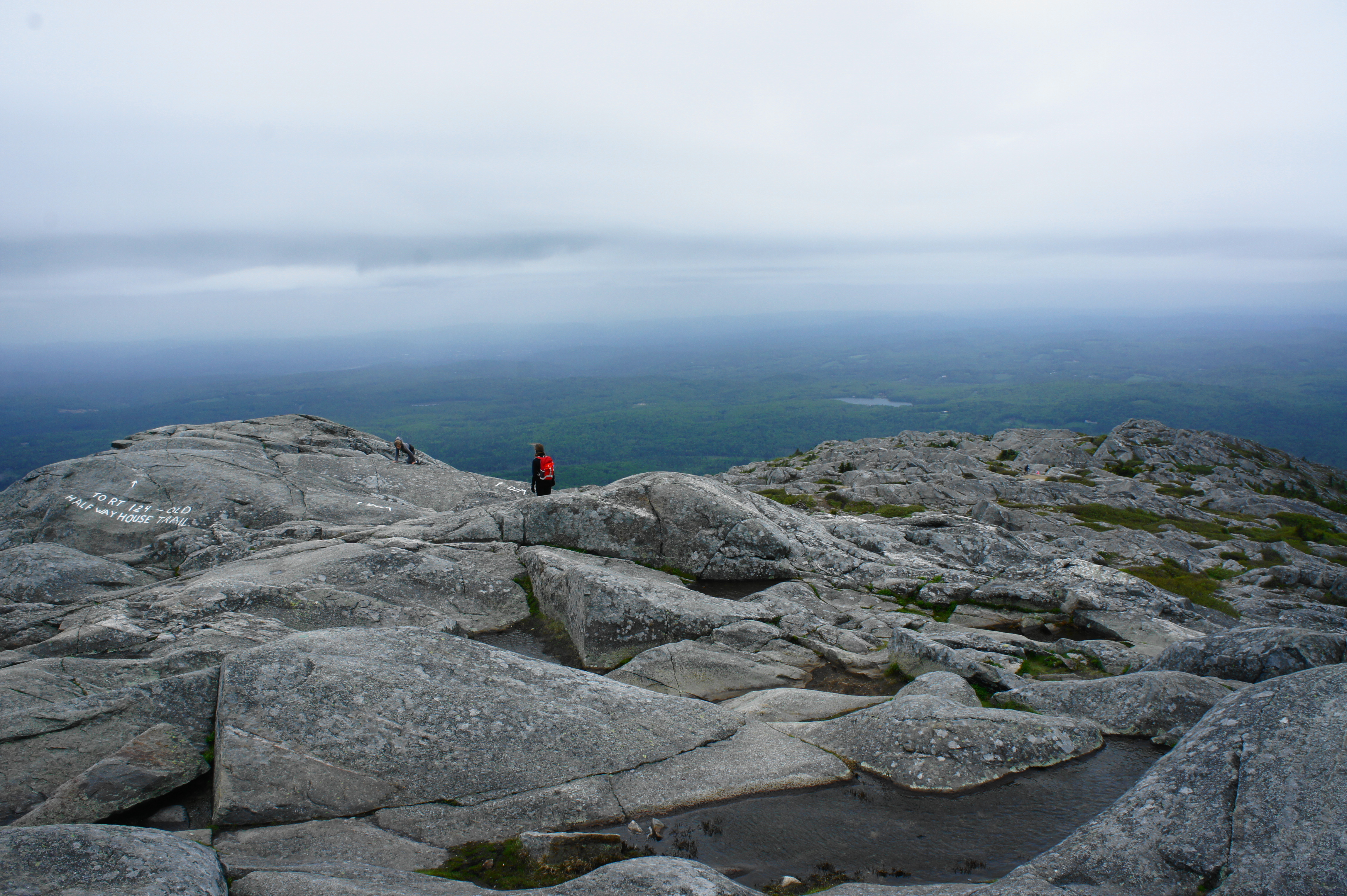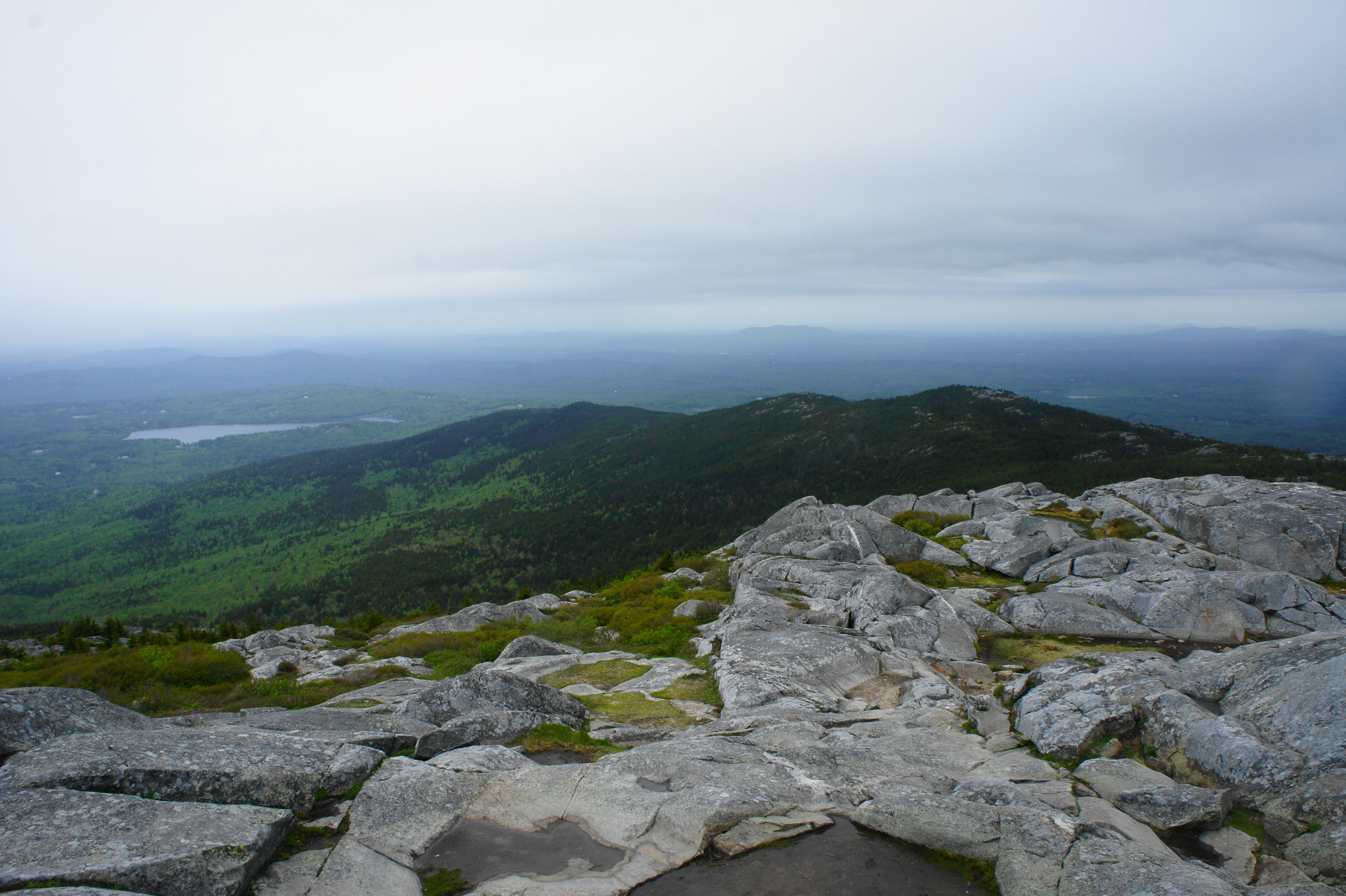 Panoramic views from Mount Monadnock include a look toward the White Mountains to the north and as far as the skyline of Boston to the southeast. The Green Mountains of Vermont dominate the horizon to the west. In the foreground, the mountain drops down a wooded ridgeline to the south known as Bald Rock, with views of Massachusetts beyond.