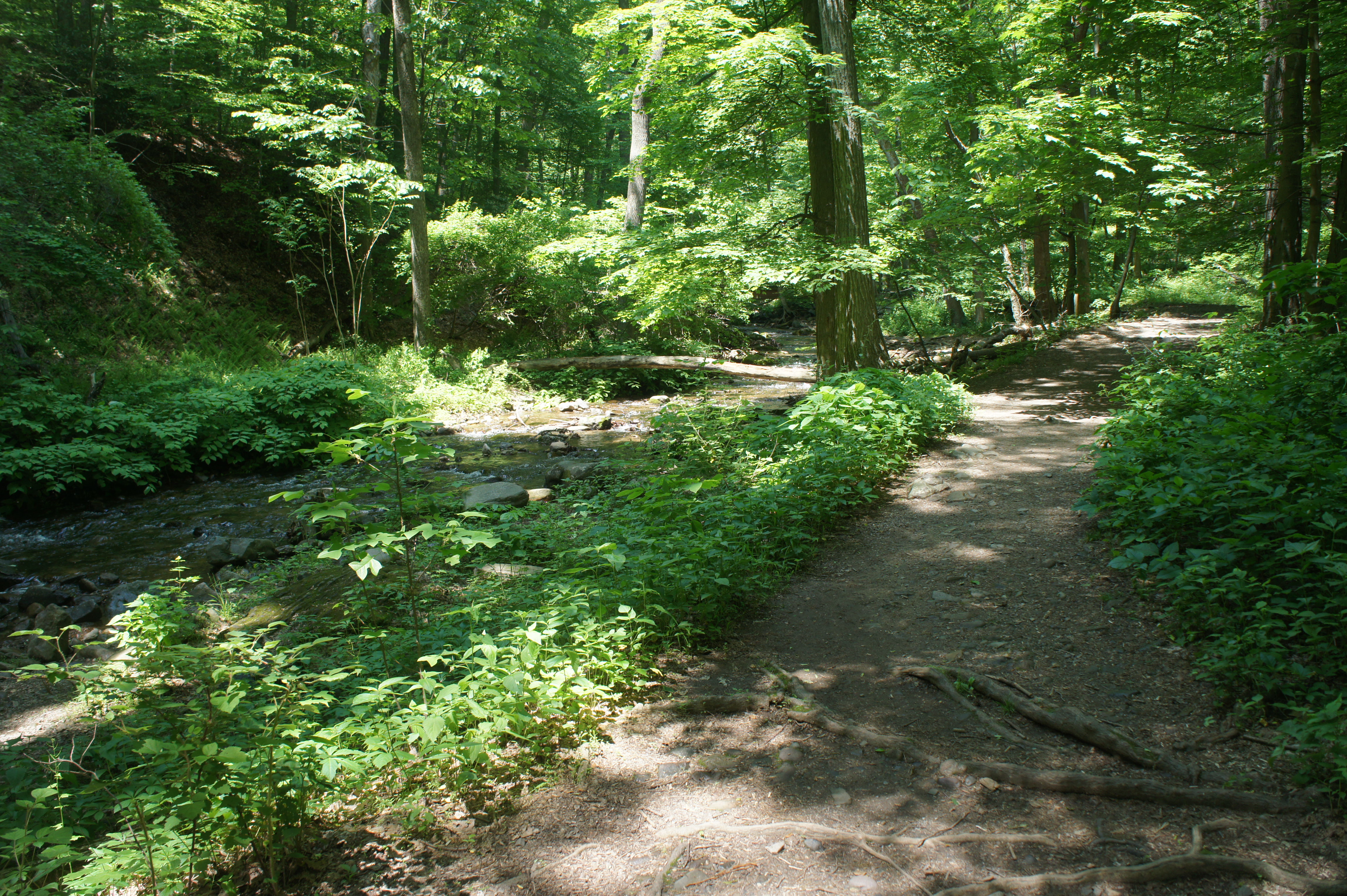 Two trails take off from here: the Red Dot Trail and the famed Appalachian Trail (AT). While most visitors to Mount Tammany climb the Red Dot Trail, starting with the AT section and working your way clockwise around the loop offers a slightly easier climb. Following the AT, the hike begins in a cool, shady valley graced by pleasant Dunnfield Creek. In about 100 yards, the trail traverses a bridge over the creek and then parallels the stream as it bears northeast. Beautiful chutes and minor cascades accentuate the flowing waters, a far cry from the noisy and uninspiring highway just beyond the trailhead.