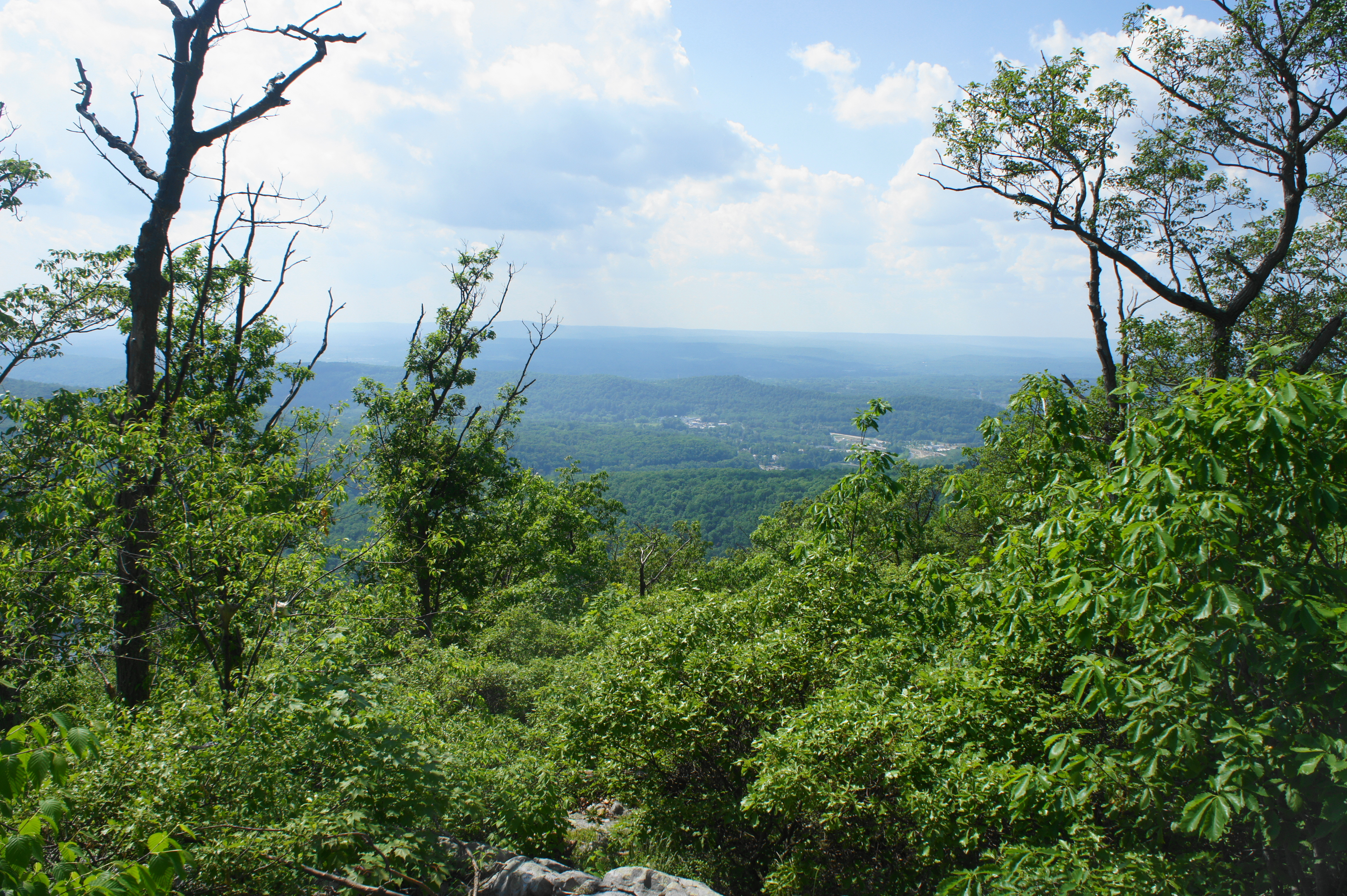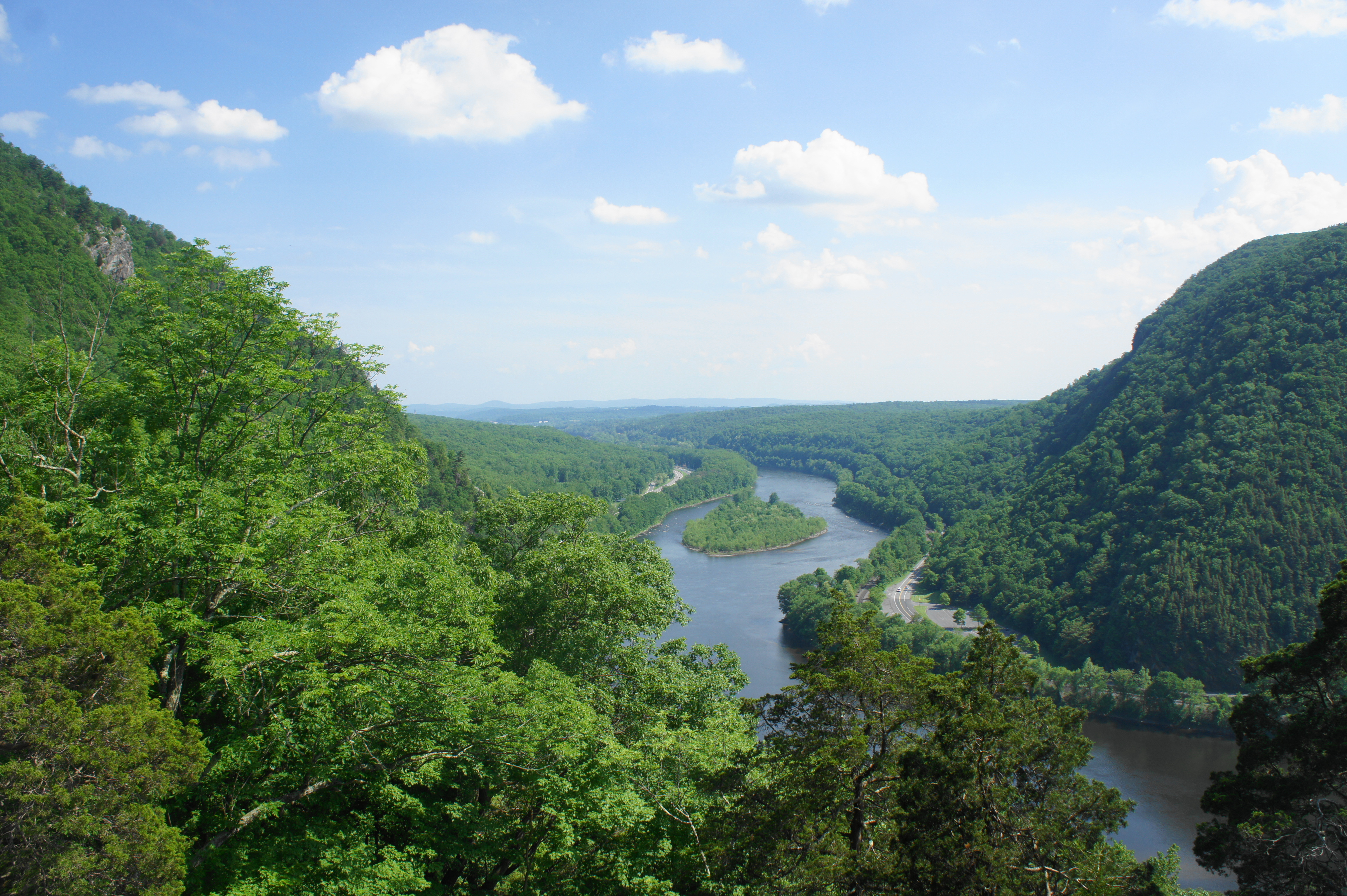 At the Delaware Water Gap, part of a broader National Recreation Area bearing its name, the Delaware River slices through a weakness in the mountains, forming a picturesque valley on the border of Pennsylvania and New Jersey. Two peaks, part of the broader Kittatinny Mountain, tower above the Gap: Mount Minsi (1,463’) on the Pennsylvania side and Mount Tammany (1,526’) in New Jersey. Both are accessed by strenuous but relatively short hikes, though Mount Tammany boasts the better views. The Red Dot-Blue Dot Trail circuit forms a fine half-day loop to and from the summit, likely one of the best hikes in New Jersey.