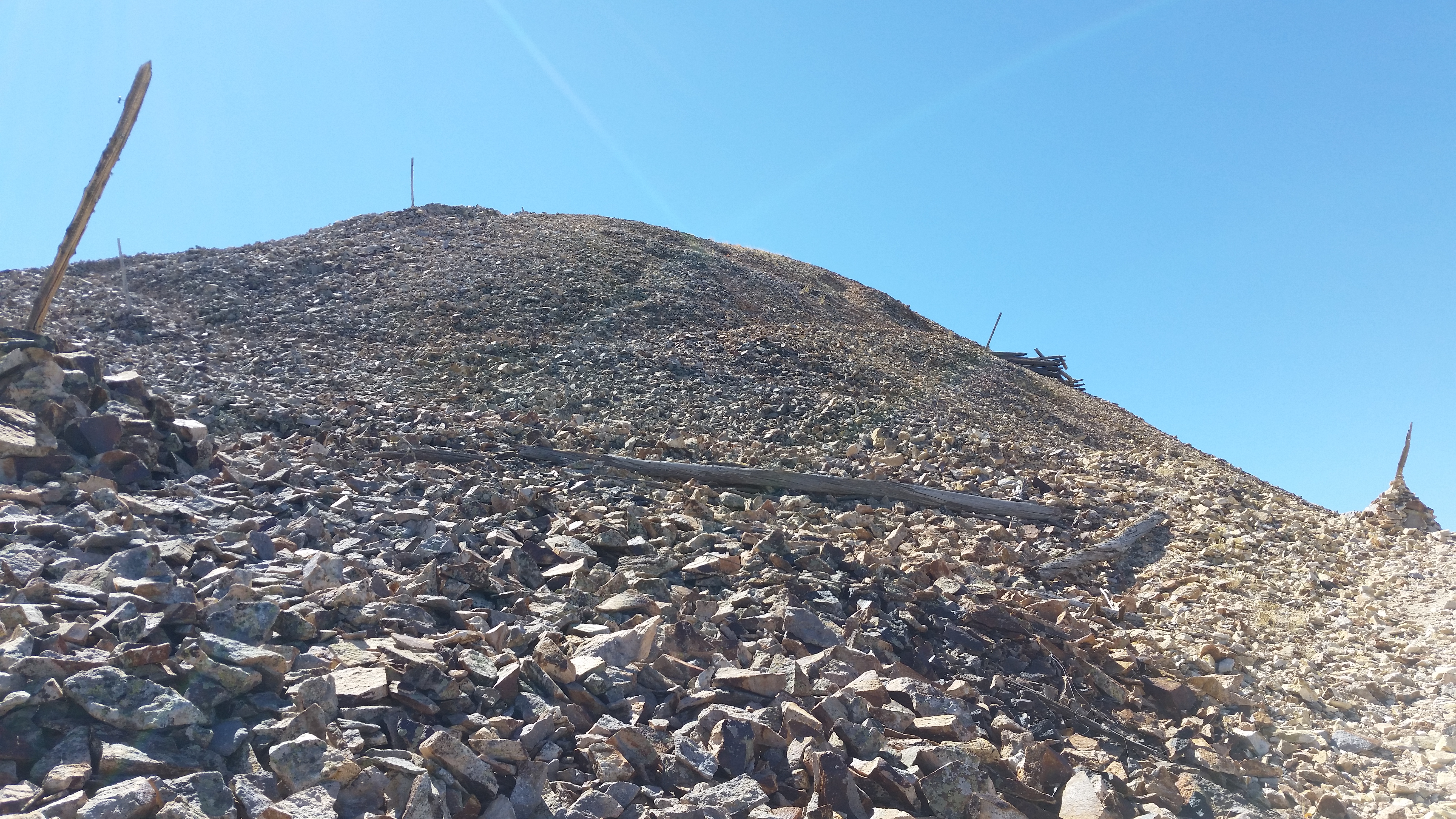By now, hikers have travelled 1.5 miles, and the remaining 1/3 mile cuts through a jumble of loose rock, largely lightly-colored rhyolite sometimes stained with red iron deposits. At the base of the rock pile, the trail splits—either path is fine, as long as you ignore the road bearing left down the north slope of the peak. The two routes converge farther up the hillside, and the trail is marked by large, man-assisted rock piles complete with tall wooden stakes. The views back to the north get better and better as the trail approaches the summit.