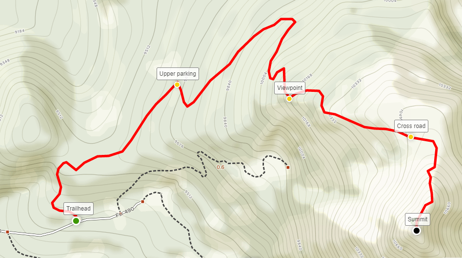 At around 4/10 mile, the road begins to noticeably climb again, although the grade remains relatively mild. About ½ mile from the start, hikers reach the upper parking lot—relatively rarely used because of the intense difficulty of the 4WD road to this point. Look for a sign marking the start of the single-track to Hahns Peak—leave the road here.