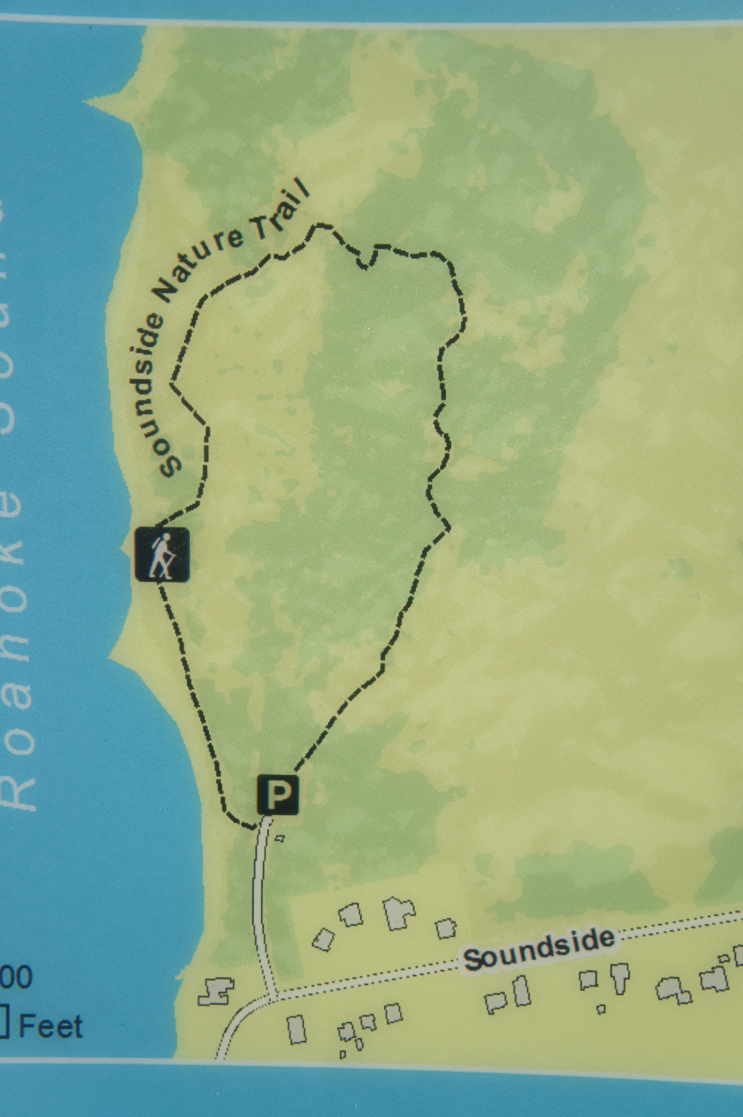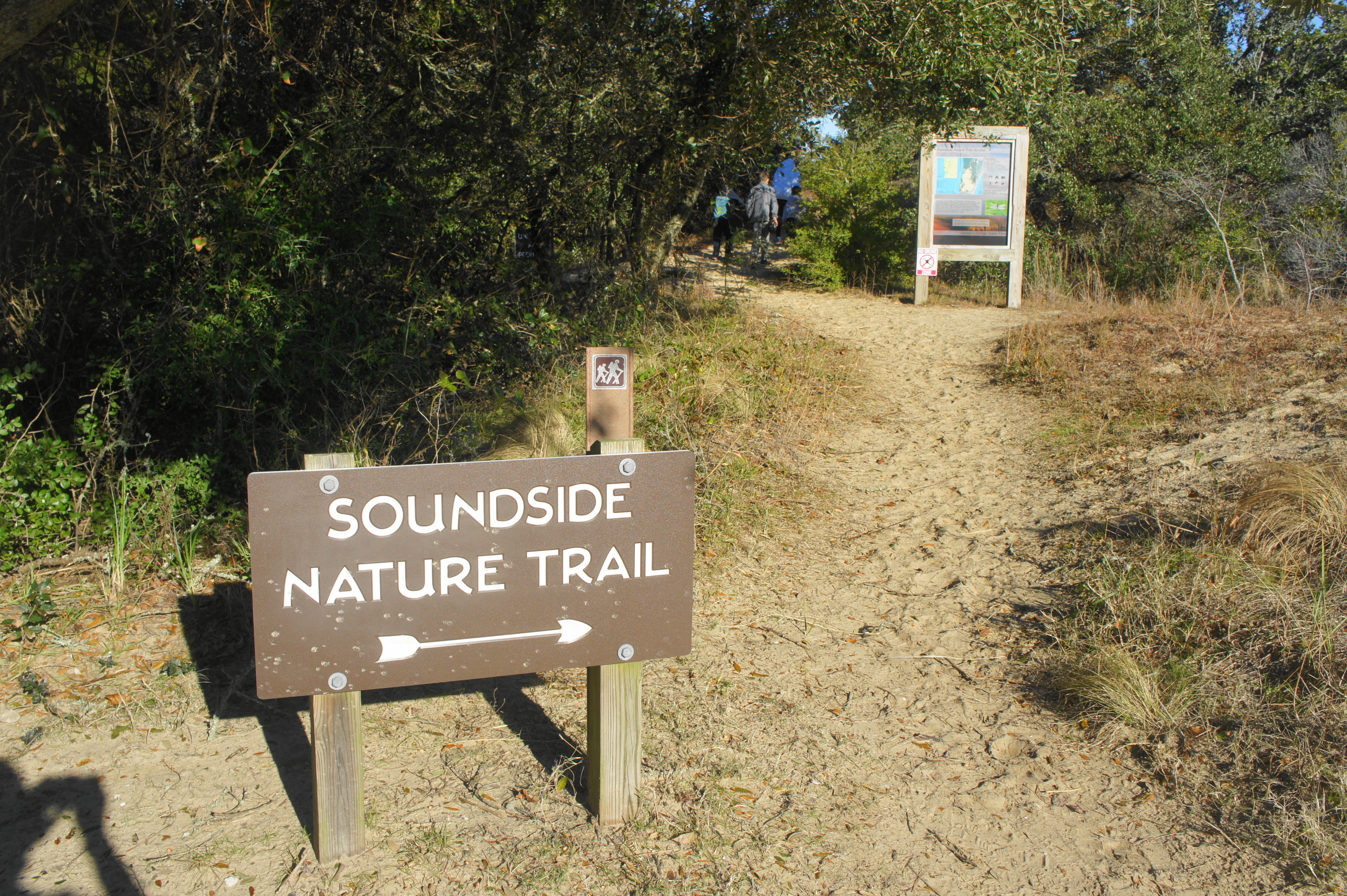 Unlike other routes in the park, reaching the trailhead for the Soundside Nature Trail requires leaving the park and driving around to the southern end of Jockey’s Ridge. From Croatan Highway in Nags Head, bear west on Soundside Road, a semi-residential drive. Just as the road begins to bend southward, take a right into the signed parking area.