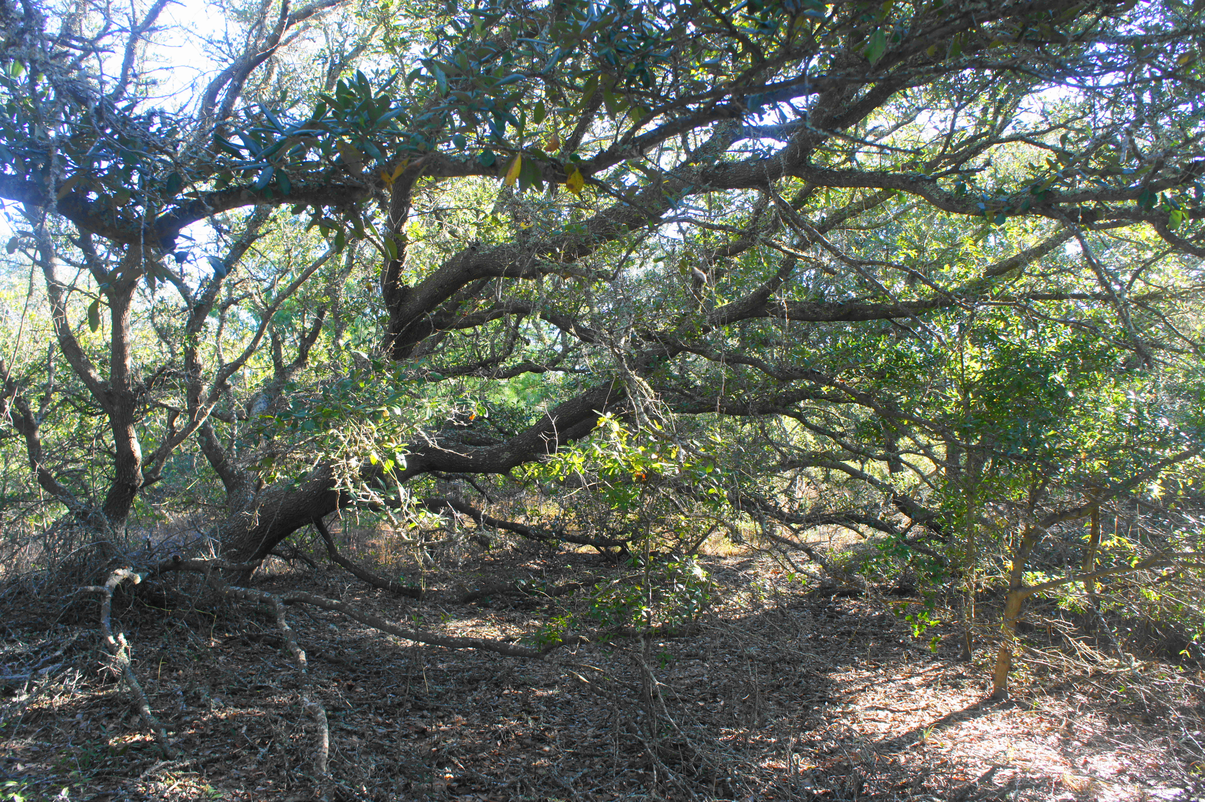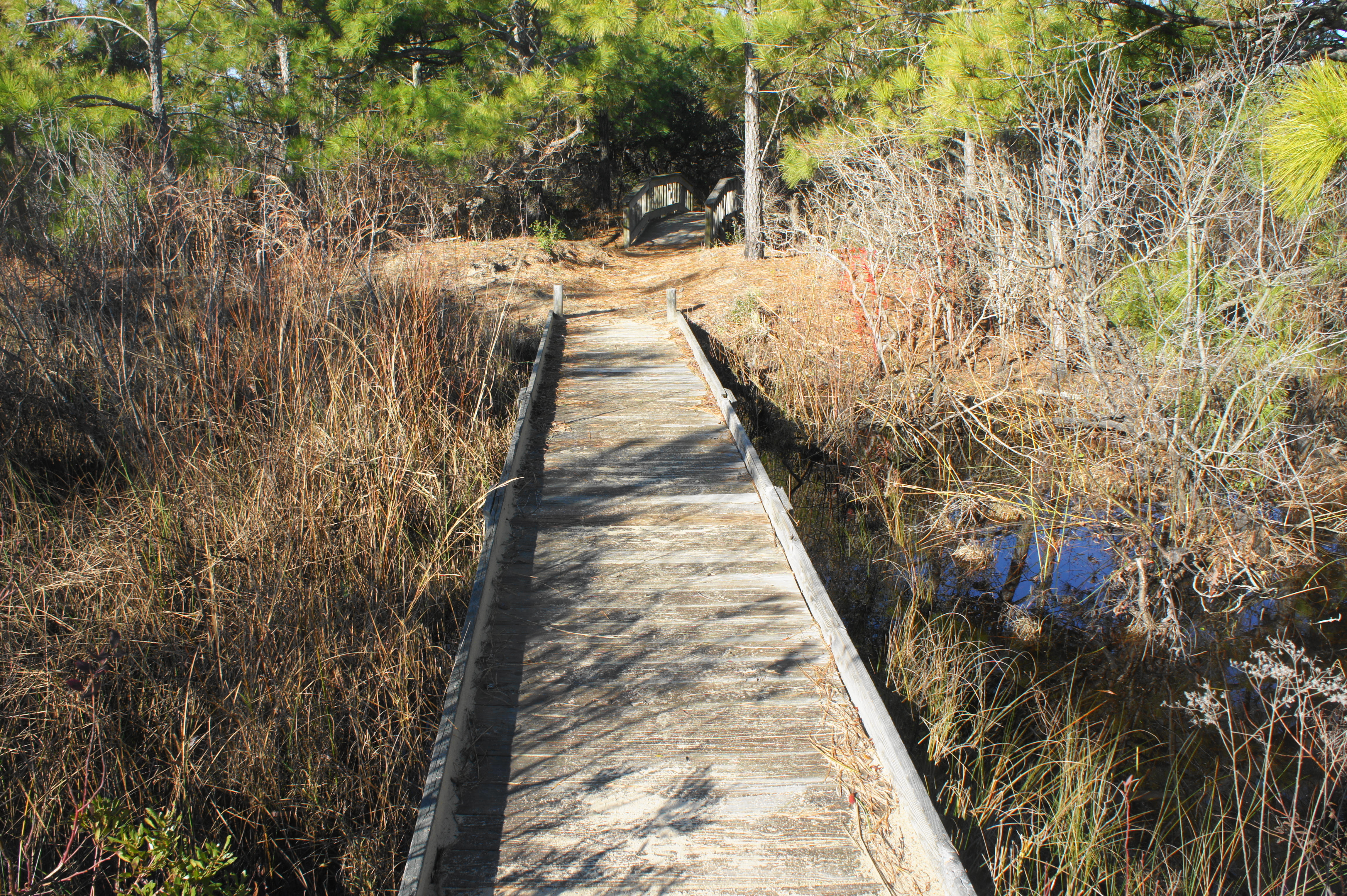 At around 150 yards, the route splits again. Meandering off to the right offers access to the high dunes in the distance, while the trail bears left and narrows to a single-track. On the left is a small marsh, overgrown with tall grasses. About 250 yards from the start, the path bears left and traverses a pair of wooden bridges. The terrain beyond is dominated by loblolly pines, as well as red bay, wax myrtle, live oak, and the occasional juniper.