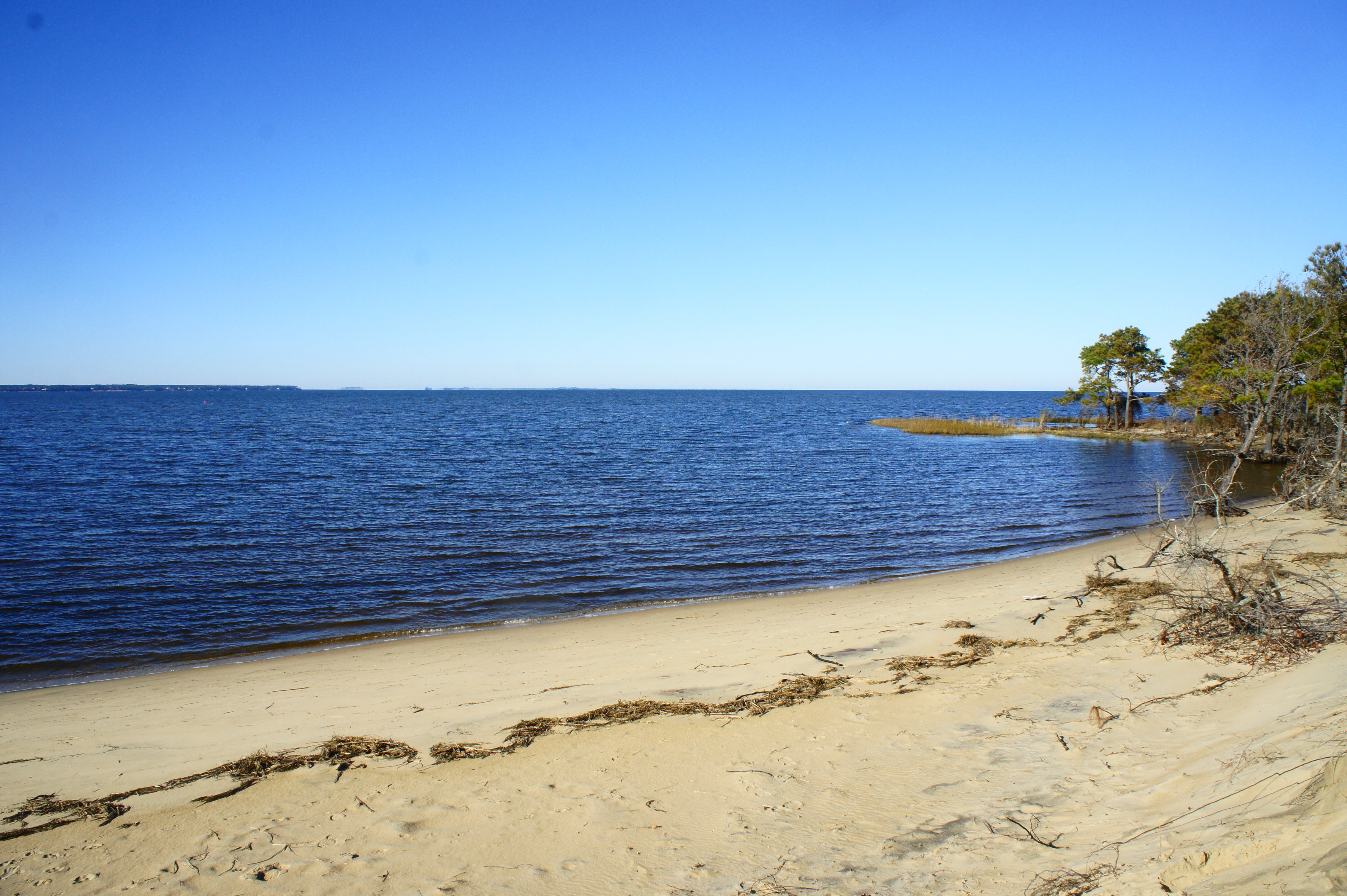 After 3/10 miles, the trail approaches a boardwalk and tall set of stairs, climbing to surmount a minor ridgeline. From there it is down again, dropping to an open area that resembles a sand superhighway. Bear left (following the arrows), then explore the spur trail heading off to the right: this path provides access to the shores of Roanoke Sound. This namesake body of water separates the Outer Banks from Roanoke Island and feeds into the larger Albemarle Sound.