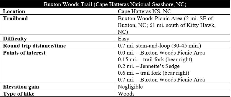 Situated on Hatteras Island in North Carolina’s Outer Banks, Buxton Woods is one of the last undeveloped forests in the area and remains rich in plant and animal life. The Buxton Woods Trail in Cape Hatteras National Seashore provides a short preview of the terrain, forming a 7/10-mile stem-and-loop through the maritime forest. Countless signs provide interpretation of the local wildlife and tell the story of an environment constantly being shaped by the harsh elements: wind, water, and salt.