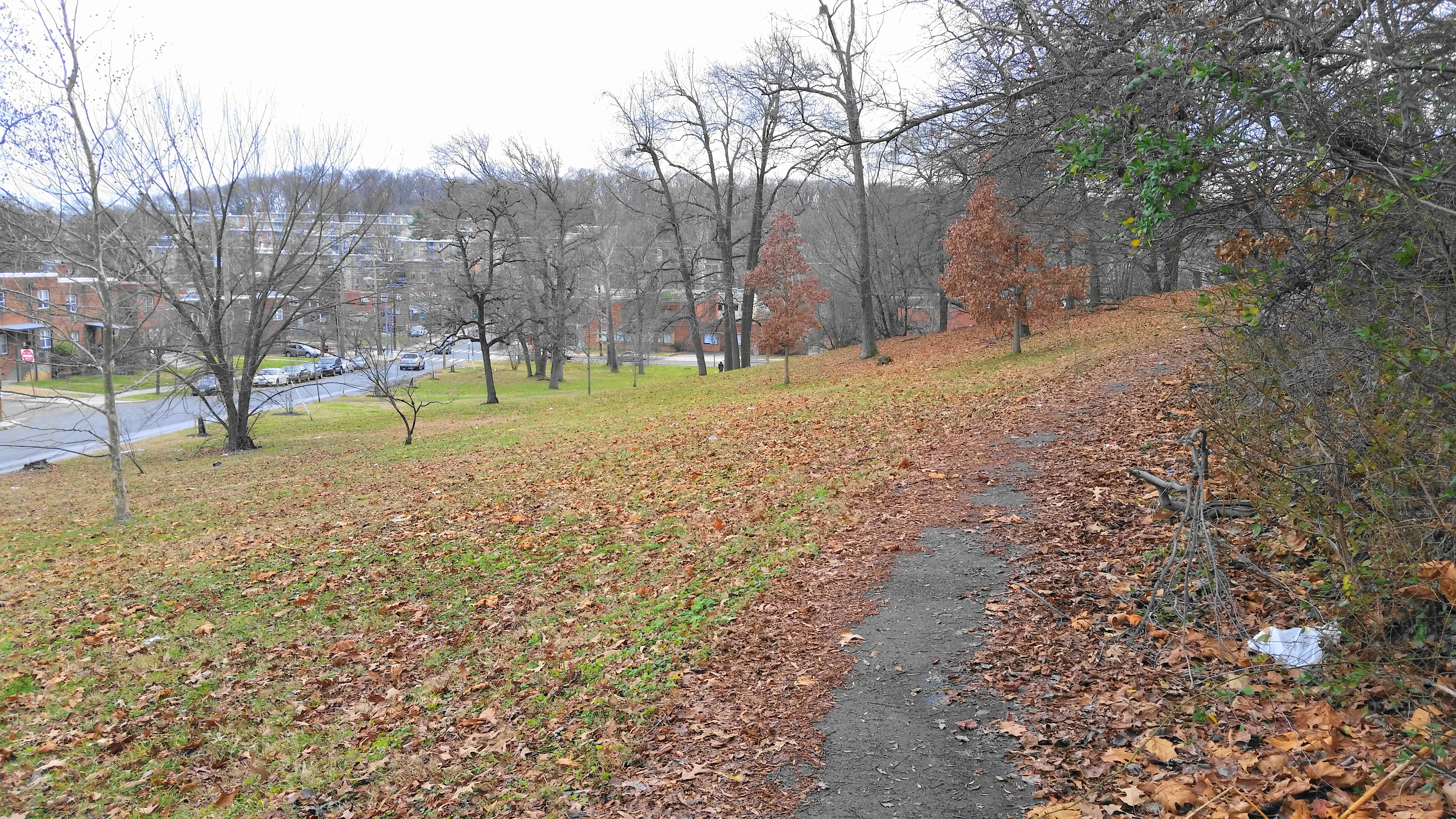In this next patch of the woods, the path climbs a set of stairs to exit the stream valley and then temporarily leaves the forest at the corner of 27th Street SE and Naylor Road. Cross Naylor Road at the crosswalk to find the trail continuation. The following section gains some elevation, staying high and offering some obscured views as far as the Anacostia River and downtown Washington. High rises on the right—the Marbury Plaza Apartments—eventually obstruct the views, and the trail descends a long, paved straightaway to Good Hope Road.