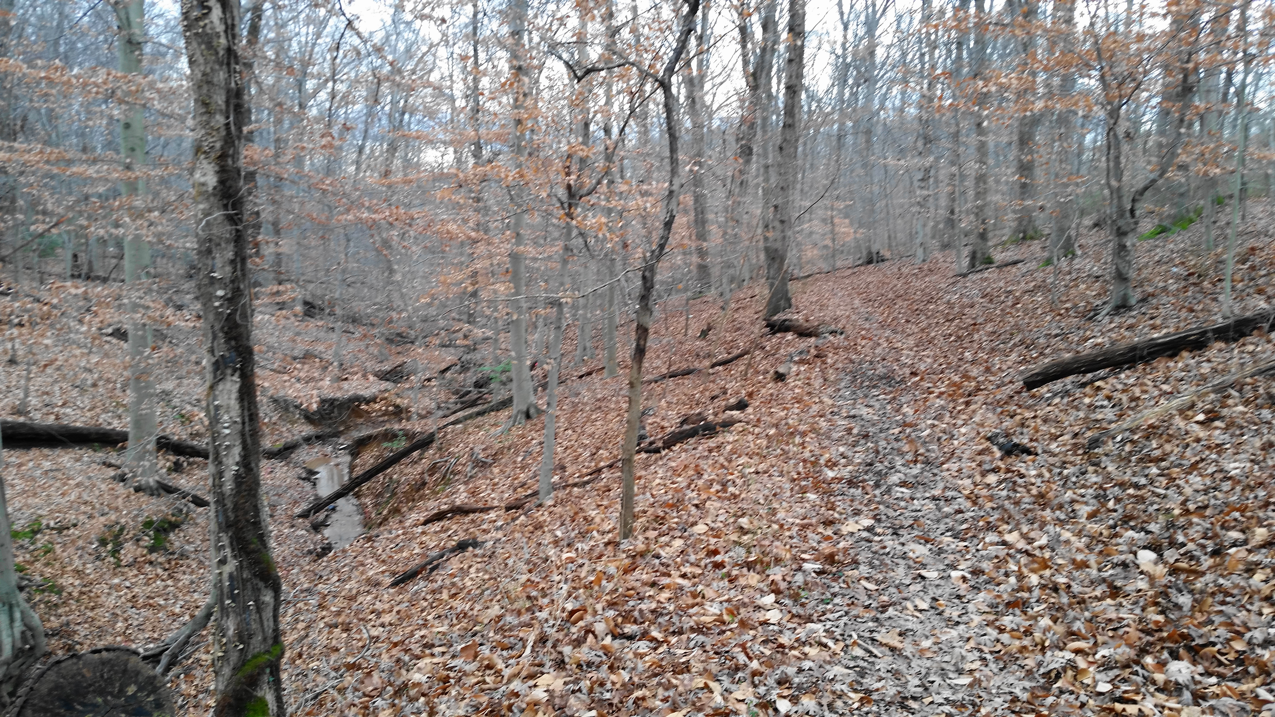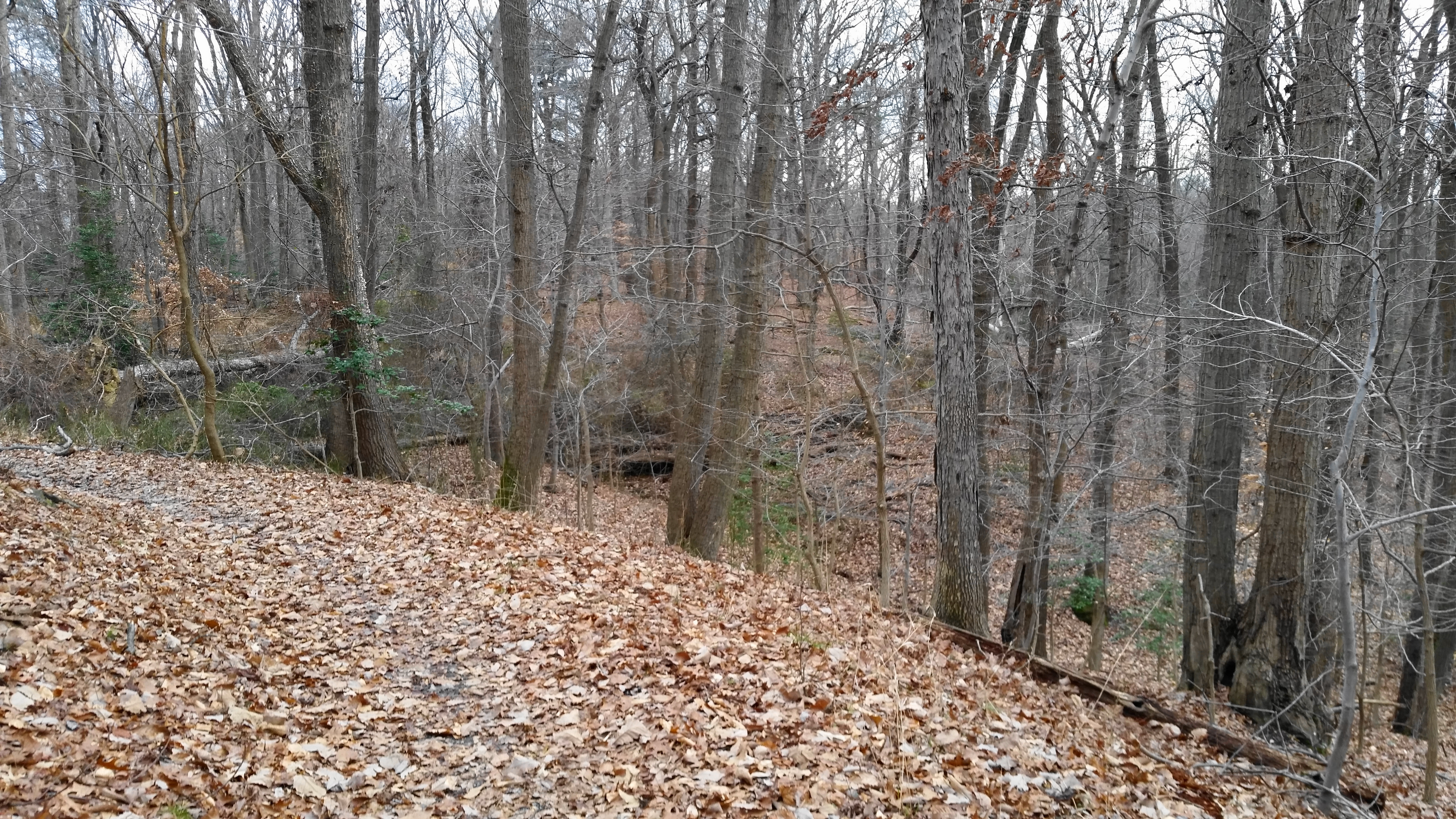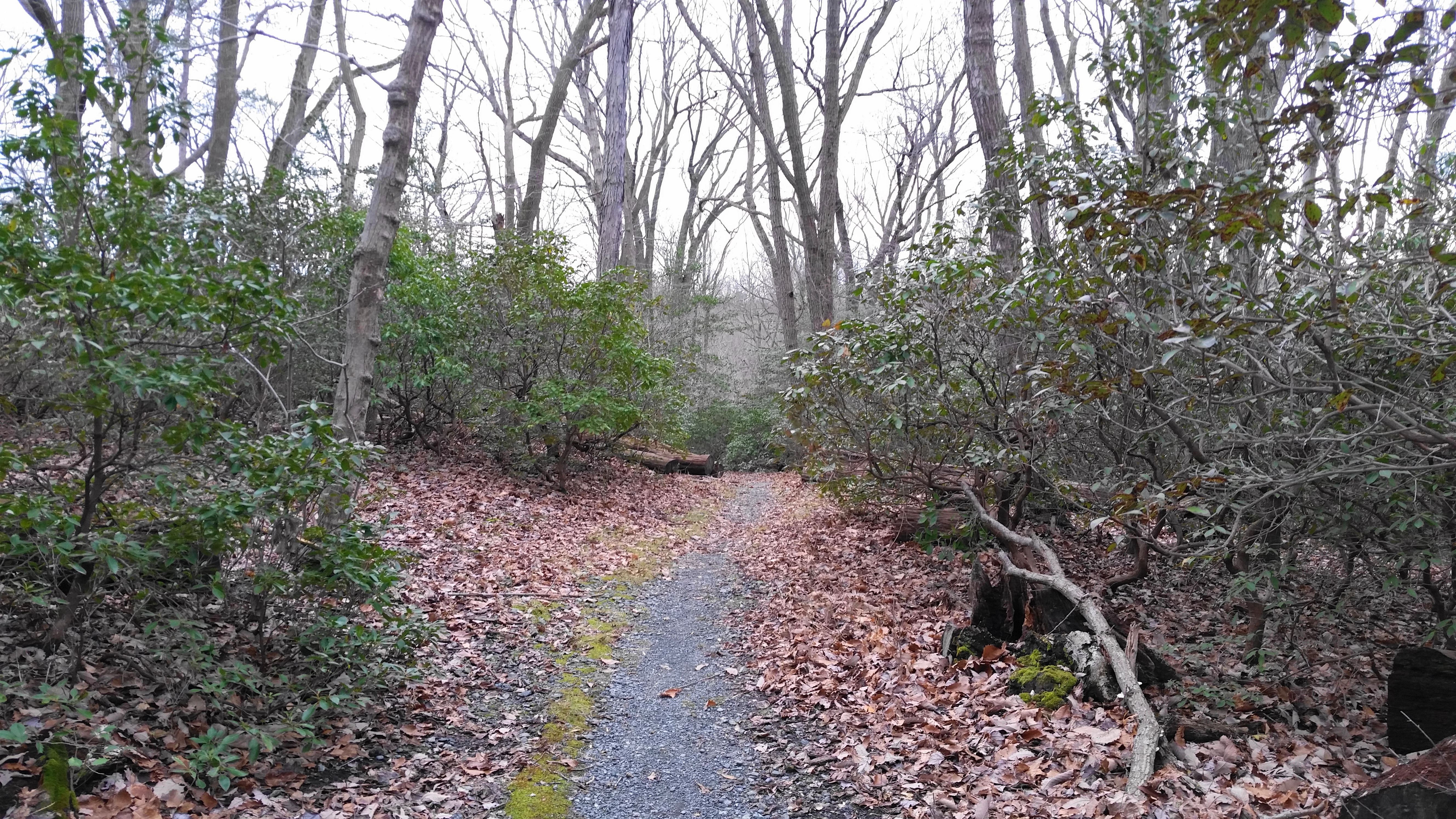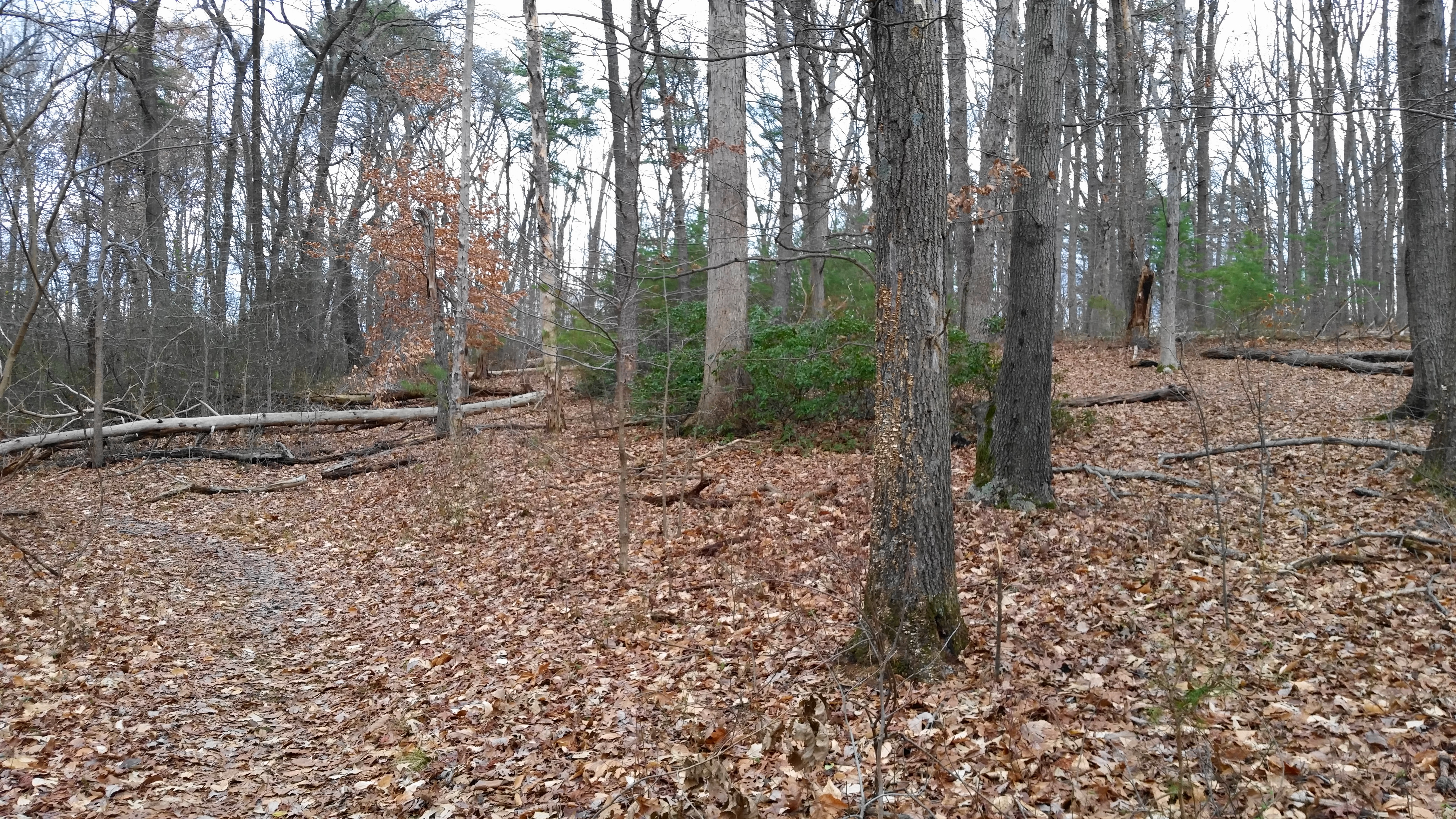 Covering one of the most pleasant parts of the hike, the narrow footpath stays on the heights as the terrain drops significantly off to the right into a collection of woody ravines. After a left-hand bend, the trail briefly climbs, then later drops through a surprising stand of mountain laurel, which continues to stay leafy green through the winter season.