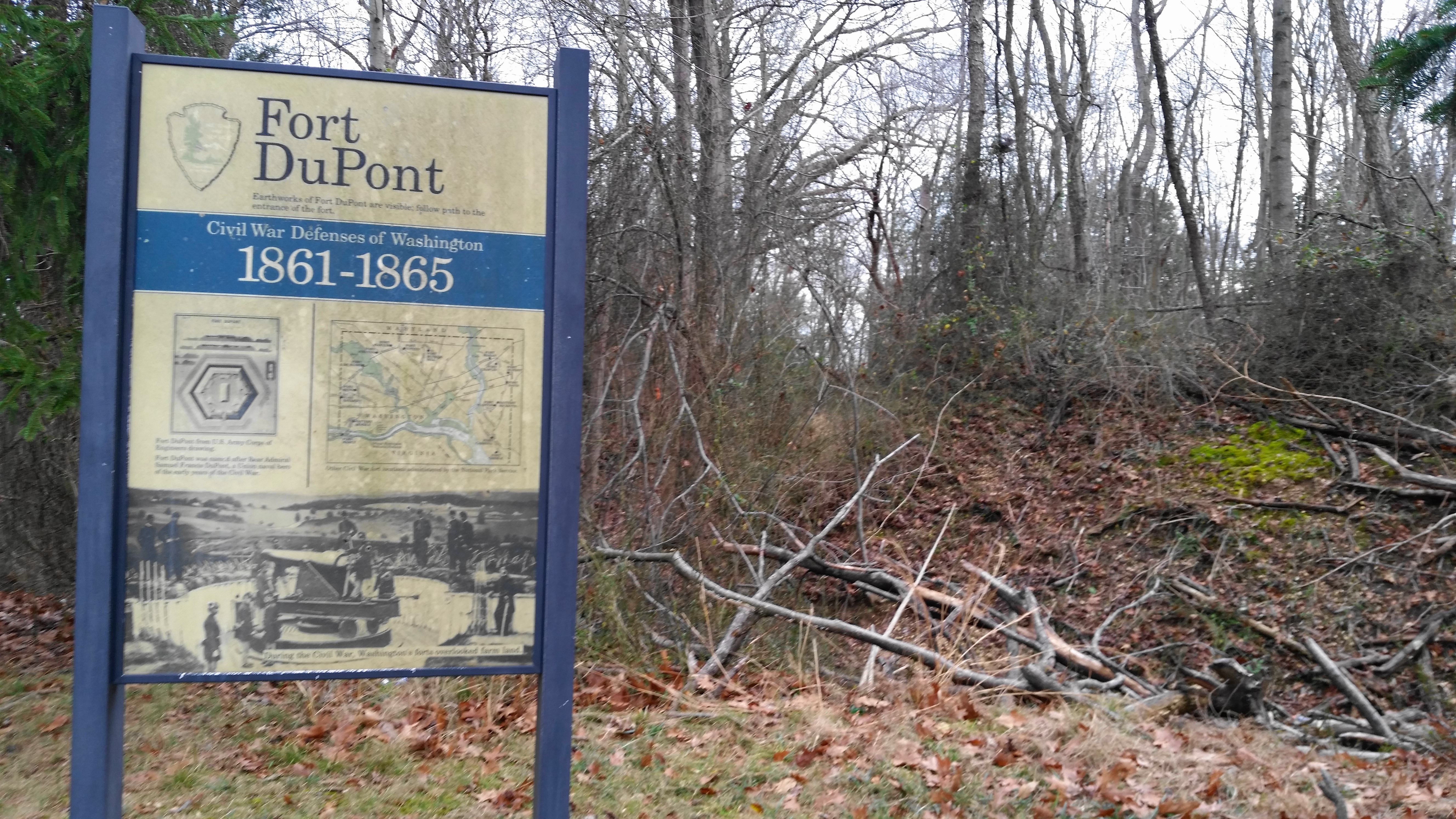 After rounding a long left-hand bend, the gravelly path approaches a junction. This is the unmarked turnoff for access to the earthworks of Fort Dupont. The ½-mile out-and-back spur (not included in the route total) is worth the trip, despite the relatively steep climb: Fort Dupont is relatively well-preserved and fun to explore. In its heyday, the fort featured steep sides and a protective moat and served as a sanctuary for runaway slaves escaping the South.