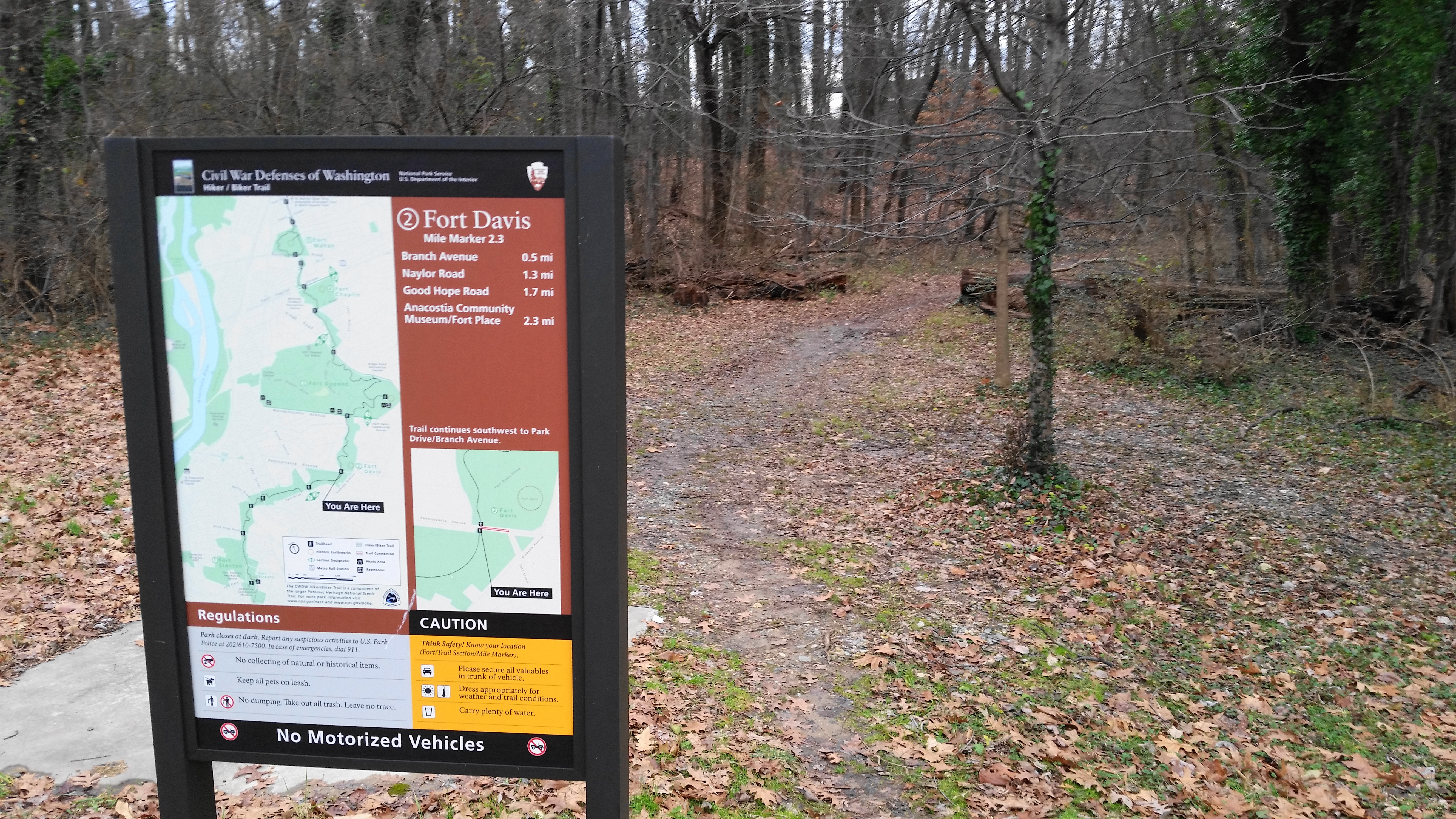 The trail in this section threads a small patch of woods in Fort Davis Park between Fort Davis Drive up to the left and residences down to the right. The route drops to cross a stream, followed by a second creek within 200 yards. Eventually the path climbs to a flat and crosses Pennsylvania Avenue, with a brief view of foliage-laden Fort Davis off to the left. This small post hosted eleven guns and a mortar and acted as an outer defense for Washington.