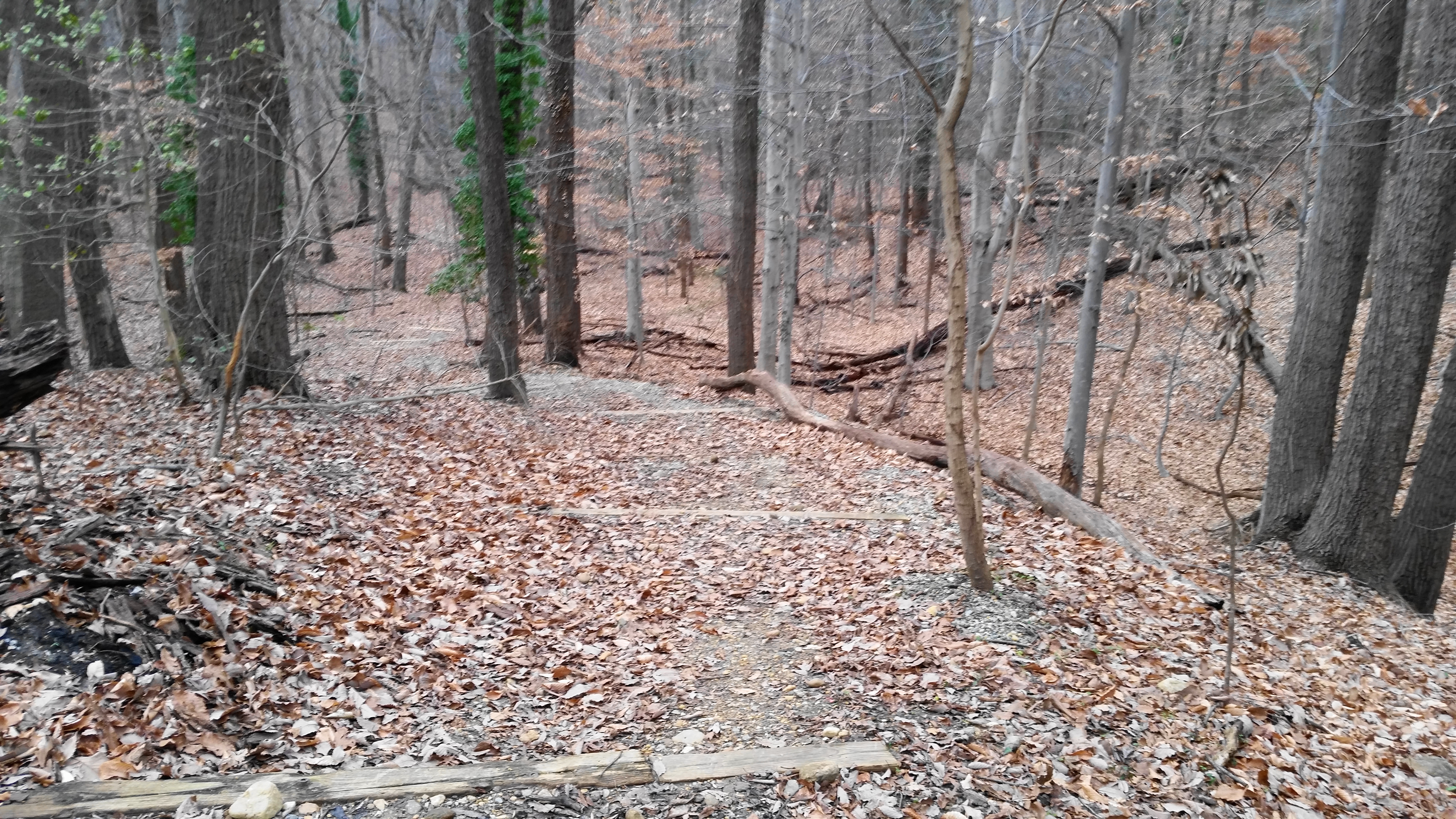 Now bearing east, the trail drops steeply to clear a creek bed, then climbs again and crosses a larger stream. From here the path cuts sharply back to the west, clearing the ravine and returning to the high slopes. (Note: The primary trail map from the National Park Service shows a spur trail heading south from here to the Historic Earthworks Picnic Area at Fort Dupont. This is inaccurate; the spur is situated further along the trail.)