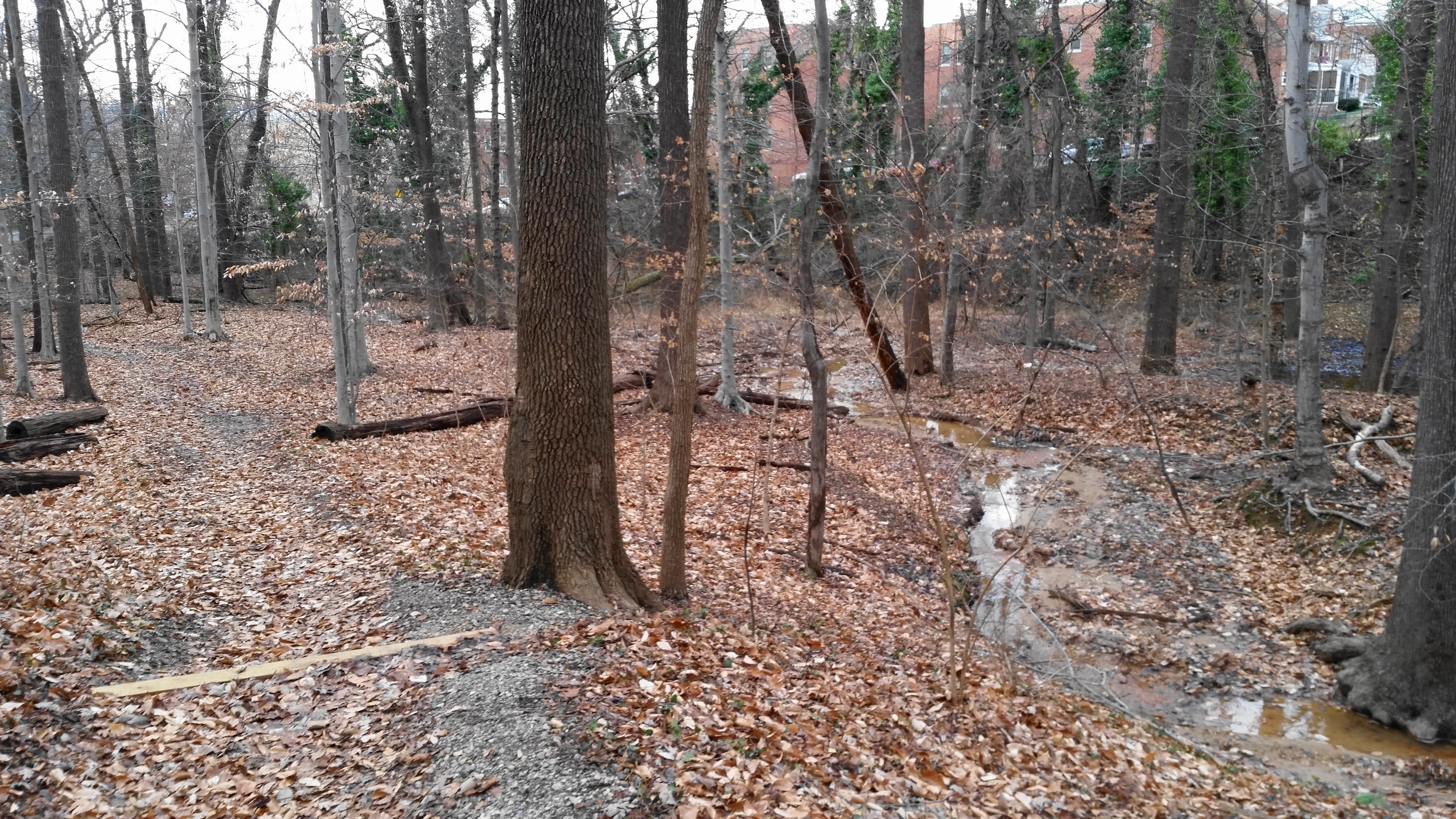 Returning to the main trail, bear left and follow the winding path as it drops to clear a wooden bridge. Then the trail bears uphill again and weaves southwest to meet Massachusetts Avenue. Traverse the road using the crosswalk here, briefly returning to the woods before emerging again at Fort Davis Drive. The tread on the opposite side is briefly paved as it remains out in the open before returning eventually again to dirt.