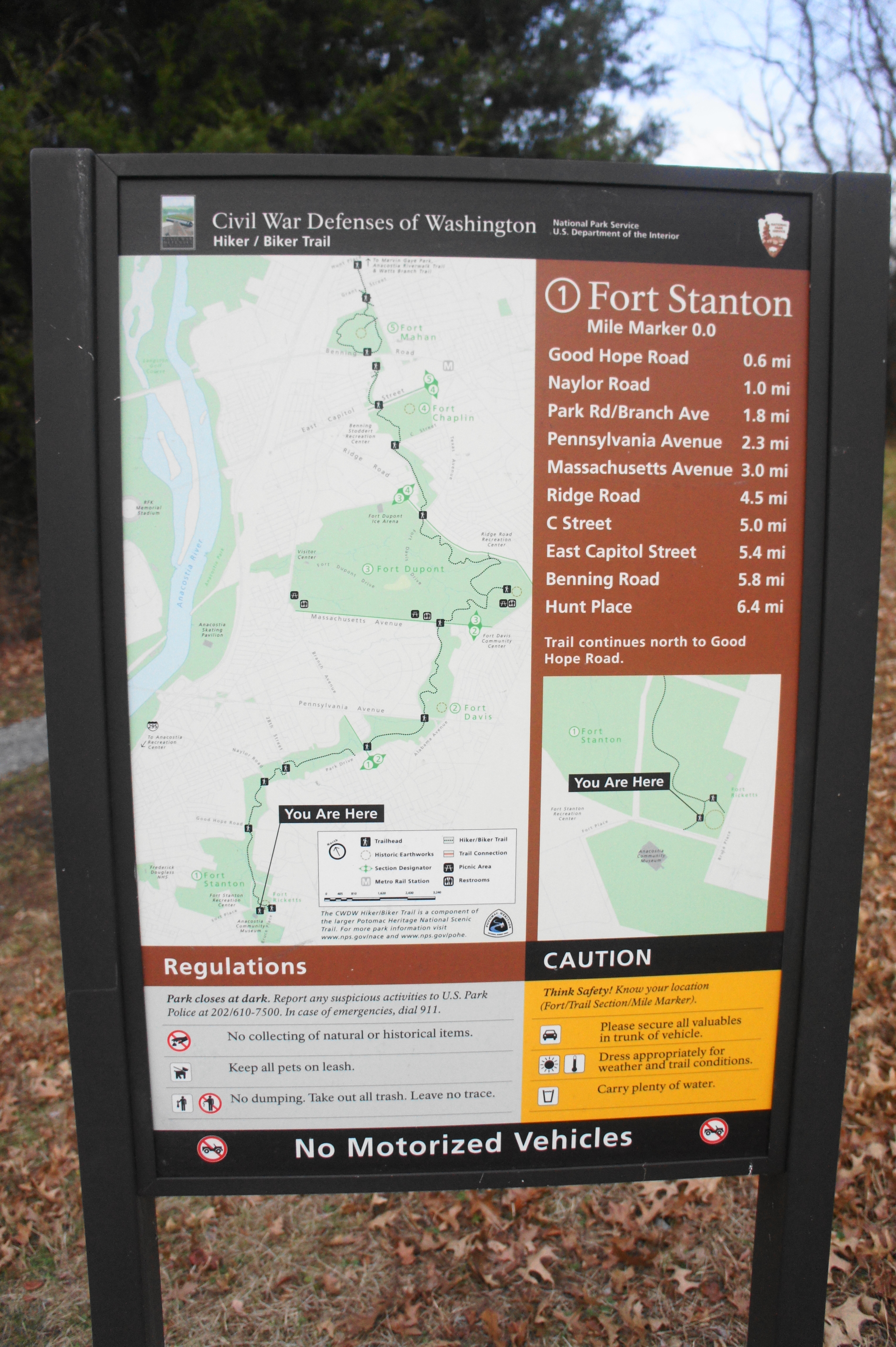 The Fort Circle Park Hiker-Biker Trail is part of a broader network of trails and bike routes surrounding Washington, DC that provide access to the Civil War Defenses of Washington, a ring of Civil War era fortifications. Situated east of the Anacostia River, the 6.2-mile stretch described below—unlike the rest of the larger trail network—comprises almost entirely true hiking trails through the woods, making it a more pleasant experience than tracing the sidewalks along the bustling roads of the city. Hikers are never too far away from development, however, as the hike crosses a dozen different streets and weaves through residential neighborhoods. The highlights are the relative peace and quiet of Fort Dupont Park and short spurs to six Civil War defenses: Fort Mahan, Fort Chaplin, Fort Dupont, Fort Davis, Fort Stanton, and Battery Ricketts. A principal advantage of the hike is its accessibility by Metro: the below description covers the hike from north to south, starting at Minnesota Avenue Metro station in Northeast and ending at the Anacostia Metro in Southeast DC. (Note: See here for a hiking guide by the National Park Service.)