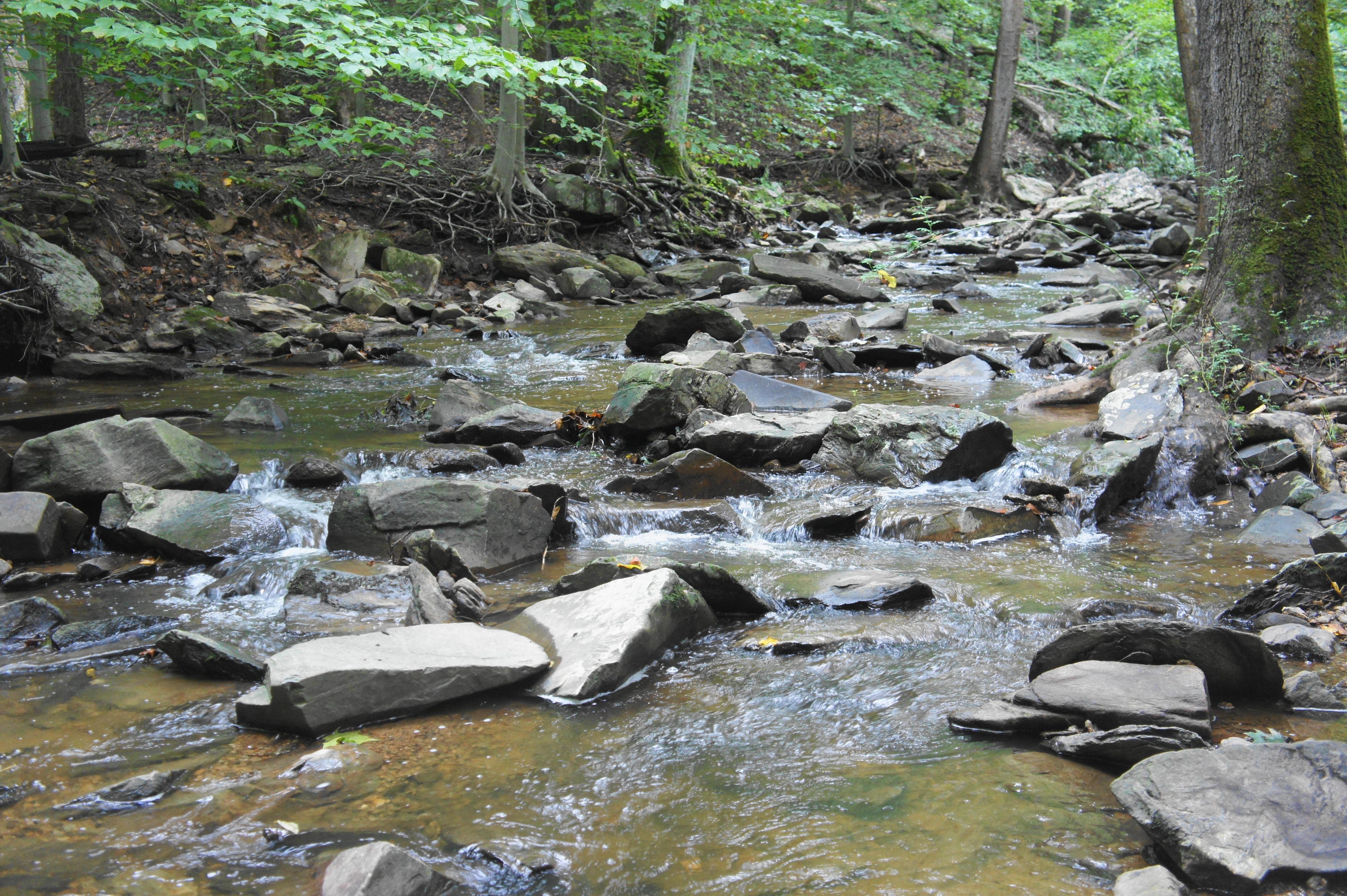 After leaving the road, the wide but root-laden trail bears west into the forest, with Mine Run appearing almost right away on the left. Hikers can also see a boggy depression on the right, filled with water—this is Clay Pond. Within 1/10 mile, the trail runs right up to the banks of Mine Run, which gently cascades through the greywacke.