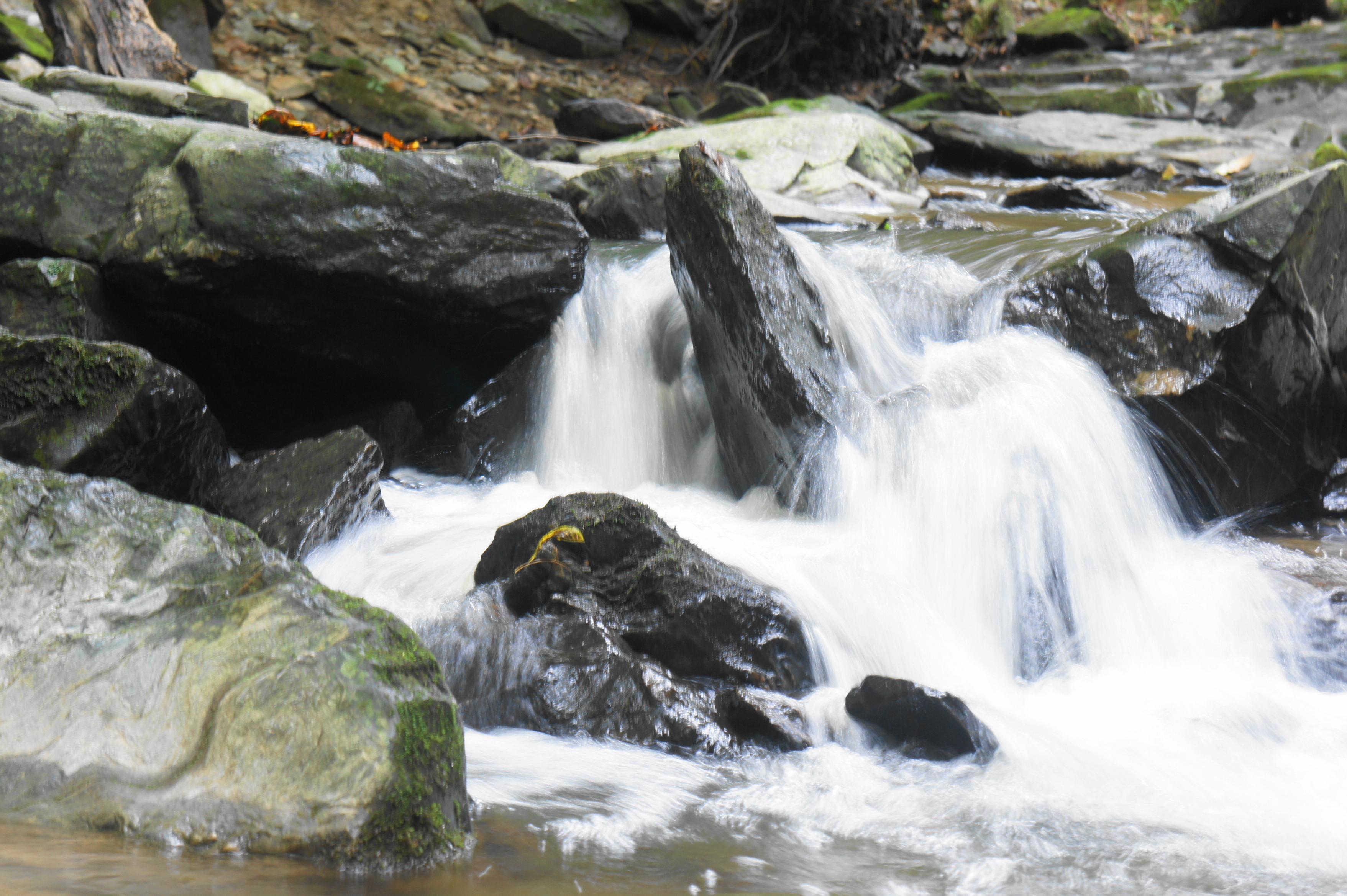 Upstream from this point, the path suddenly climbs, then approaches some steeper drops on Mine Run on the left. Around 300 yards into the hike, the path bends north, leaving Mine Run behind. However, a well-worn social trail on the left leads to the best scenery of the hike: a beautifully cascading slide of water, blighted only by the sight of a road overpass upstream.