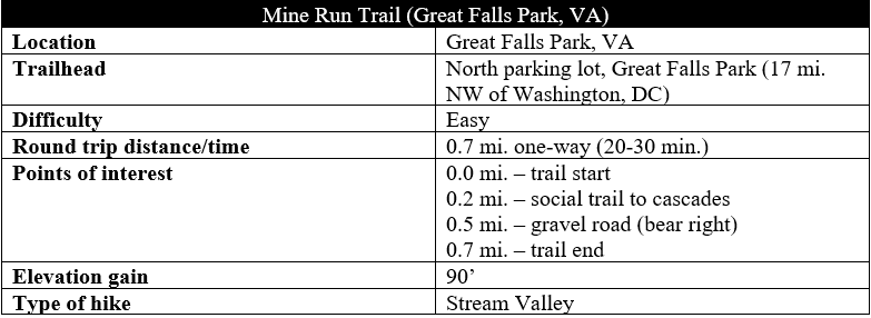 The Mine Run Trail is technically a one-way track, but a loop can easily be formed. Start the hike at the signed trailhead, situated virtually halfway between the north and south parking areas at Great Falls Park, roughly a ¼-mile walk up the length of the southern parking lot from the Great Falls Visitor Center.