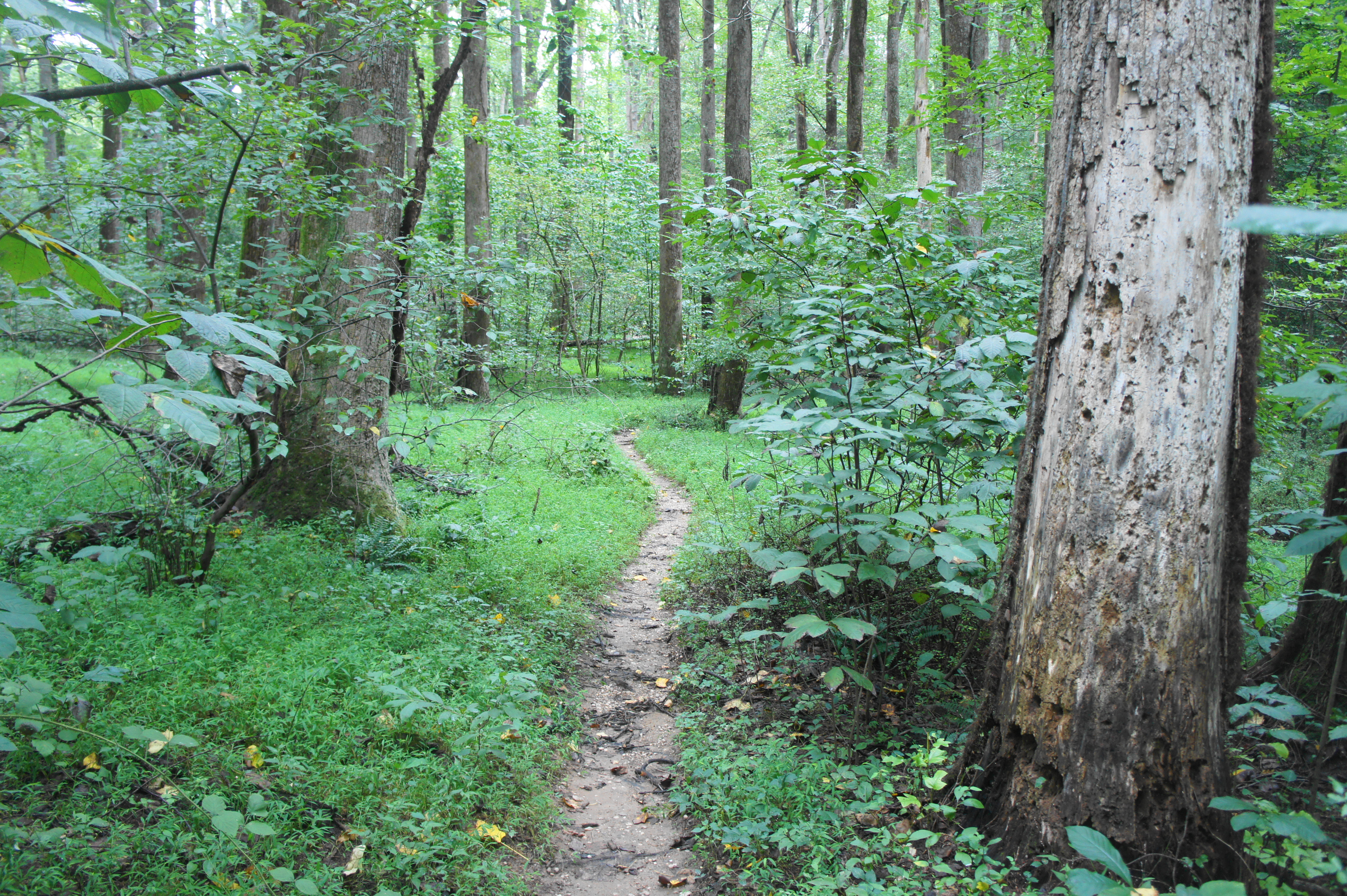 Patches of verdant undergrowth are interspersed with relatively barren earth as the trail bobs up and down, bearing west toward the edge of the park. The trail climbs out of the woods suddenly at about the 7/10-mile mark, running under a set of power lines and approaching Riverbend Road, the terminus of the short path.