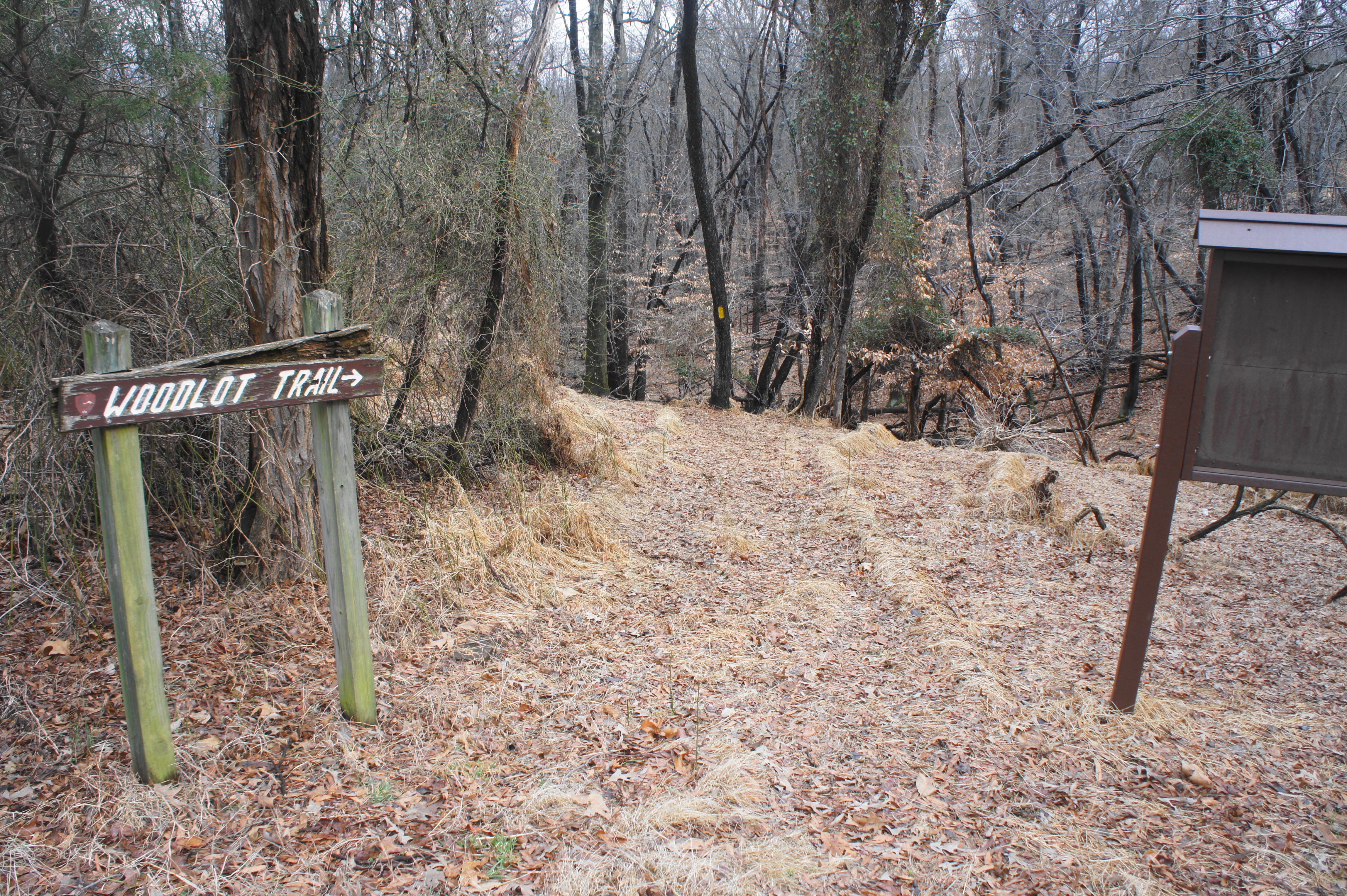 To access the Woodlot Trail, walk from the parking lot roughly ¼ mile to the Visitor Center. Then, upon exiting the building, bear left and follow the path as it winds westward, taking the second left. Continue down the gravel road until it enters the woods; the marked trail begins on your right.