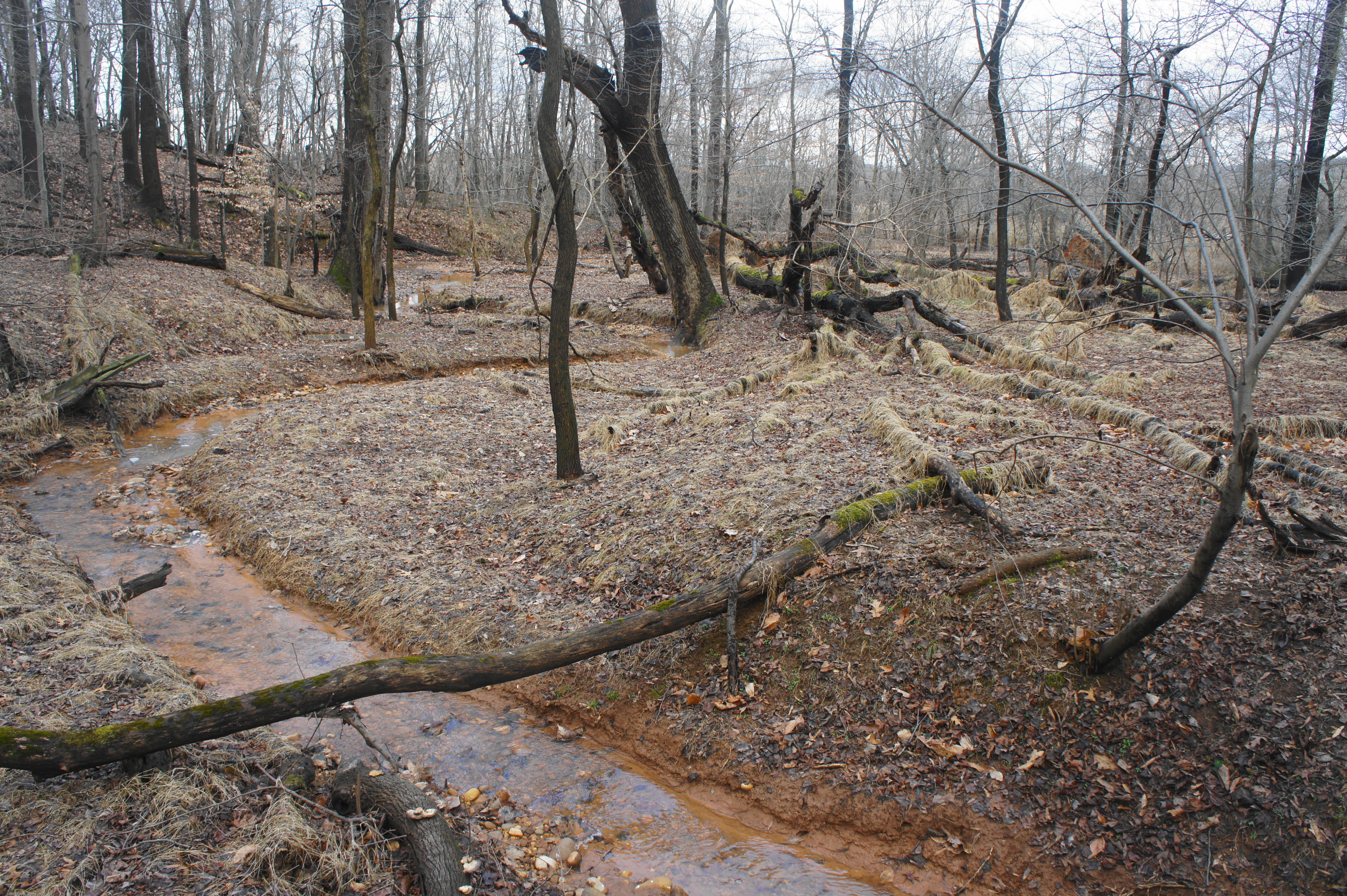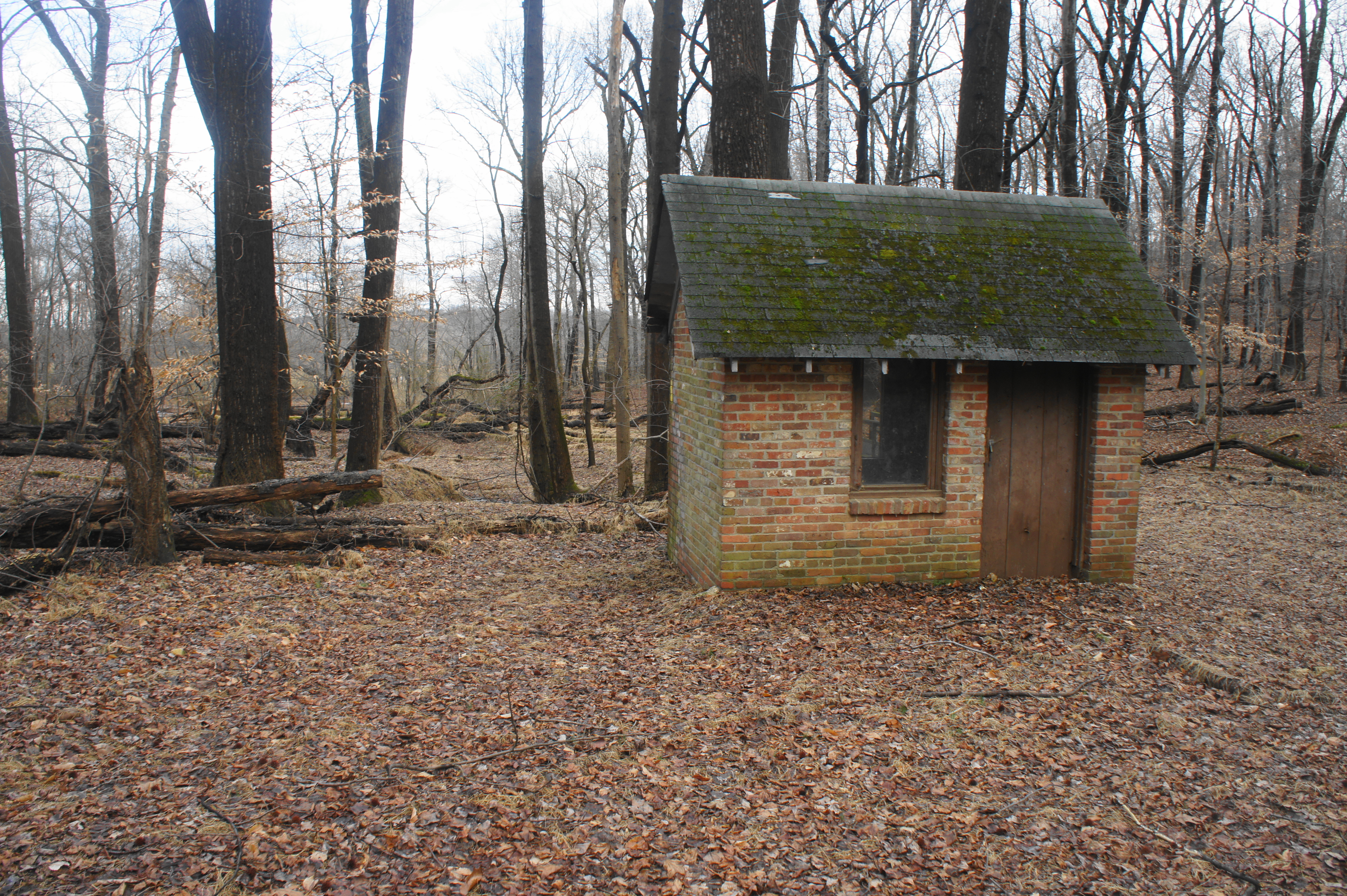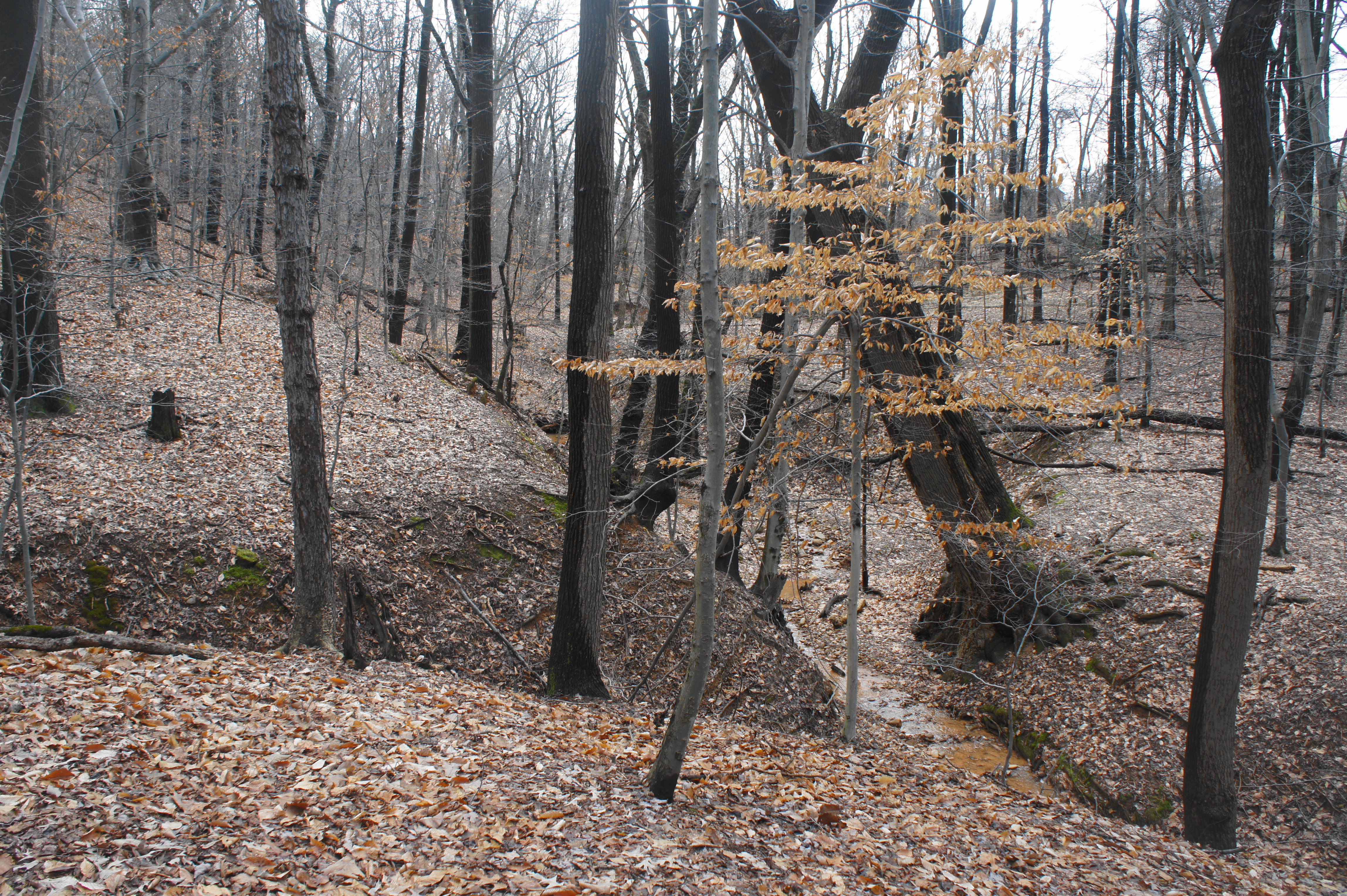 From the gravel road, the Woodlot Trail drops sharply, a rapid change from the level stroll through Oxon Hill Farm. Fallen leaves congregate here in masses in the late autumn and winter, making for a potentially slippery descent. Within about 150 yards, the trail levels off as the dipping ravine gives way to a relatively flat basin. The yellow-blazed path passes a small and unused brick structure on the left and then crosses an unnamed but perennial stream, the primary natural centerpiece of the hike.