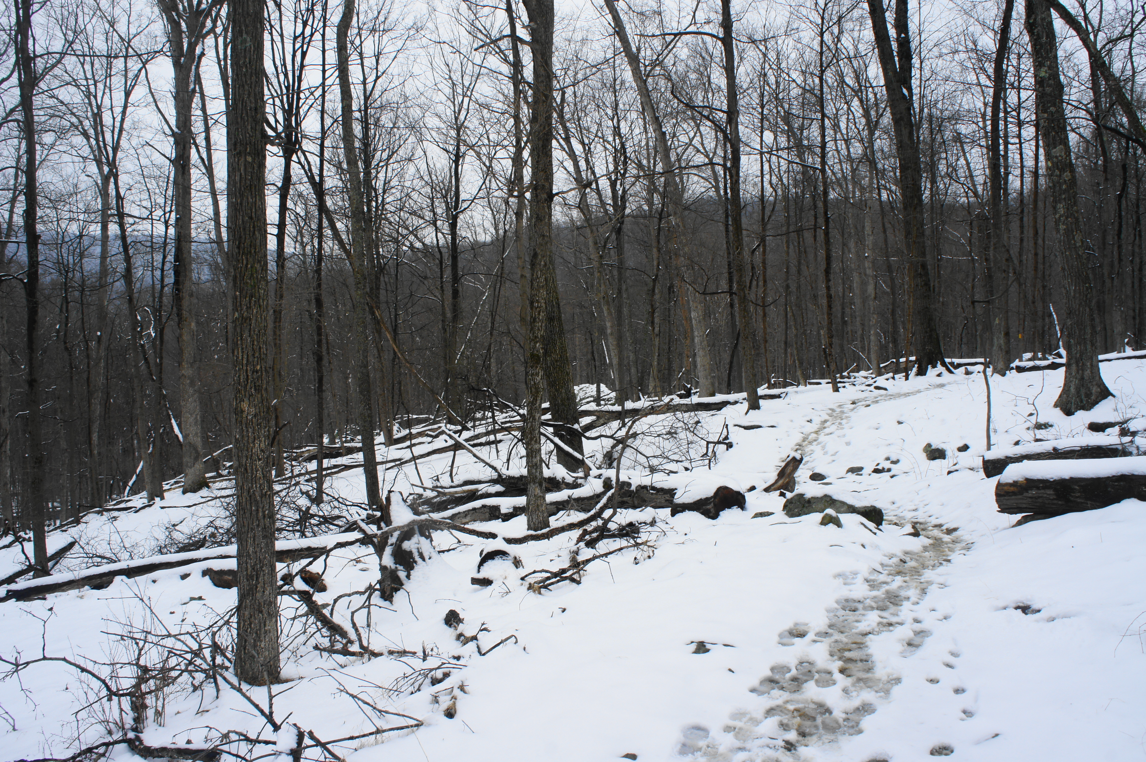 Begin this relatively short but steep hike from the overflow parking area across Park Central Road from the Visitor Center in Catoctin Mountain Park. (Note: As of March 2019, this parking lot was closed for construction, but there was other parking available at the Visitor Center.) From the parking area, walk north on a wide trail before reaching a fork; a short trail to the Blue Blazes Whiskey Still heads right, while the orange blazes lead left to Cunningham Falls.