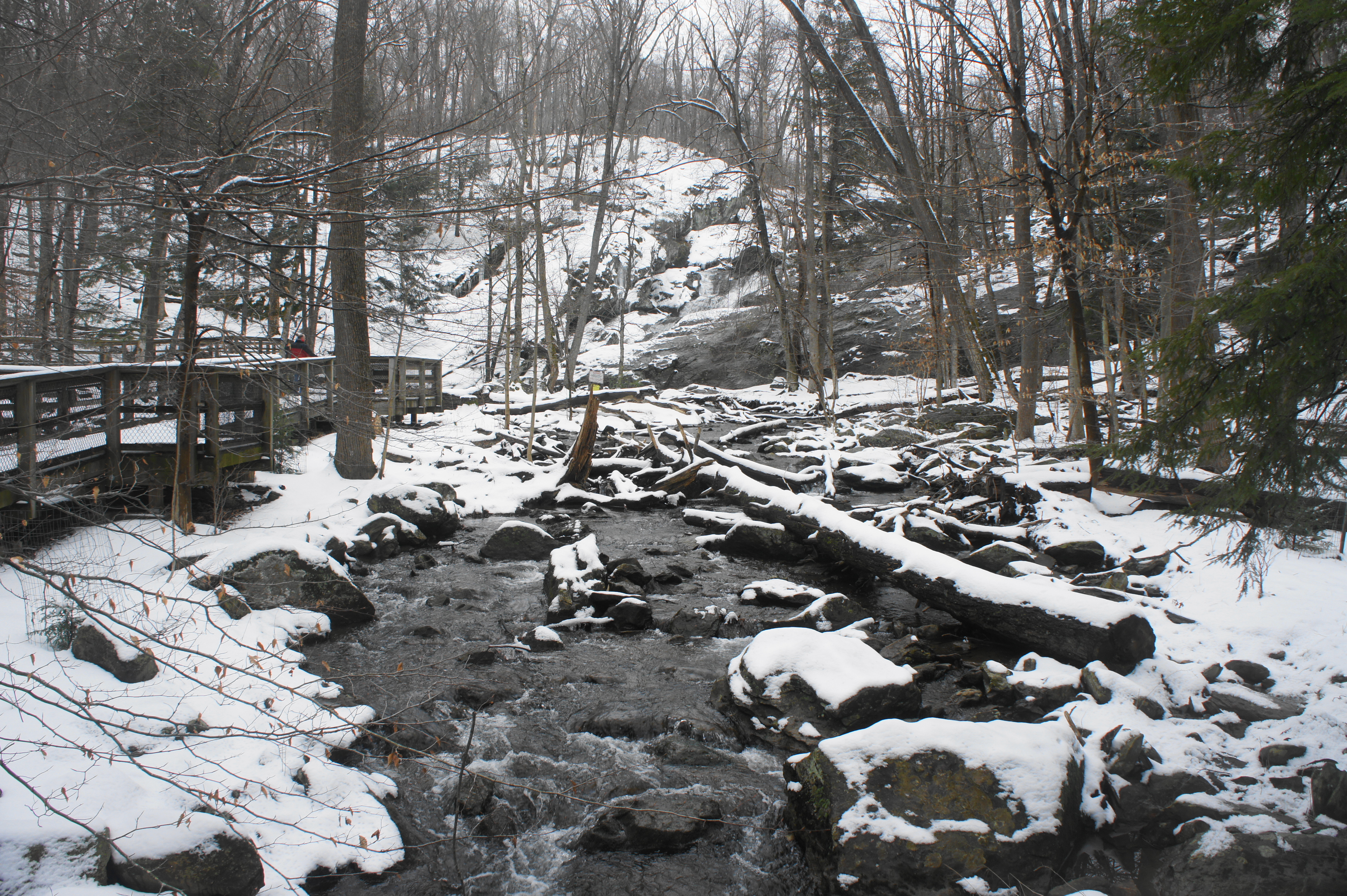 While not quite as good as the vista from the adjacent boardwalk on the state park side, it is still possible to see the cascading waters as they leap down the grey greenstone. Warning signs discourage visitors from approaching the falls, but a couple of benches at the end of the boardwalk offer a place to sit and admire the waterfall.