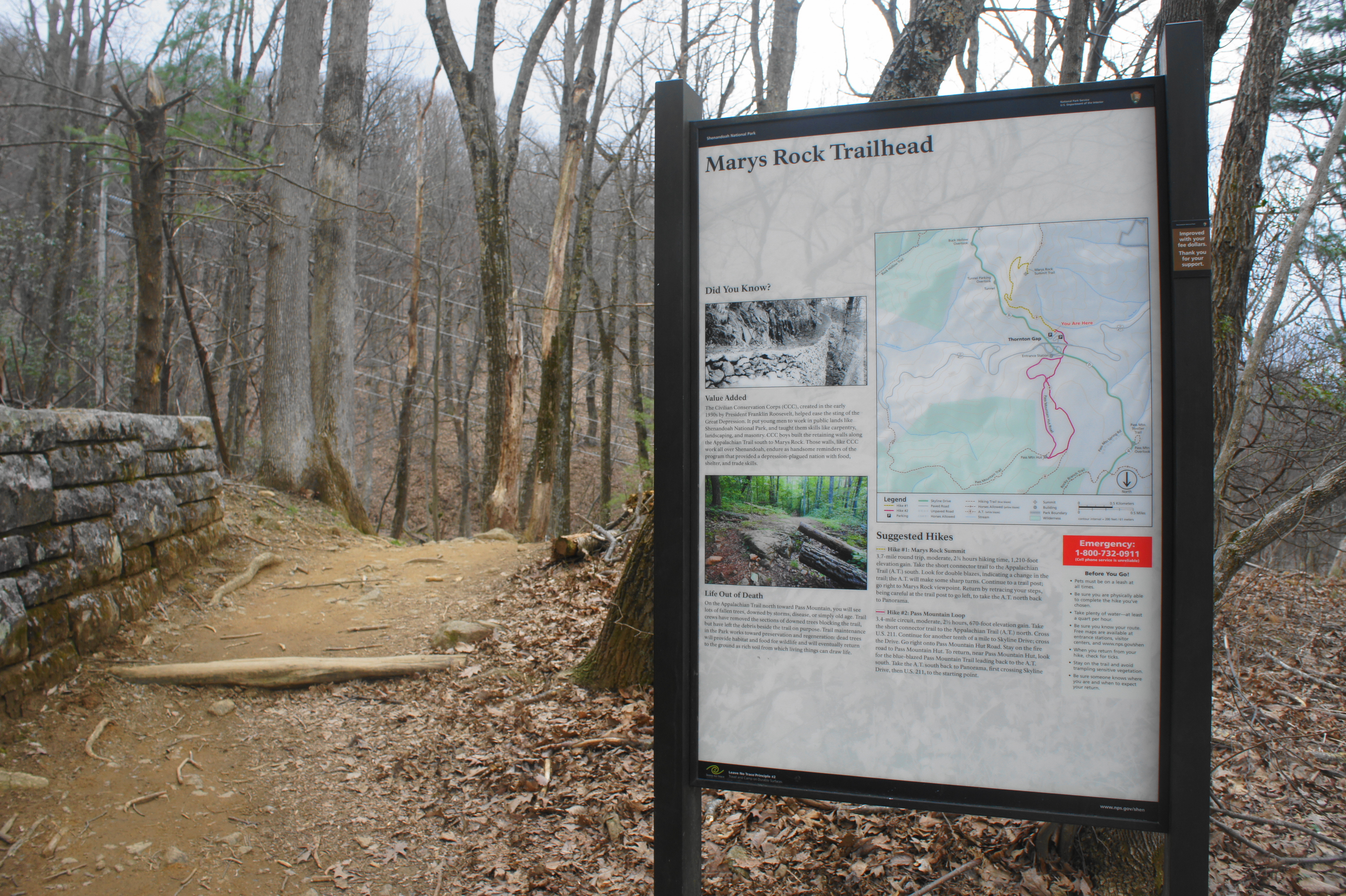 From Panorama, look for the start of the trail to Marys Rock at the far southern end of the parking lot: a tall informational sign provides a brief description and map of the hike, as well as others in the area. The summary calls for 2 ¾ hours to complete the round trip, but many fit hikers can complete the out-and-back in less than two hours, while others who want to take their time climbing—or relaxing at the top—may want to allot at least three hours in total.