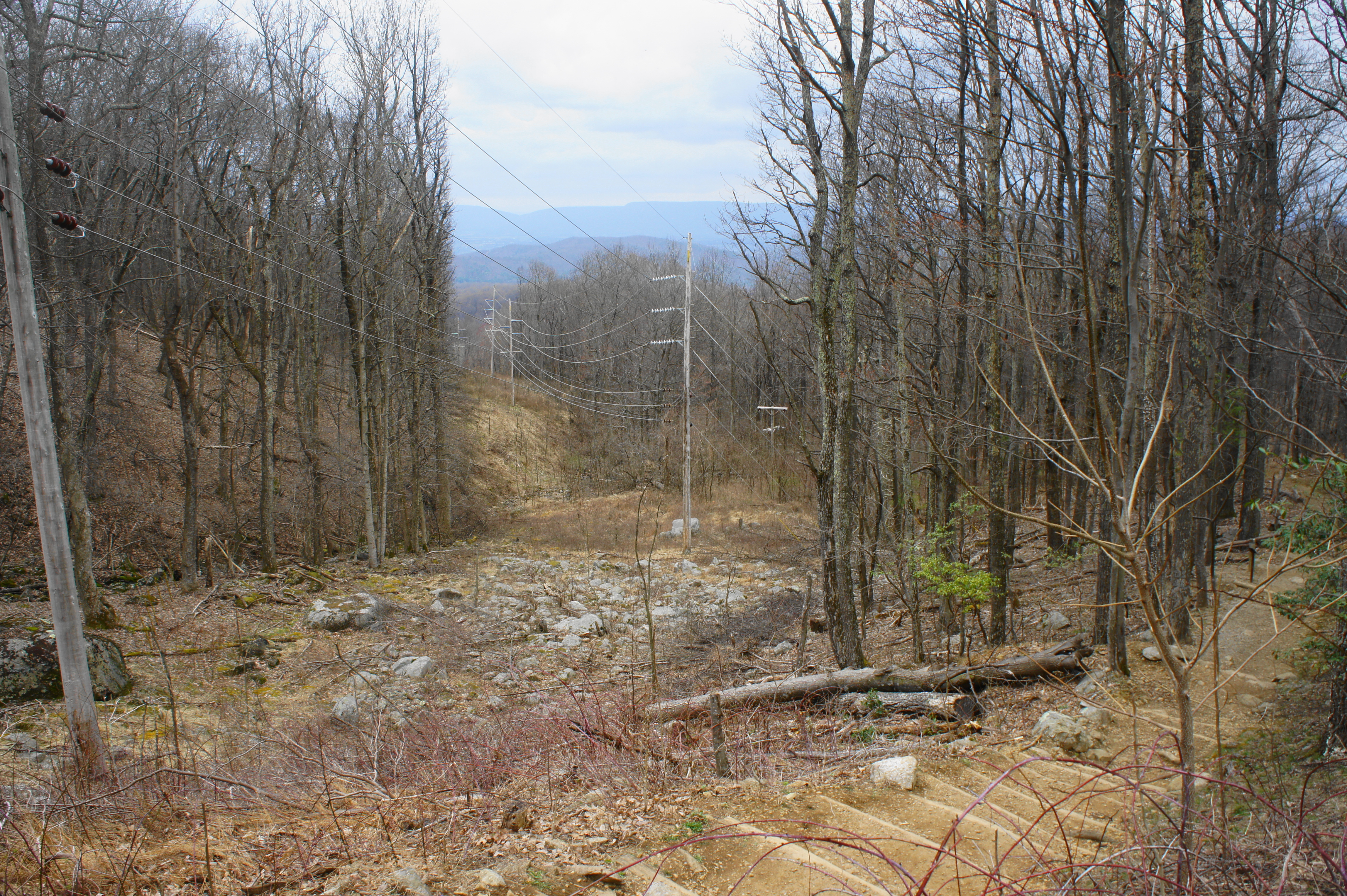 The wide and well-trodden route begins as a simple connector path, meeting up with the famed Appalachian Trail (AT) after just seconds of walking. Bear left on the AT as it briefly parallels a set of power lines and climbs a dozen wooden stairs—a warm-up for the climbing to come. As hikers round the first switchback, they can catch a brief view of distant peaks through the tree cut for the power lines. A minute later, the trail switches back again, to the right. Passing under the power lines, the views improve further.