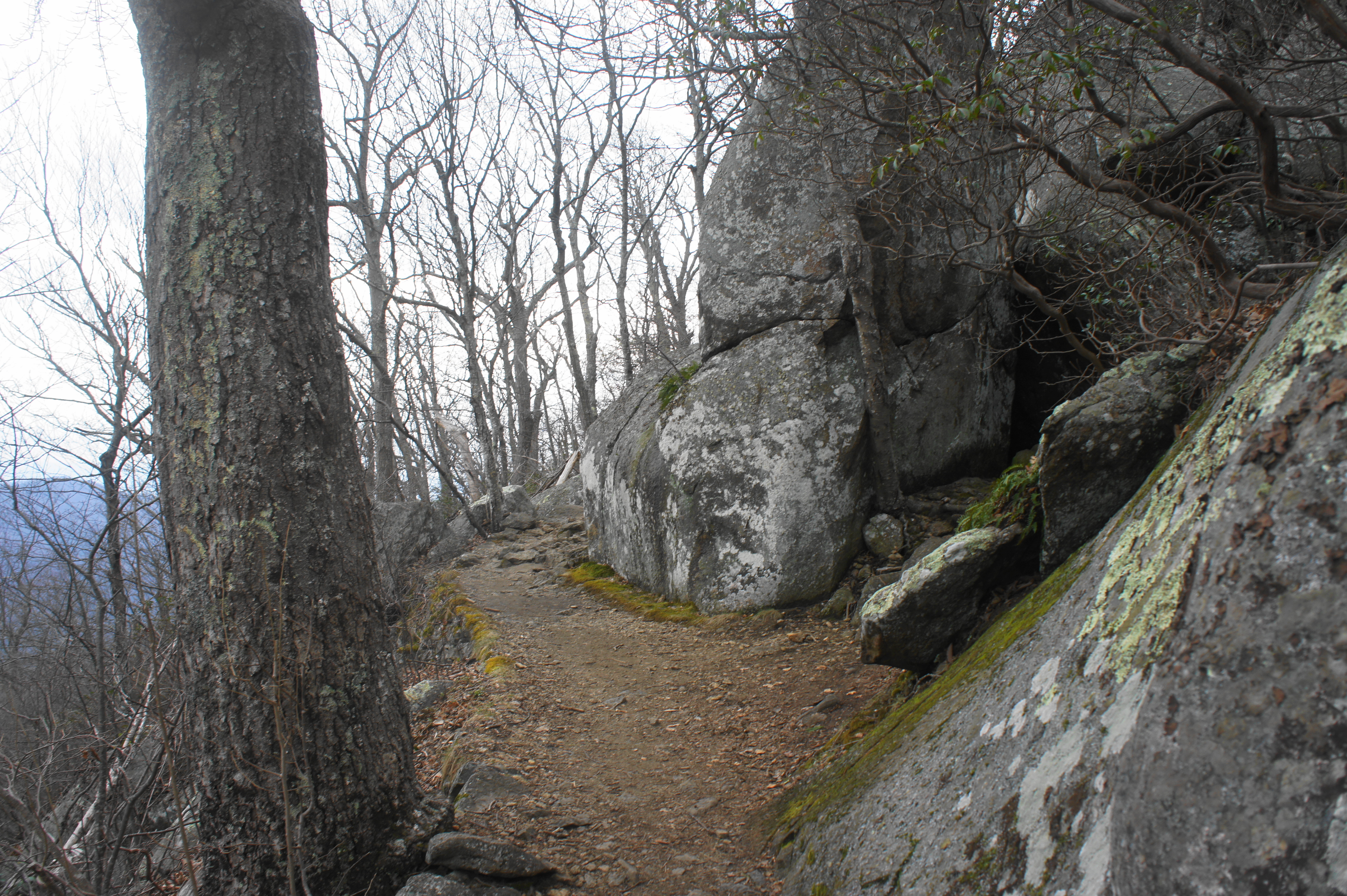 Just beyond this section, hikers approach a collection of mammoth-sized rock monoliths on the right. While much of the Blue Ridge Mountains is composed of Catoctin greenstone, a metamorphic rock, the tops of Marys Rock include patches of igneous granite formations.
