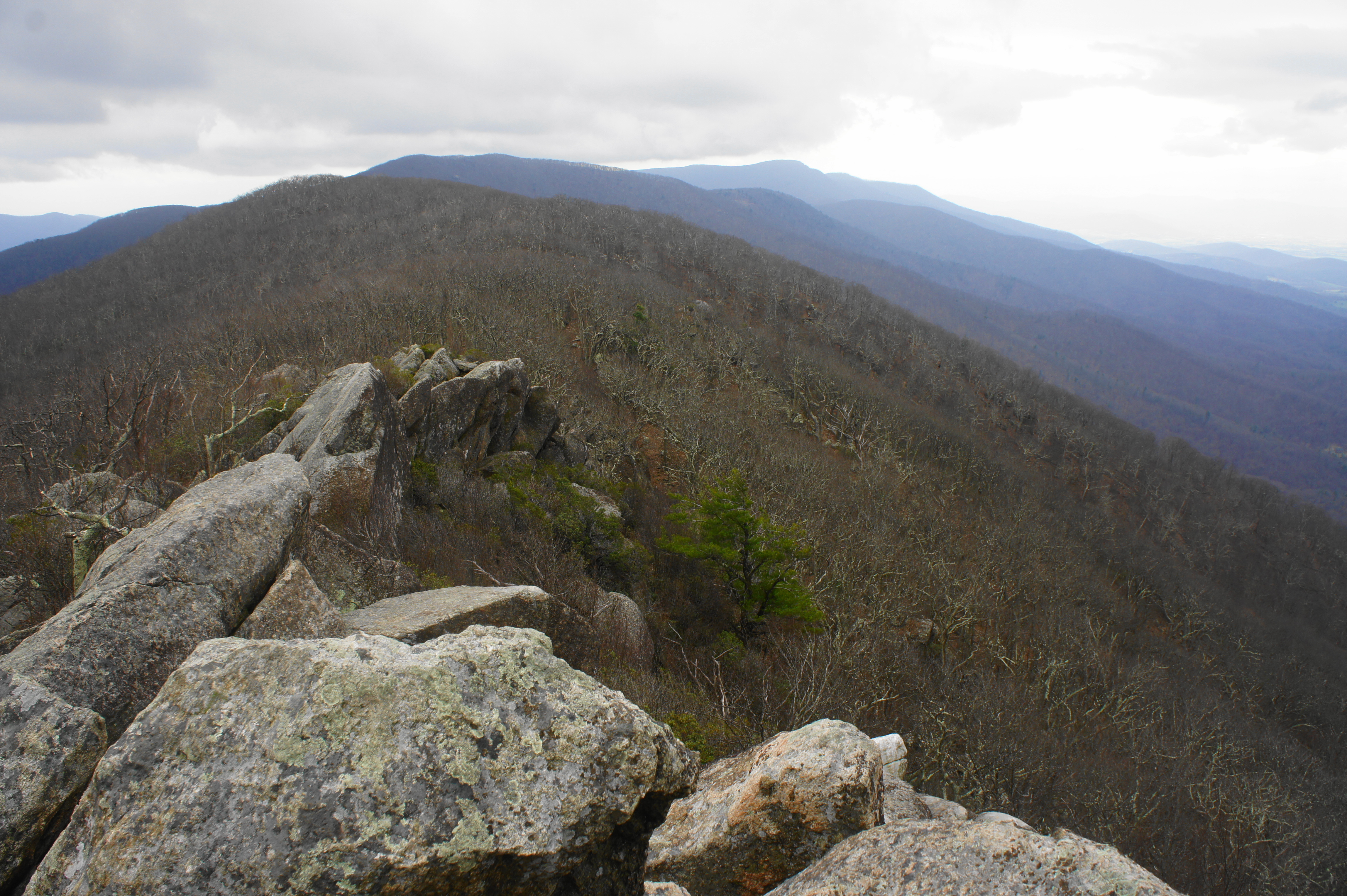 Climb the fin at the viewpoint for views to the south: here an even higher point on Marys Rock reveals itself—a short walk, but difficult climb, away. This is the true summit. Beyond, one can see a stretch of peaks in Shenandoah’s Central District, from The Pinnacle (3,730’) to Stony Man Mountain (4,011’) to Hawksbill (4,050’). The shadowy, rugged peak to the left of Stony Man is the famed Old Rag Mountain (3,268’).