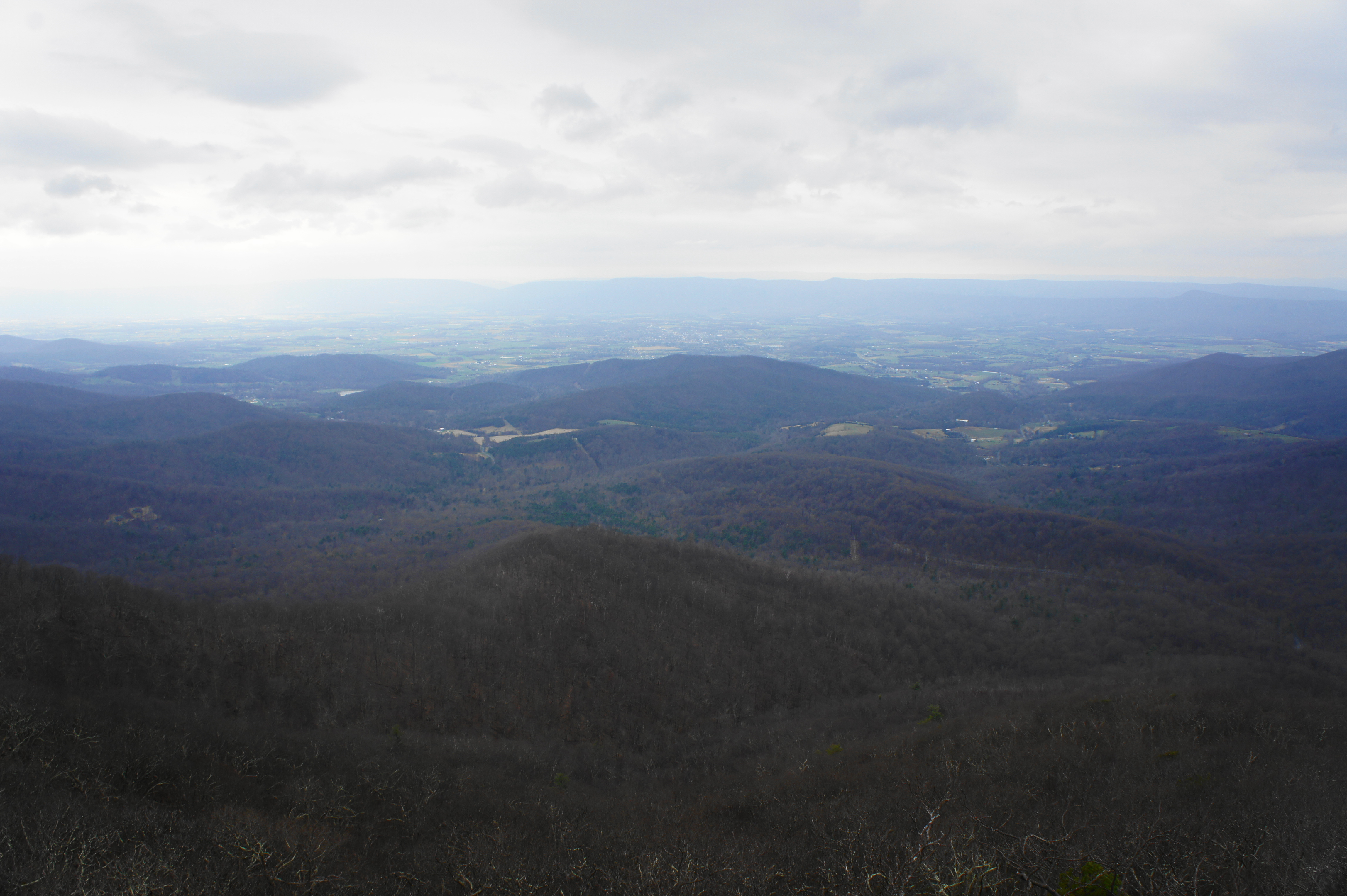 The views to the west and east reveal foothills that give way to a patchwork of farms and fields. The westward vista covers Shenandoah Valley (more precisely, Page Valley), with Massanutten Mountain and Great North Mountain beyond. To the east, the Appalachians come to a gradual end as a long plain leads toward the Potomac and Washington, DC.