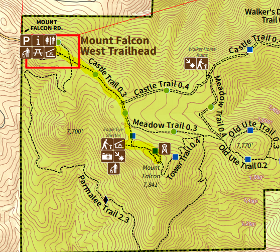Reaching Mount Falcon West Trailhead requires driving up a series of winding (but paved) roads to the inner flanks of Mount Falcon. The closest town is the dispersed, slopeside community of Indian Hills, situated off U.S. Route 285. Even at the trailhead in Mount Falcon Park, you have already crested about 7,200 feet, making for a relatively level approach to the summit of Mount Falcon.